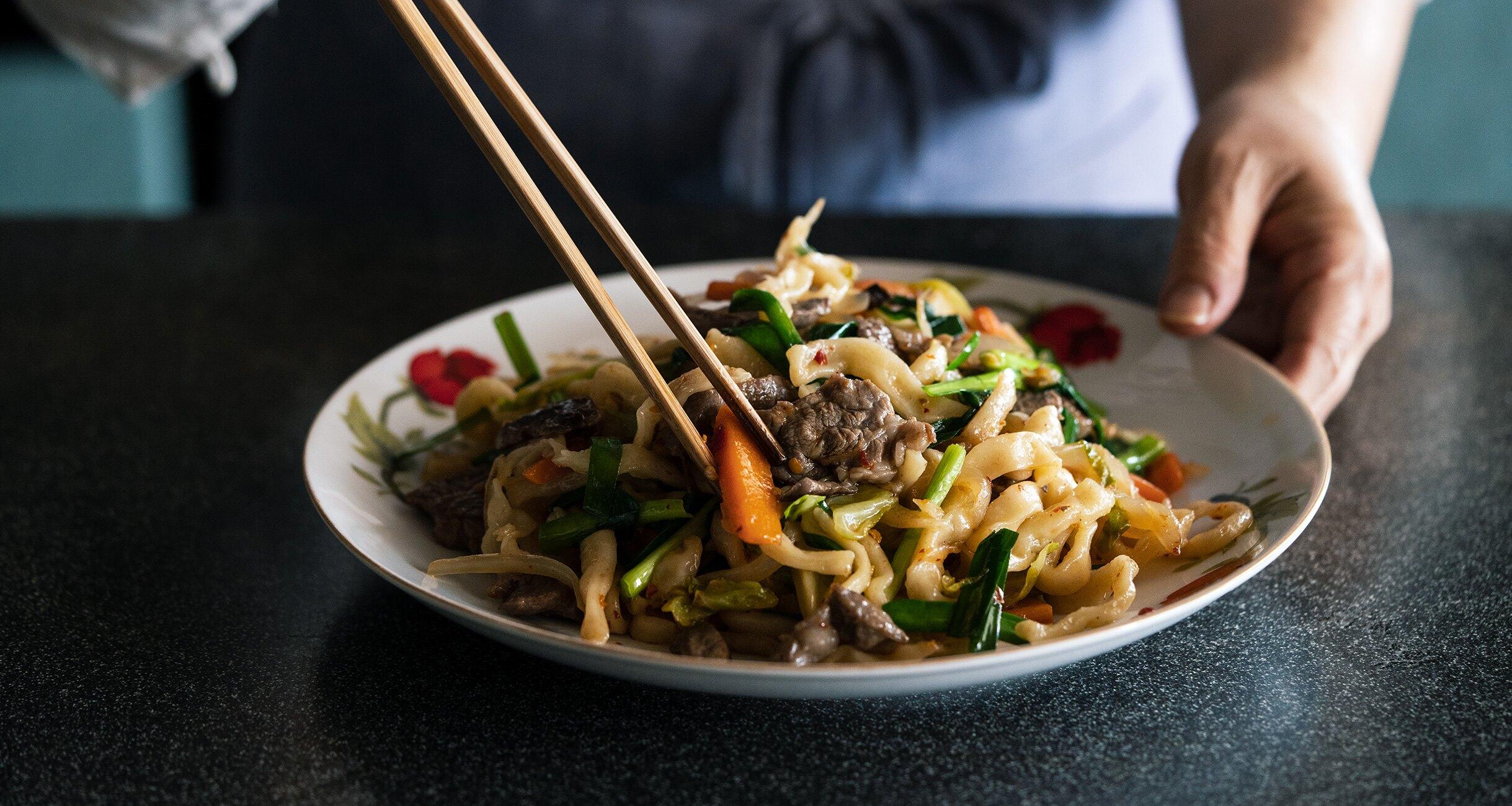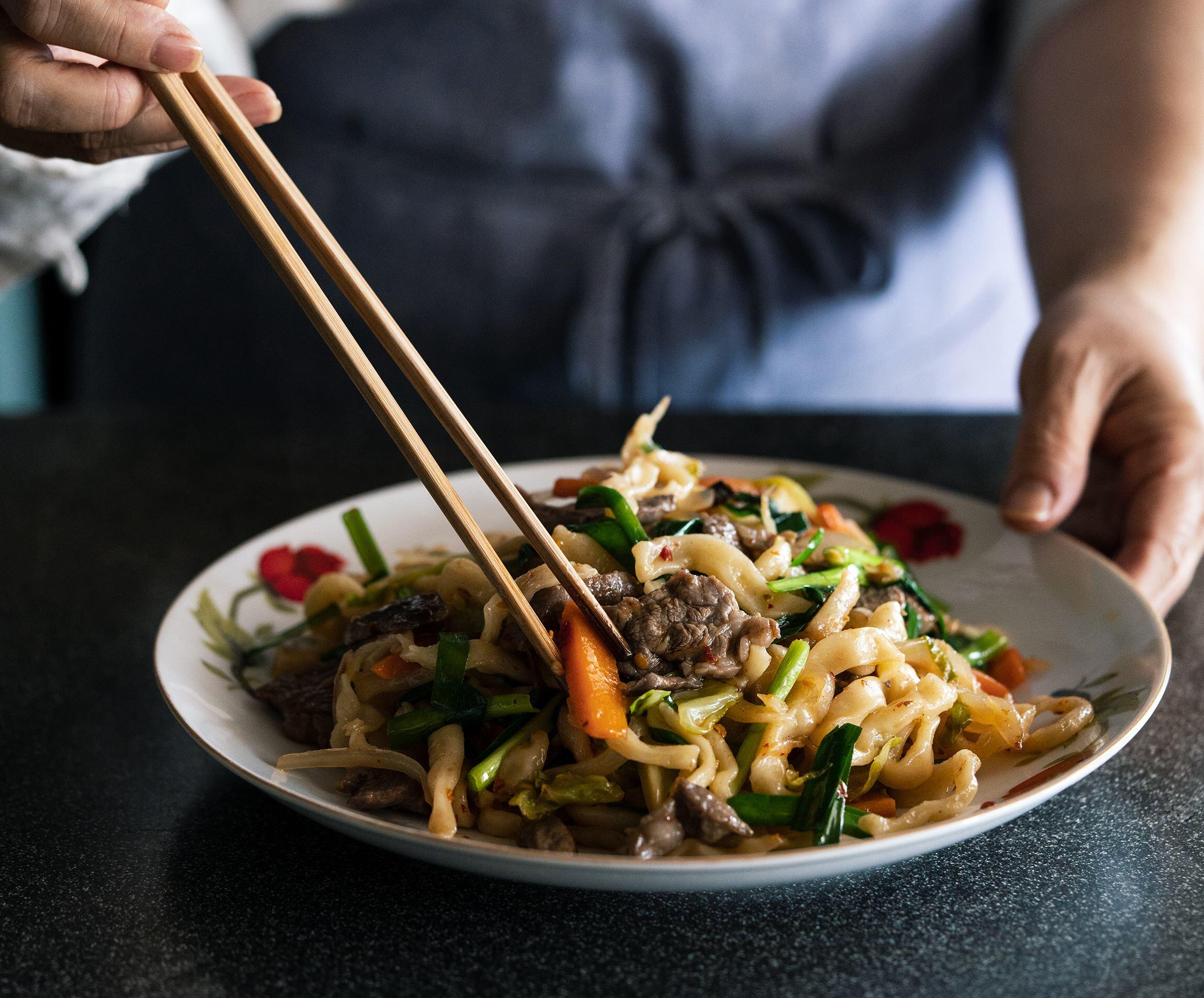 ツイヴァンという、モンゴルでポピュラーな焼き麺料理です。豆板醤の辛味が良いアクセントになります。料理研究家の荻野恭子さんから、日々役立つ調味料を習いました。