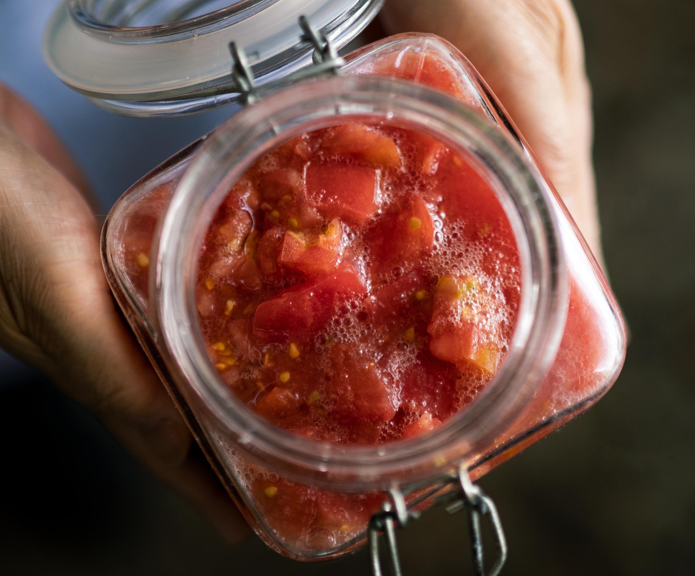 クリュはフランス語で“生”という意味。完熟のトマトを、皮も種もそのまま刻み、塩とほんの少しの砂糖を混ぜるだけの調味料です。料理研究家の荻野恭子さんから、日々役立つ調味料を習いました。