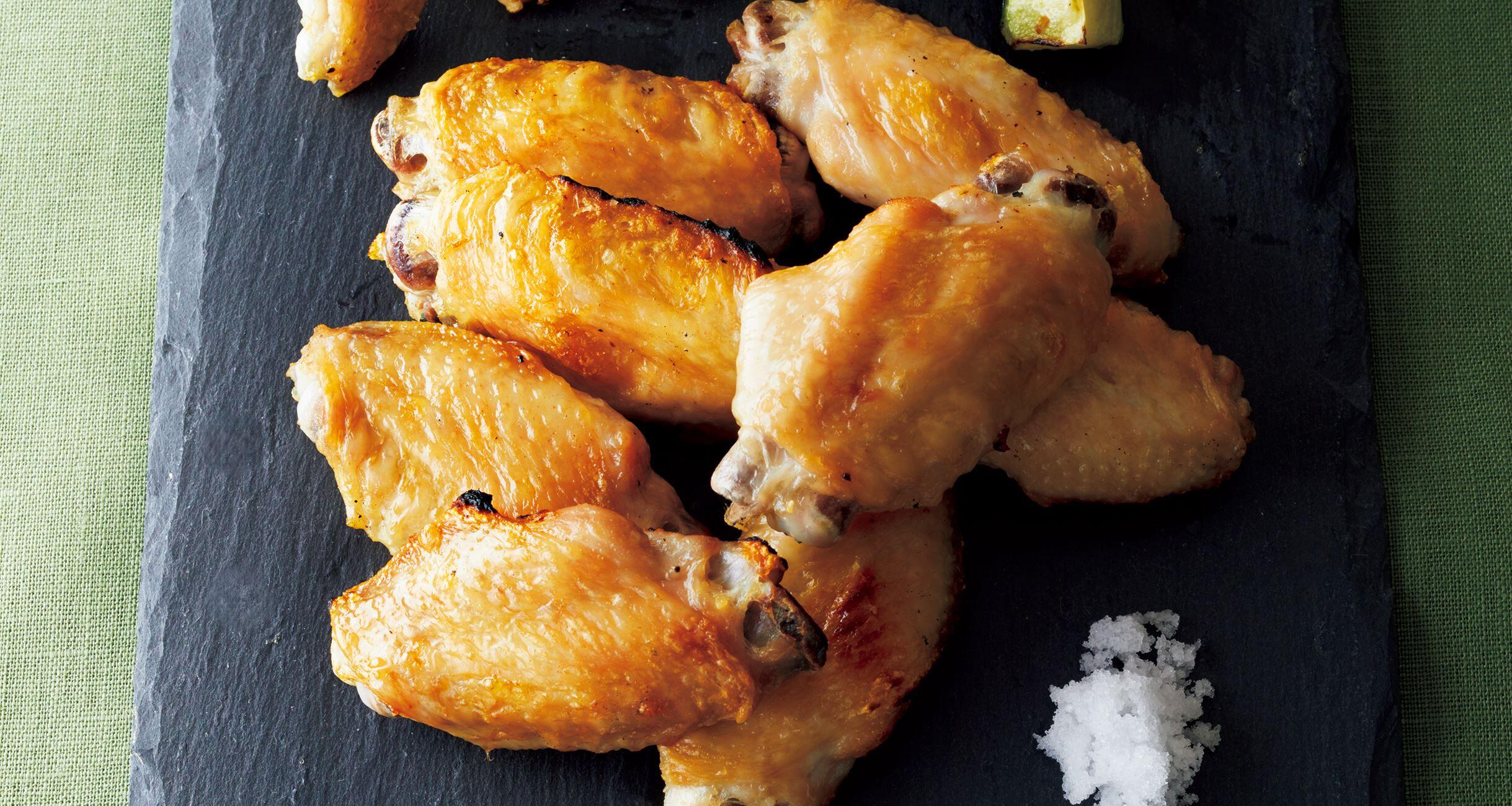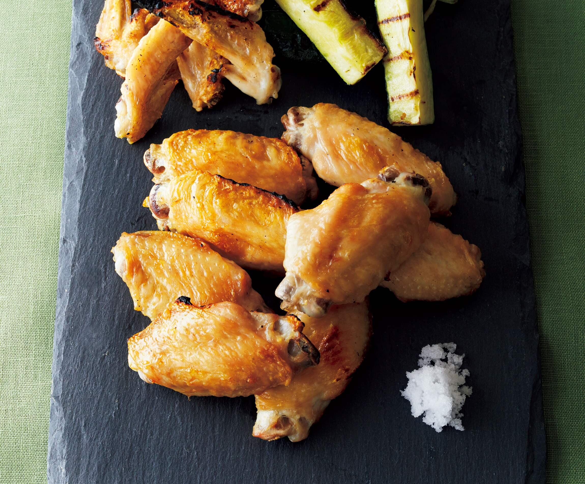 グリルを熱してズッキーニを並べ、強火で4~5分焼き、取り出す。続けて手羽先を並べて強火で7~8分、色よく焼く。器にズッキーニと盛り合わせ、塩を添える。