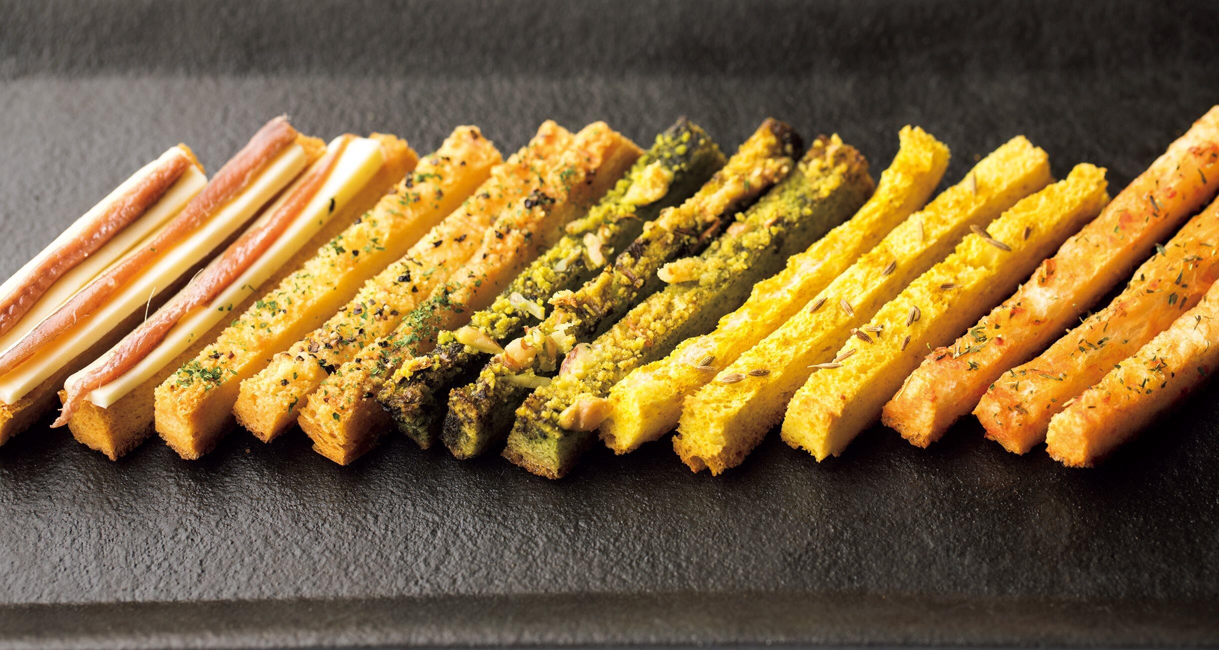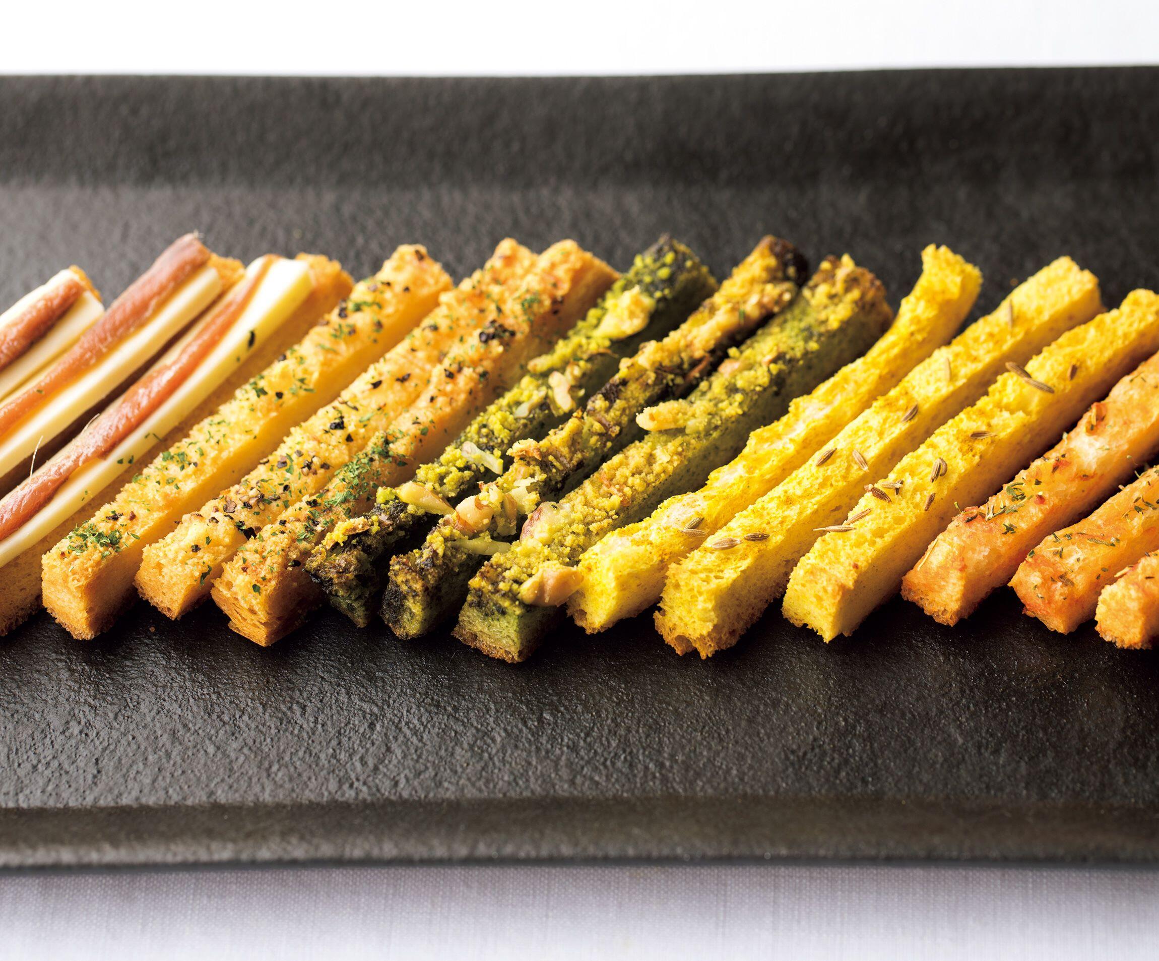 パンの“耳”を五つの味のおつまみに仕立てました。三つにはトマト、カレー、バジルのソースをしみ込ませ、スパイスで香りづけをします。残りの二つにはチーズやアンチョビバターをのせて。“耳”ワールドの楽しみが、ここから始まります。