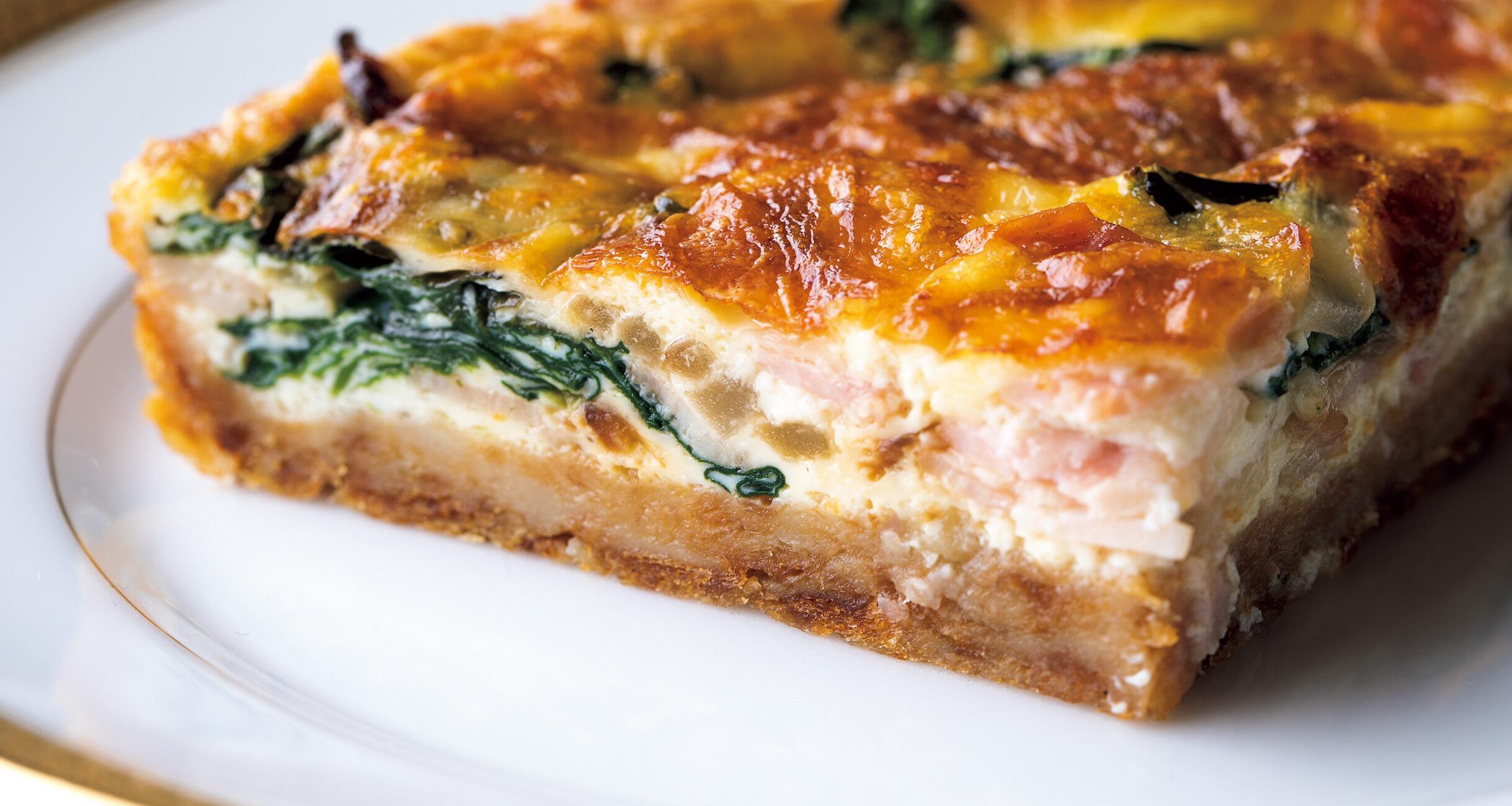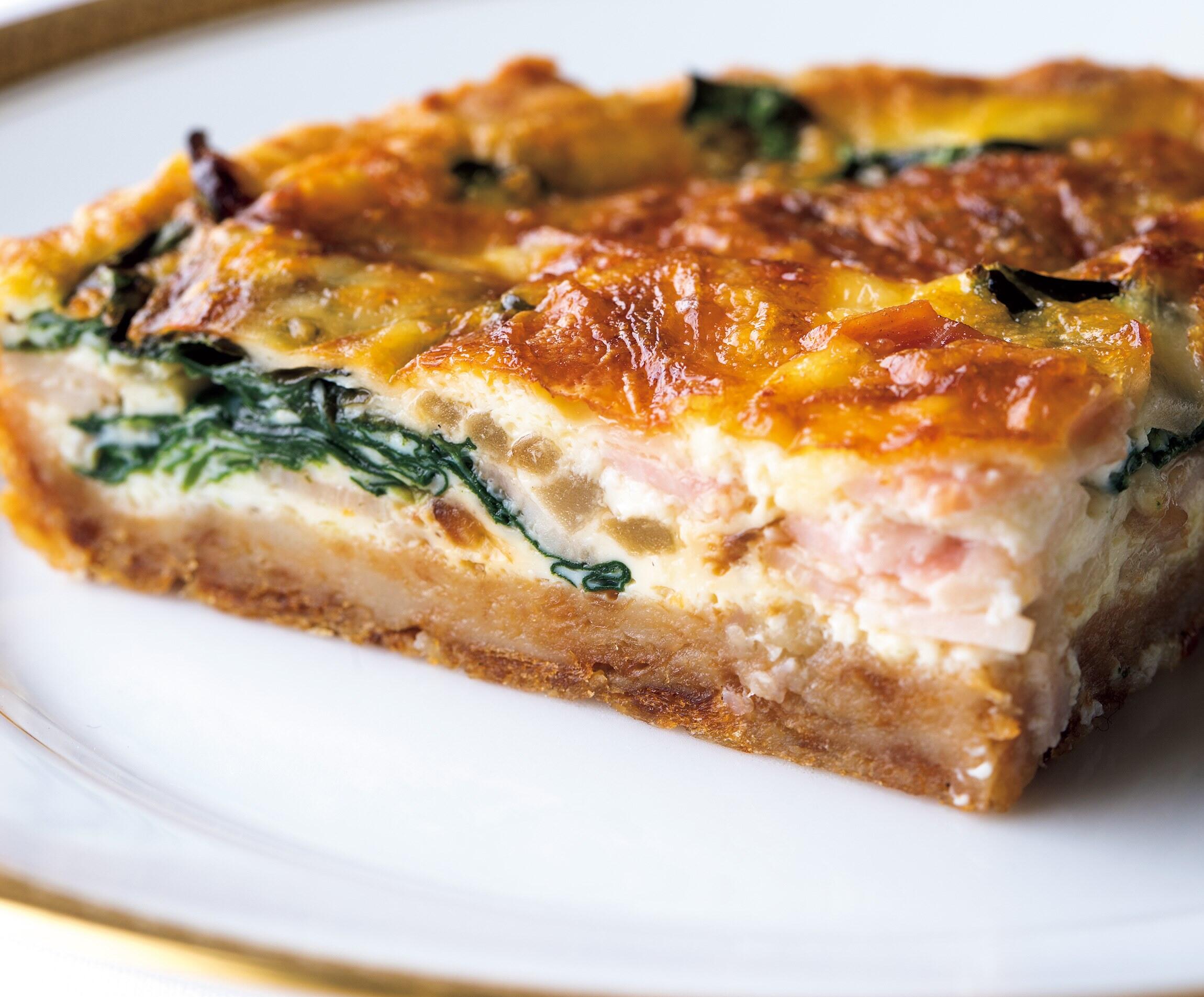 キッシュも食パンも、もとを辿れば小麦粉。ならば“耳”をちぎって水で戻し、バターで繋いでのばして。焼いても縮まない優秀な生地になりました。中にほうれん草とベーコン、玉ねぎを詰めたロレーヌ風キッシュです。