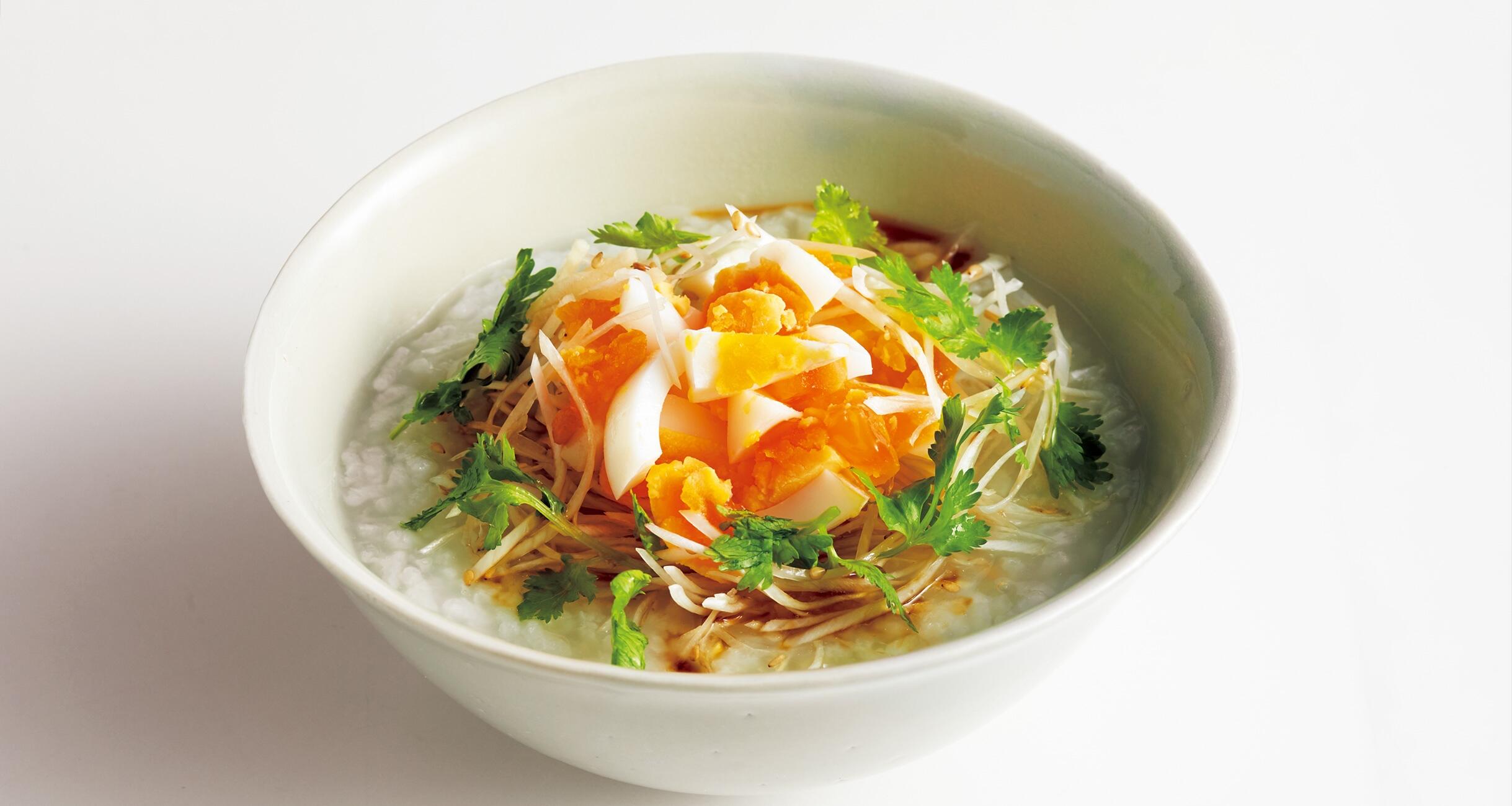 器におかゆを盛り、ねぎ、塩卵、生姜、香菜を盛って胡麻をふり、醤油、胡麻油をかける。