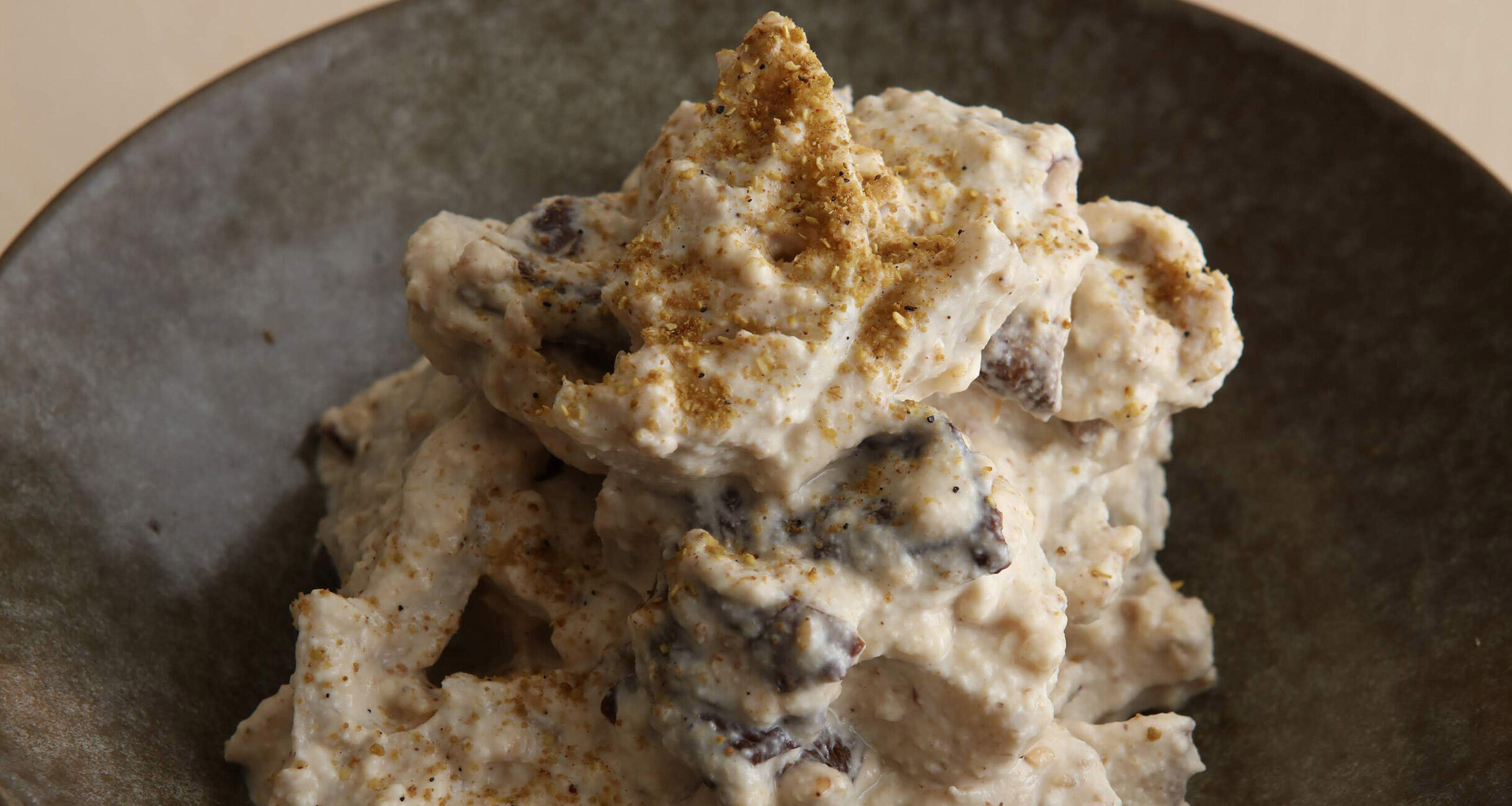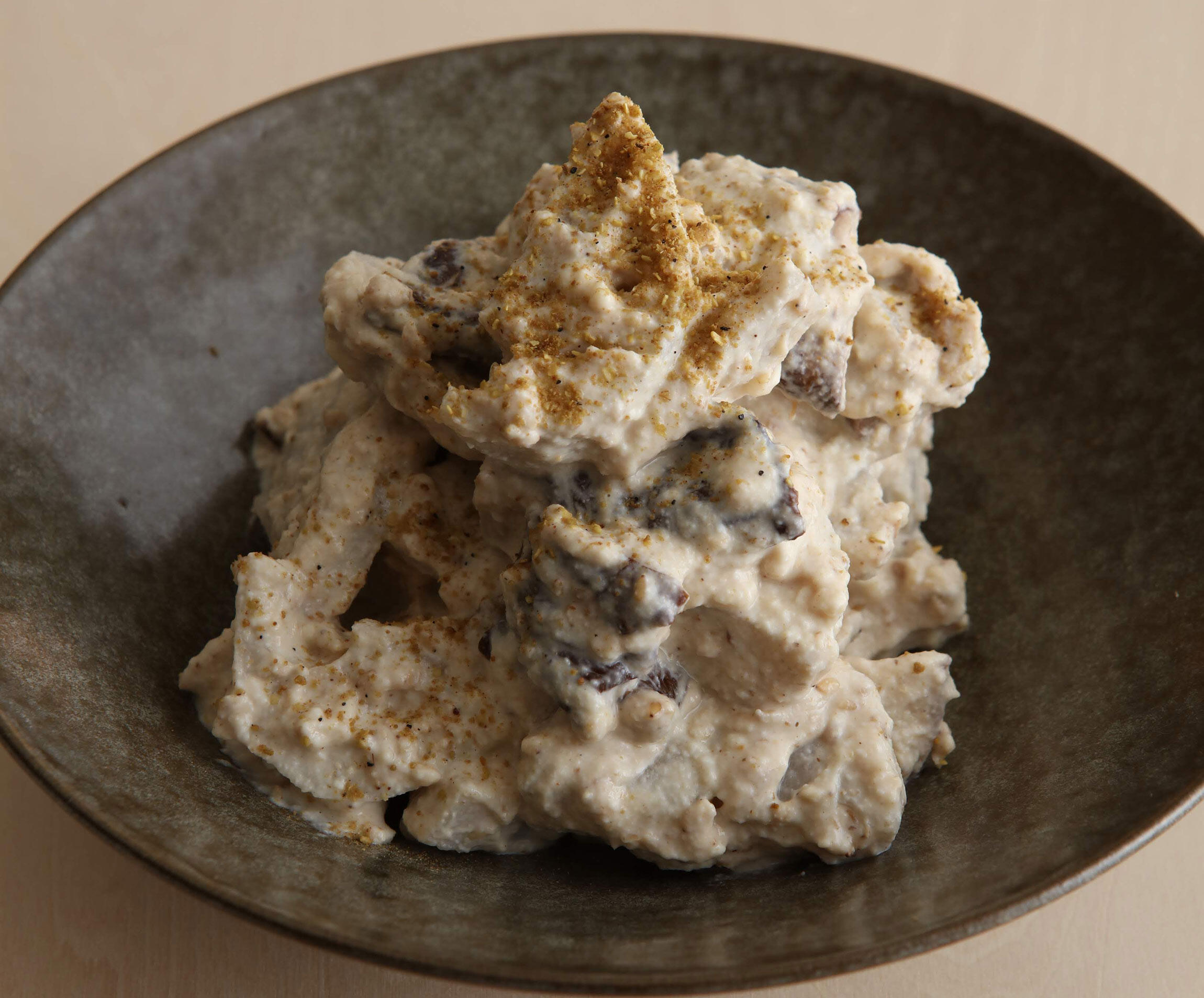 白煎り胡麻をすり鉢で半ずりにし、軽く水きりした絹漉し豆腐、白練り胡麻を入れて混ぜ、魚醤を加える。そこにれんこん、椎茸を和えて皿に盛り、粉山椒をふる。