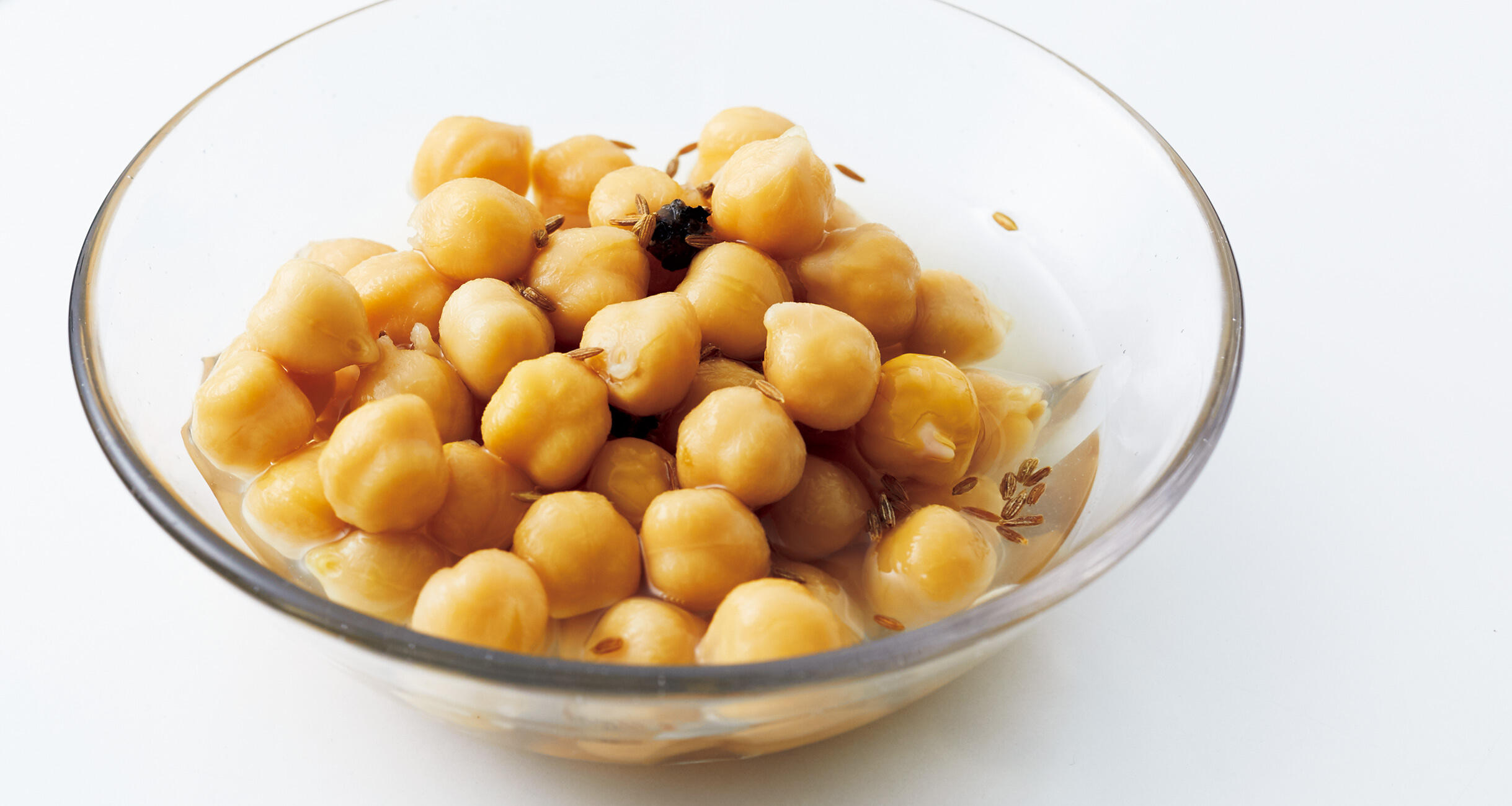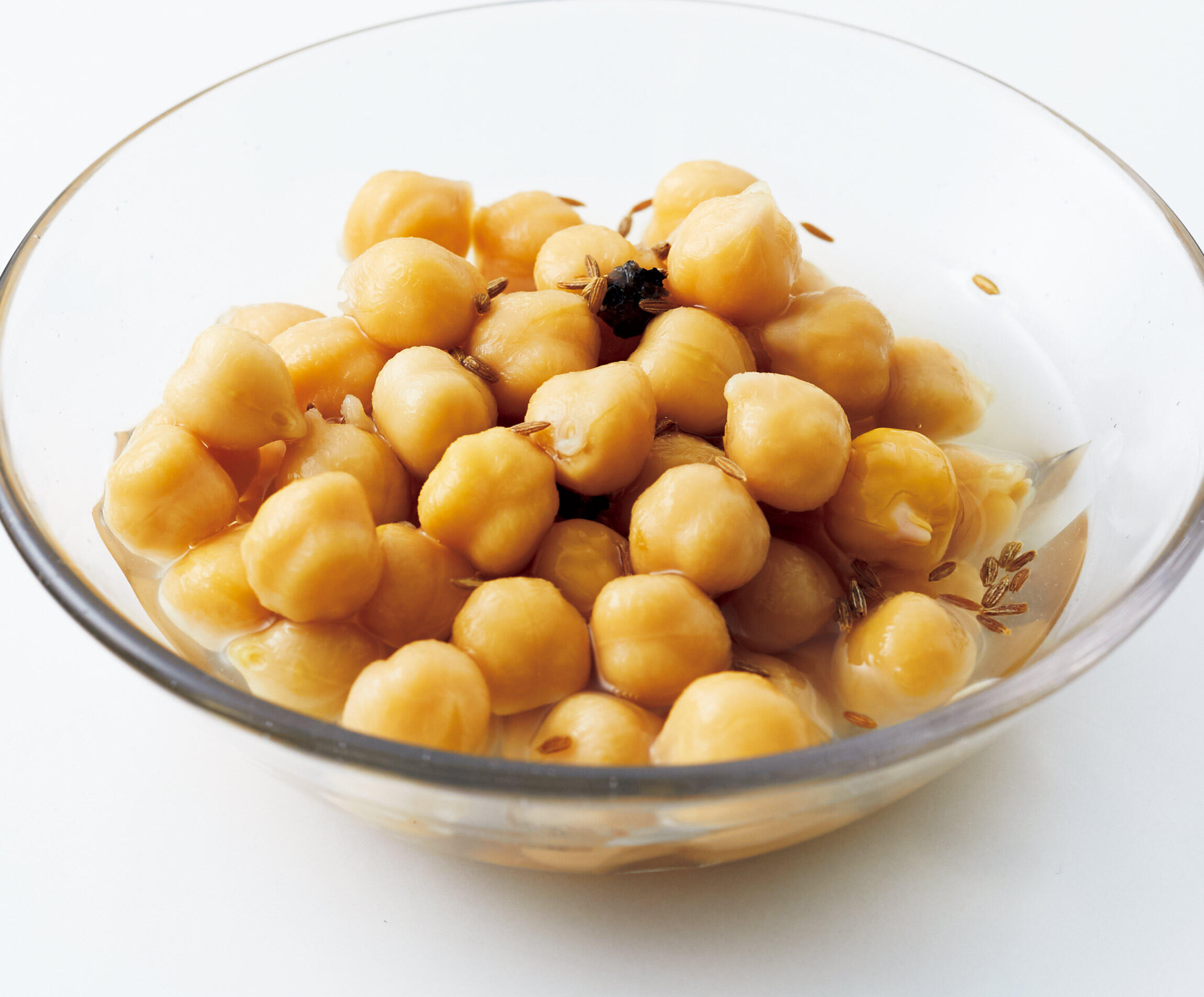 豆の下処理をする。ひよこ豆は洗い、大きめの鍋に入れて5~6カップの水を加え、8時間ほど浸す。鍋を中火にかけて煮立ってきたら、火を弱めてアクを取り、蓋をして弱火で40~50分、やわらかくなるまでゆでる。ゆで汁と豆に分ける。