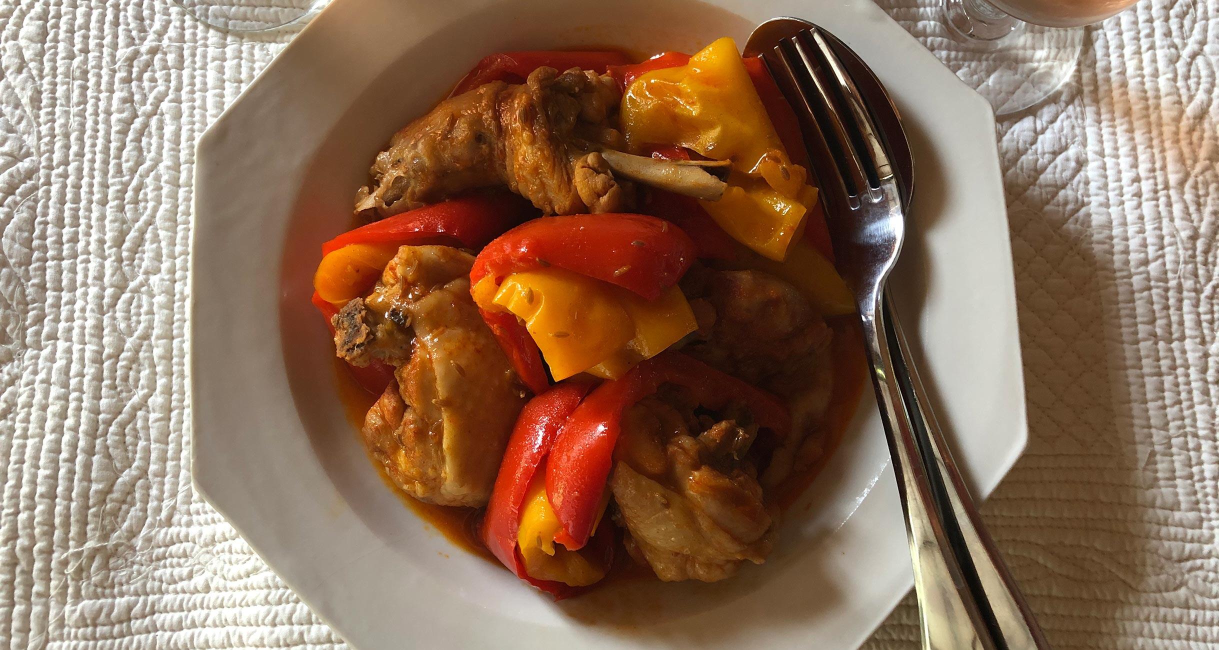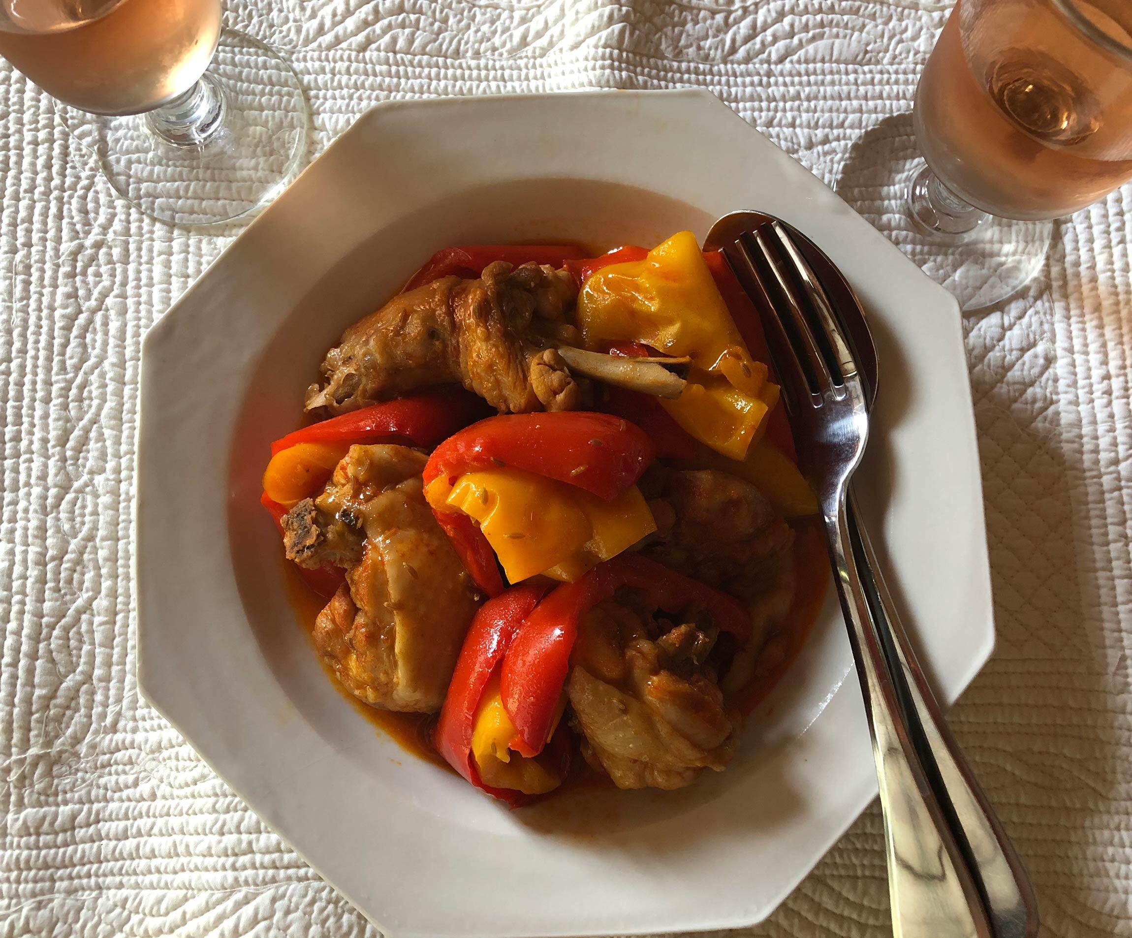 鶏をマリネしている間にパプリカを切り、蓋の重い厚手の鍋に重ね入れるだけ。飲むワインを料理にも使い、飲みながらつくってはいかが。焦がさないように注意して。