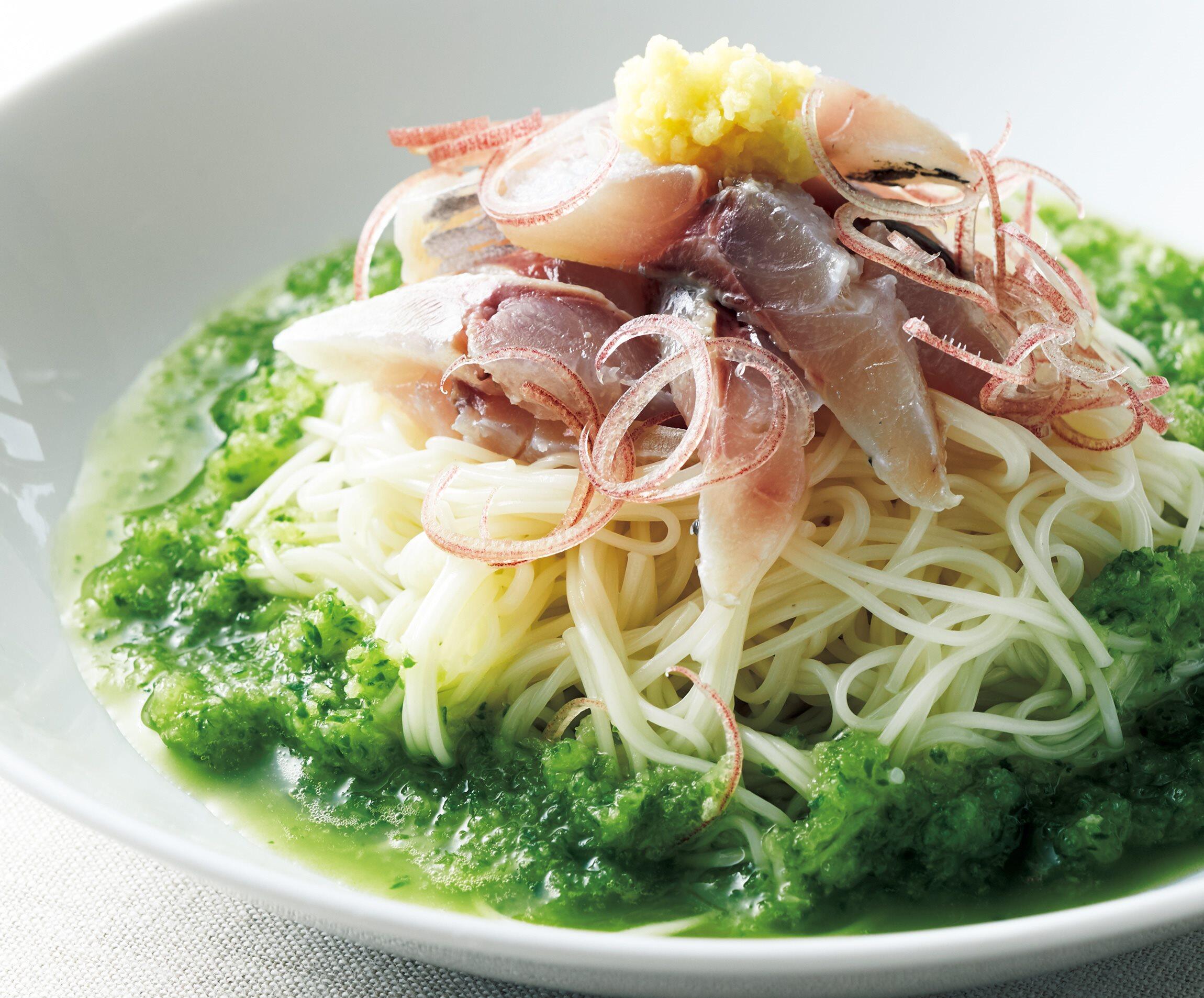 そうめんはたっぷりの熱湯でゆで、ゆで汁をきって氷水で洗い、水気をきる。器に緑酢とともに盛り合わせ、③をのせて、麺つゆをかけ、生姜をのせる。