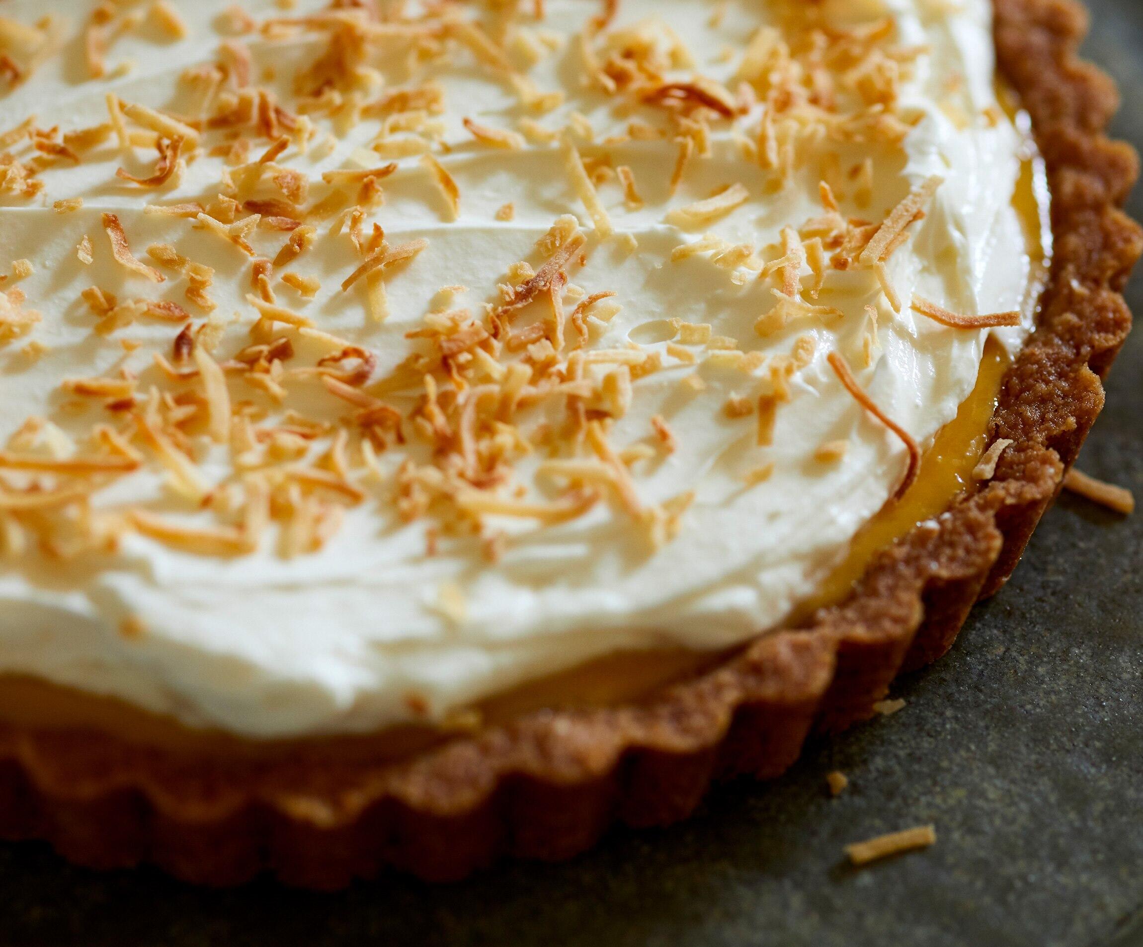6の上にへらで塗り広げ、ローストしたココナッツロングを飾る。