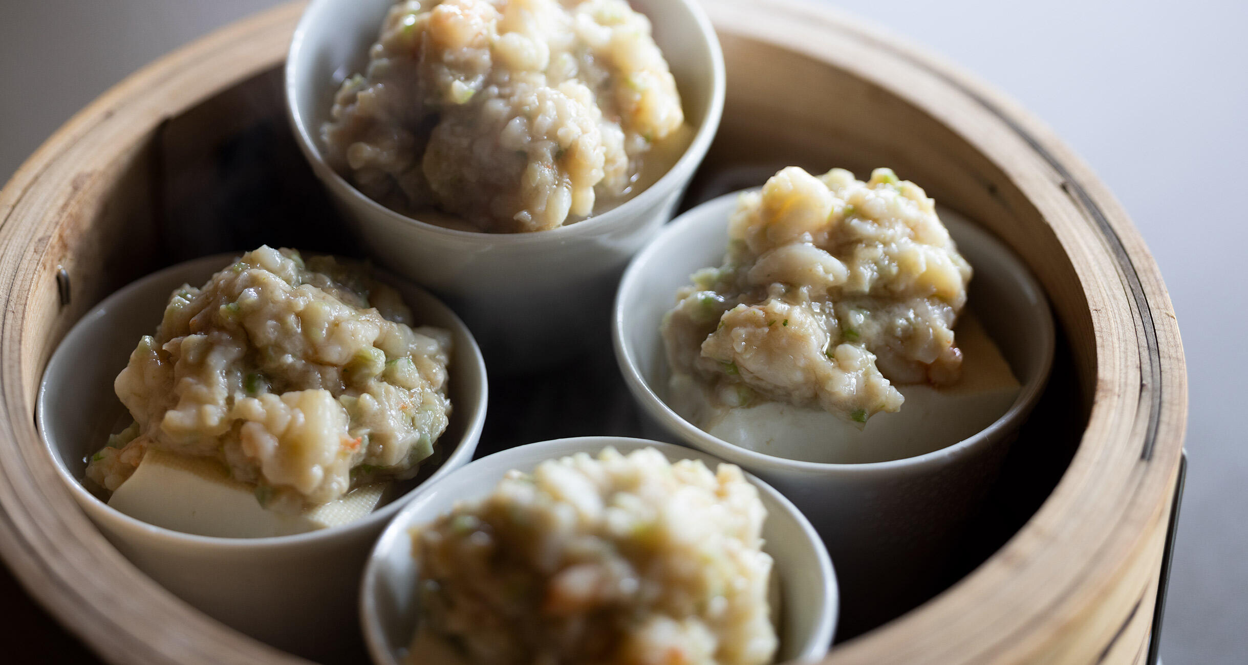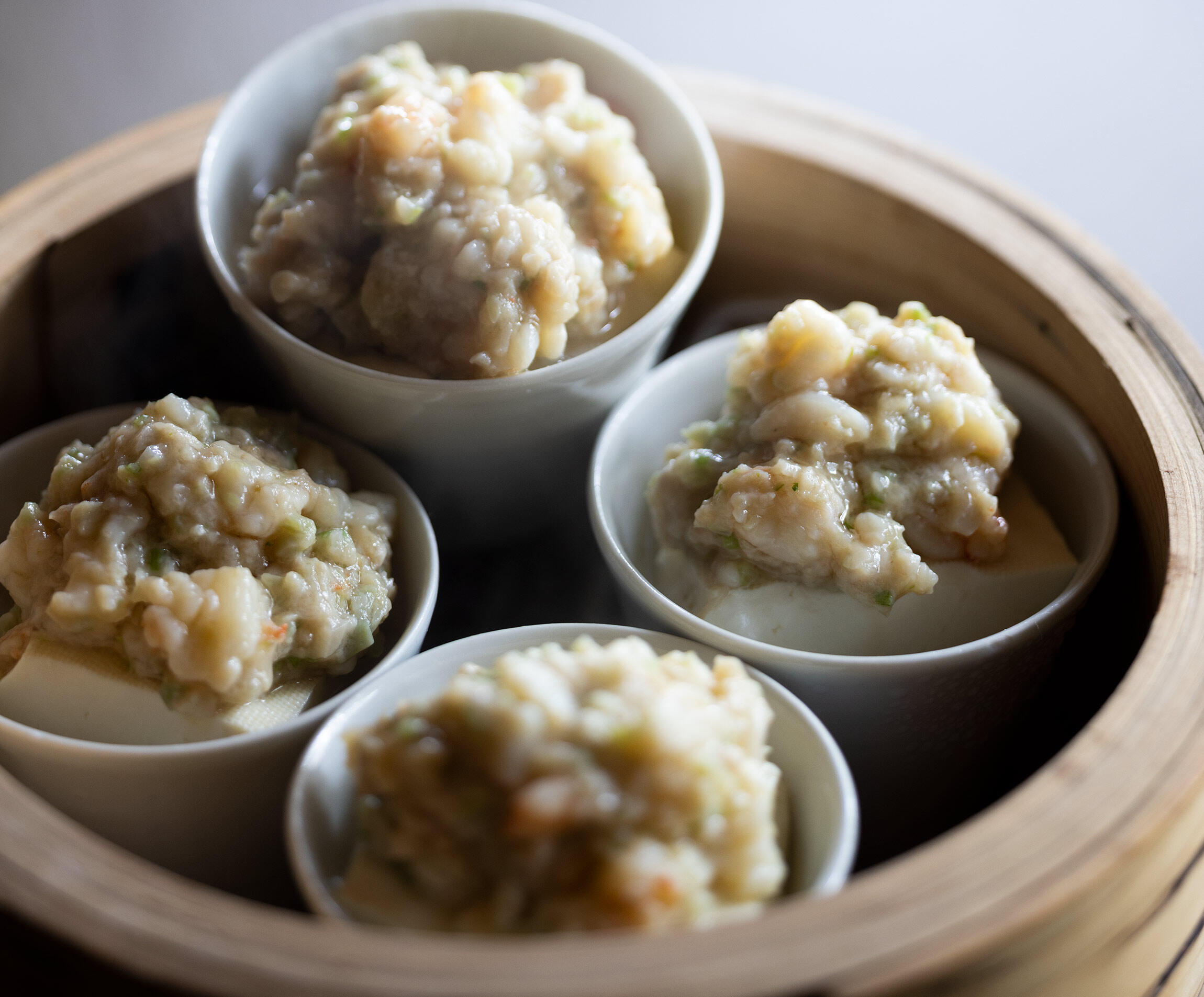 いってみれば、海老ワンタンの具を豆腐にのせて蒸したような料理。