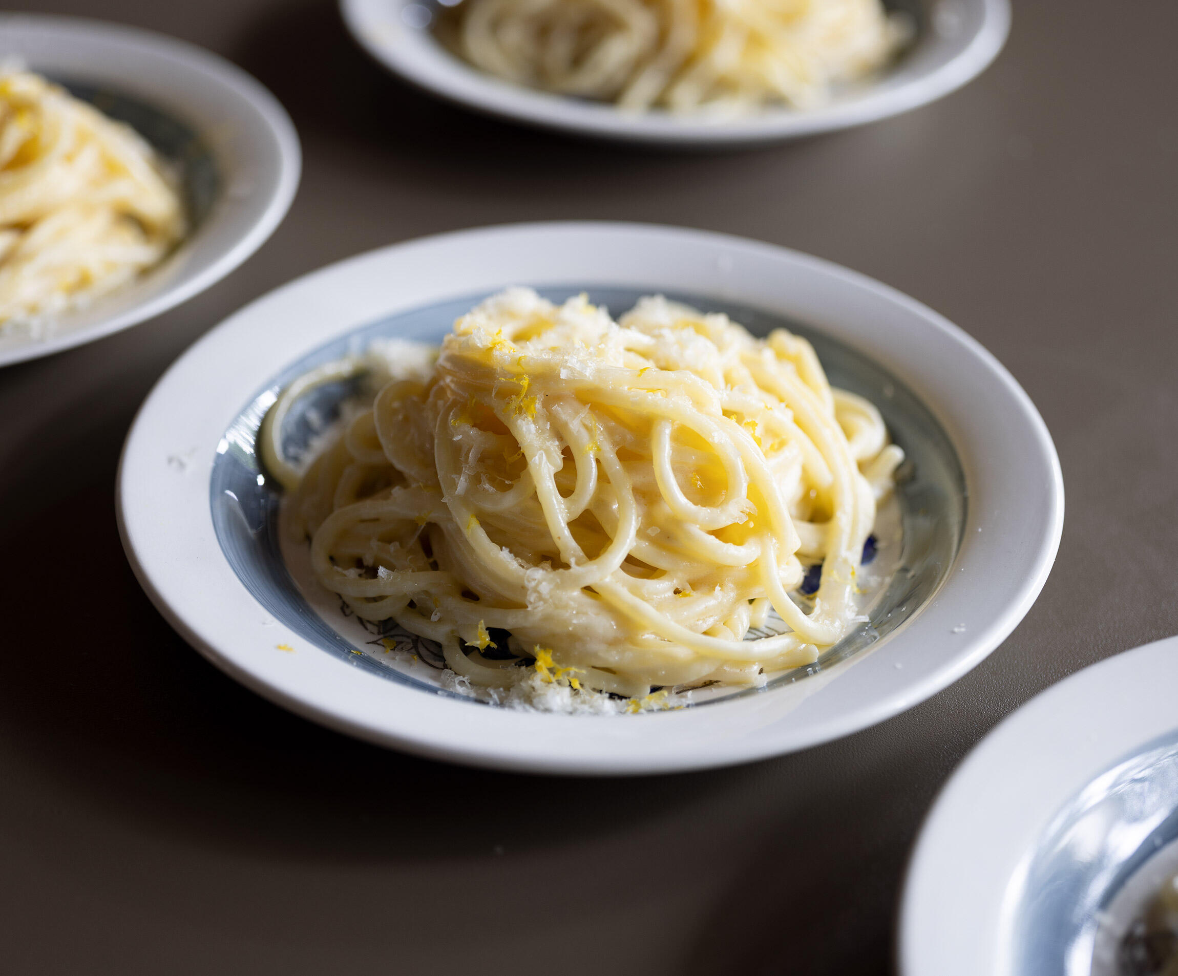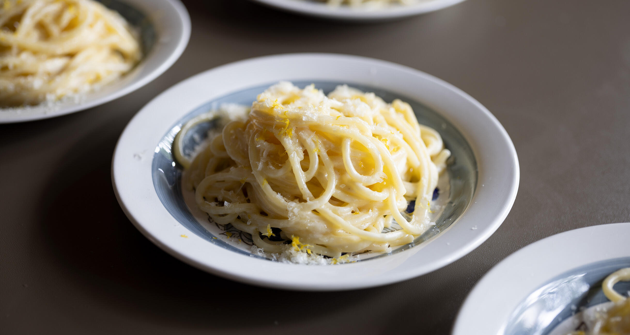 溶かしたバターにレモン汁と生クリーム、チーズを加え、固めにゆでたパスタとゆで汁を加えて煮からめることでソースとしっかりなじむ濃厚な味わいに仕上がります。