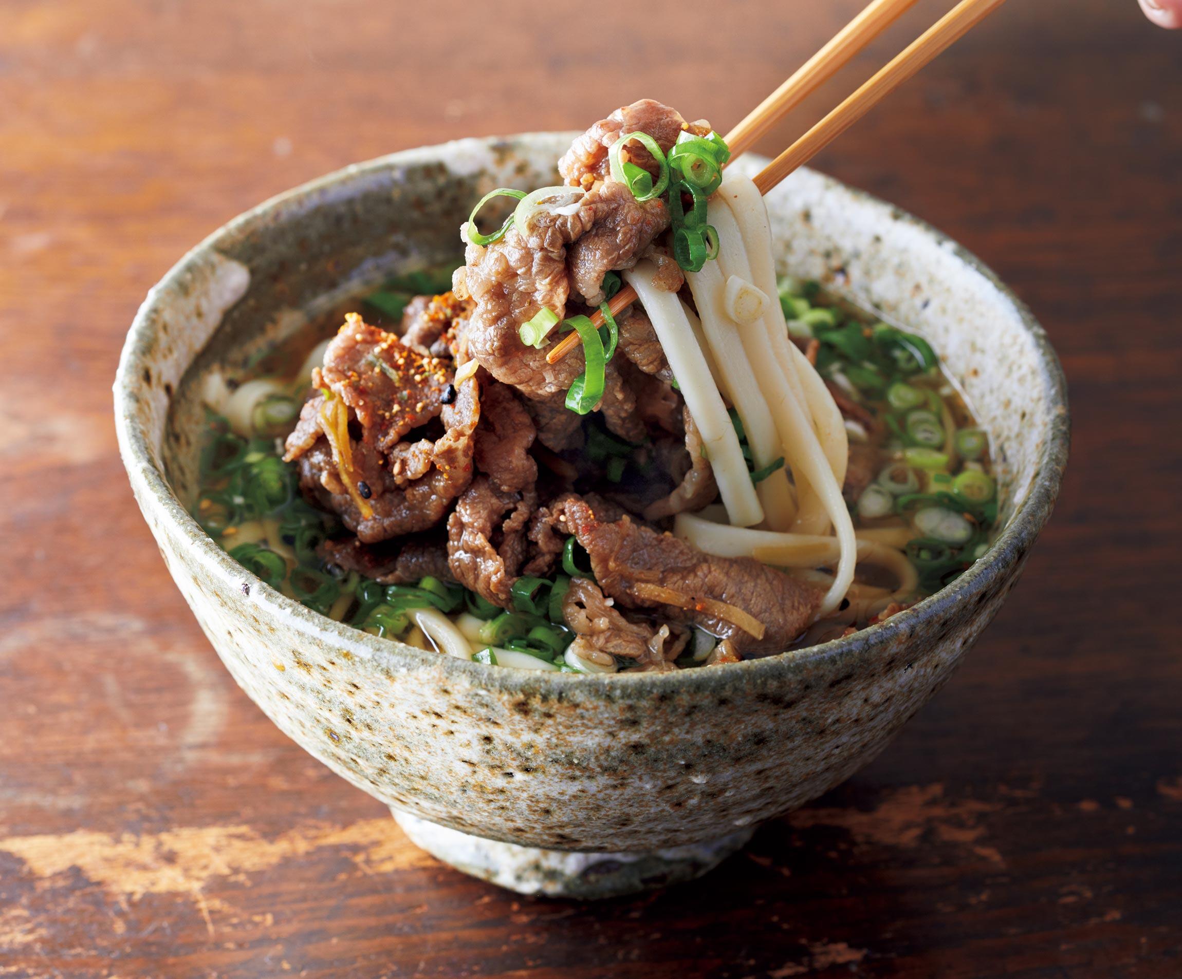 ゆでたうどんまたは解凍したうどんをつゆに入れ、ひと煮立ちさせて器に盛る。つゆを注いでわけぎをたっぷりのせ、牛肉を盛って煮汁もかけ、七味唐辛子をふる。