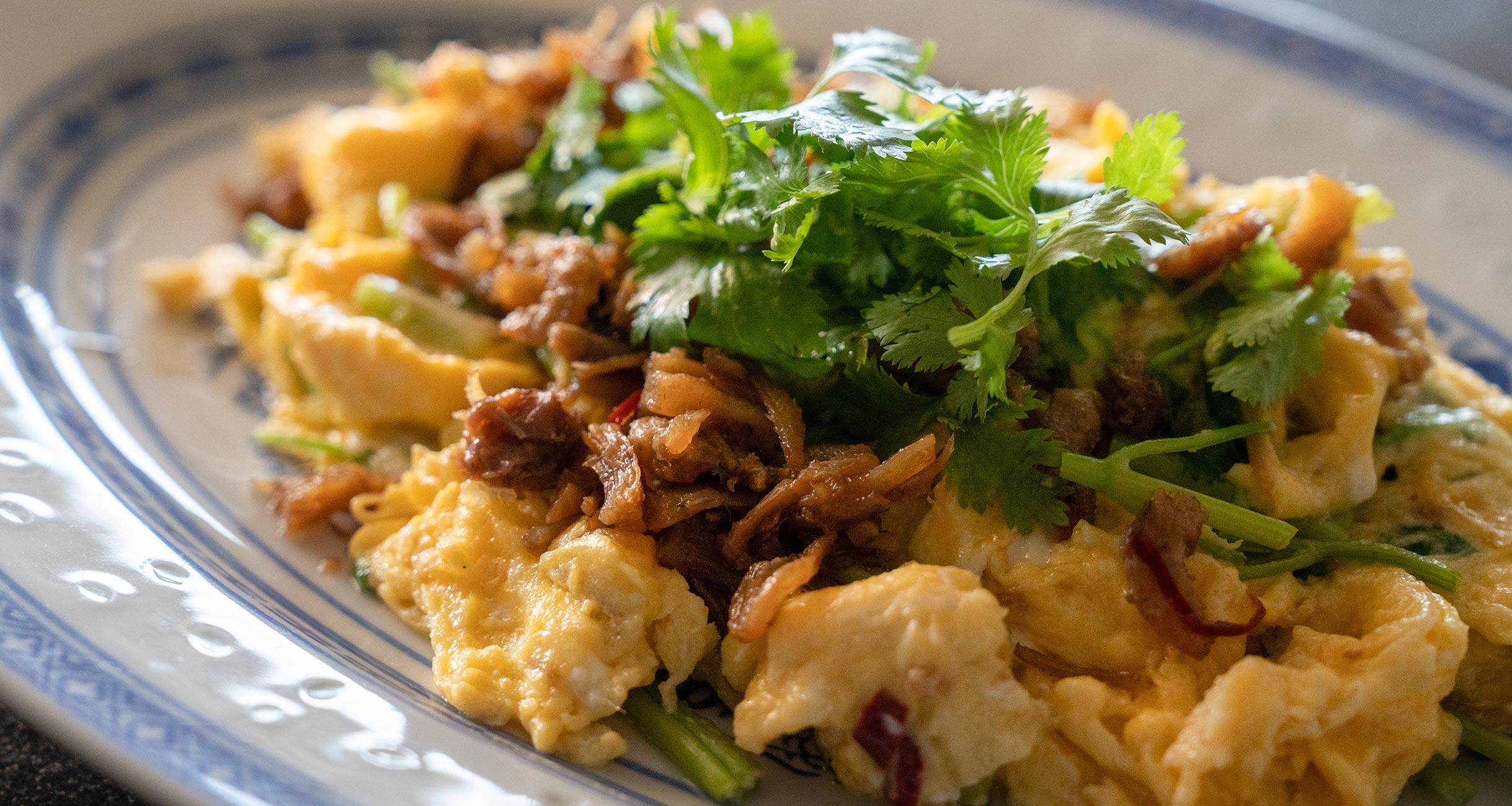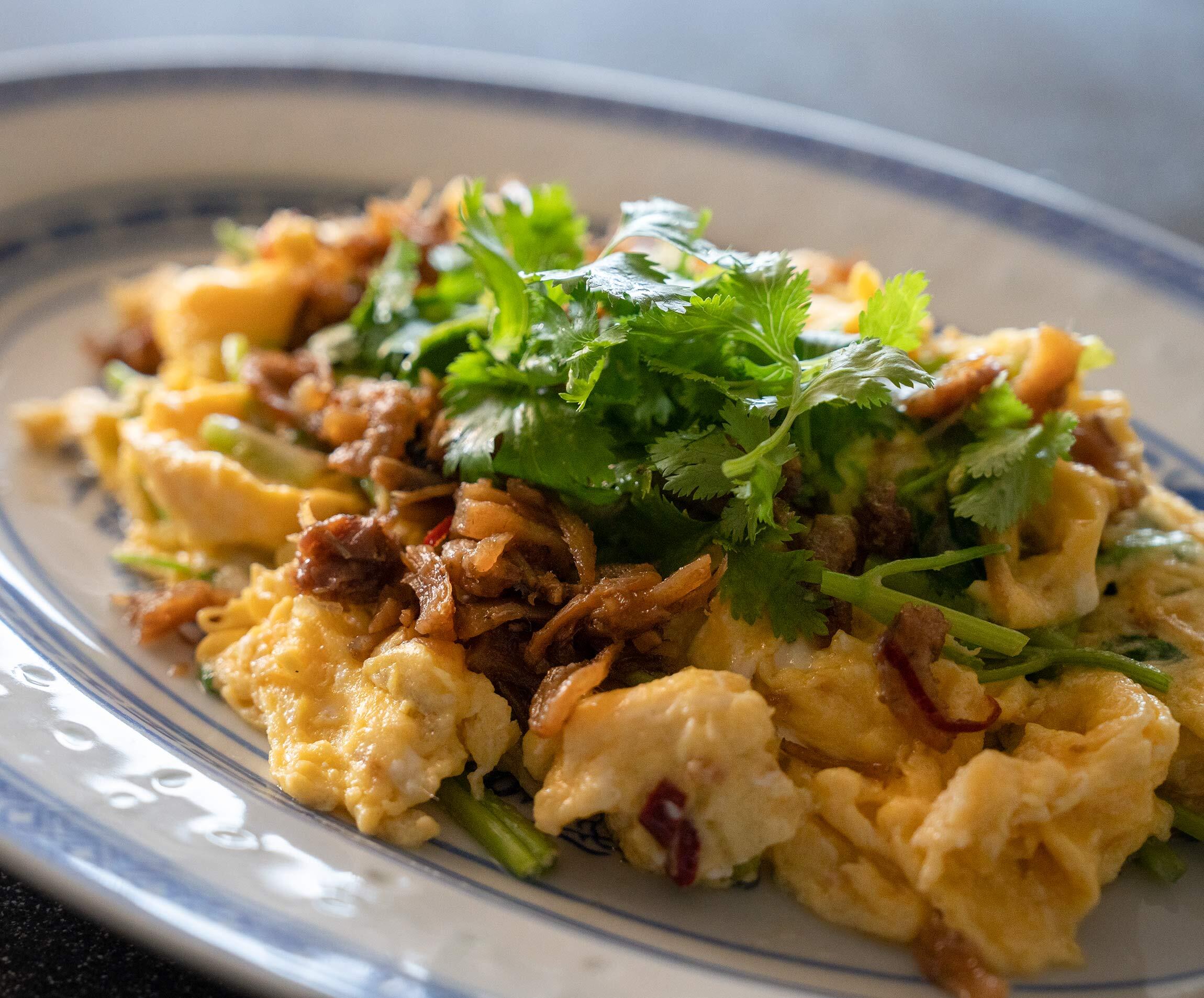 XO醤のコクと味わいがじわーっとなじんだスクランブルエッグに、さらに仕上げのXO醤と香菜を添えて。