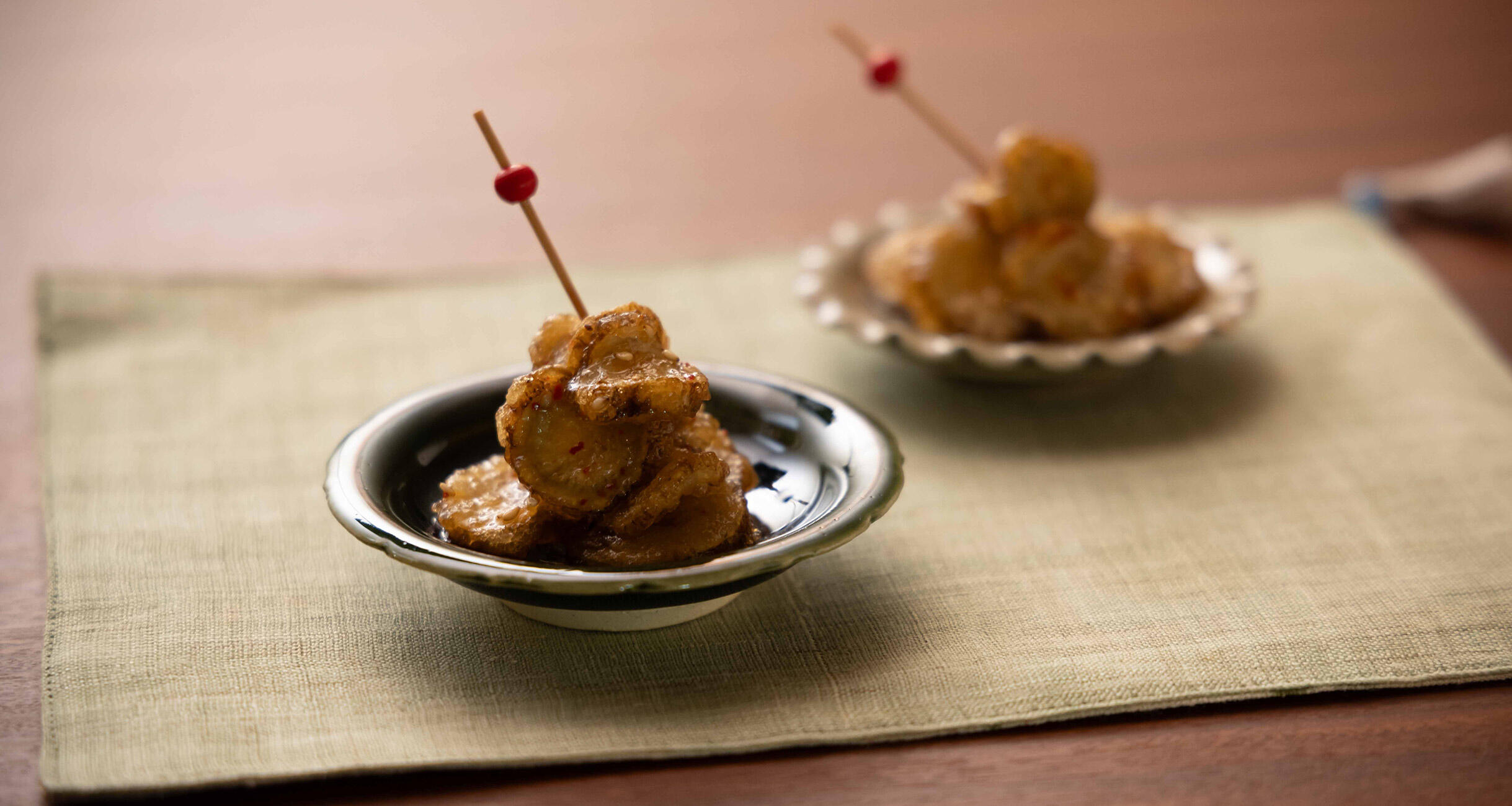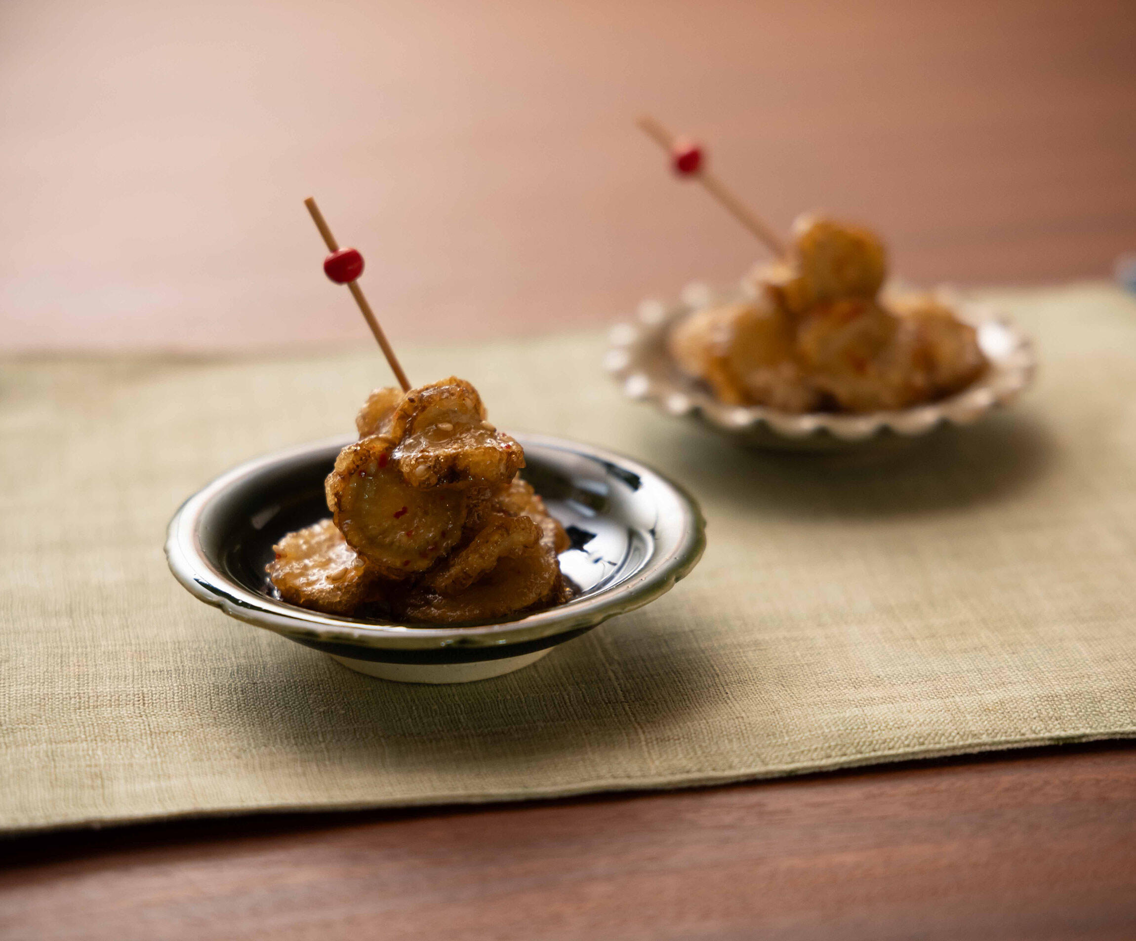 ごぼうは洗っただけで、皮付きのままです。このほうが食べたときにごぼうの味も歯ごたえもあって、甘酢味がよく合うんです。片栗粉をまぶして揚げると中はしっとり、外はカラッと揚がり、味なじみがよくなります。揚げたてを甘酢と合わせ、ちょっとしんなりしてきたら食べ頃です。酸っぱすぎず、穏やかな酸味が、ウーロンハイにぴったりで、いくら食べても食べ飽きません。