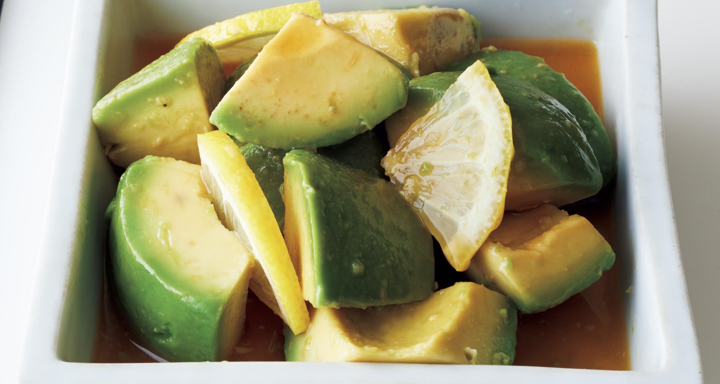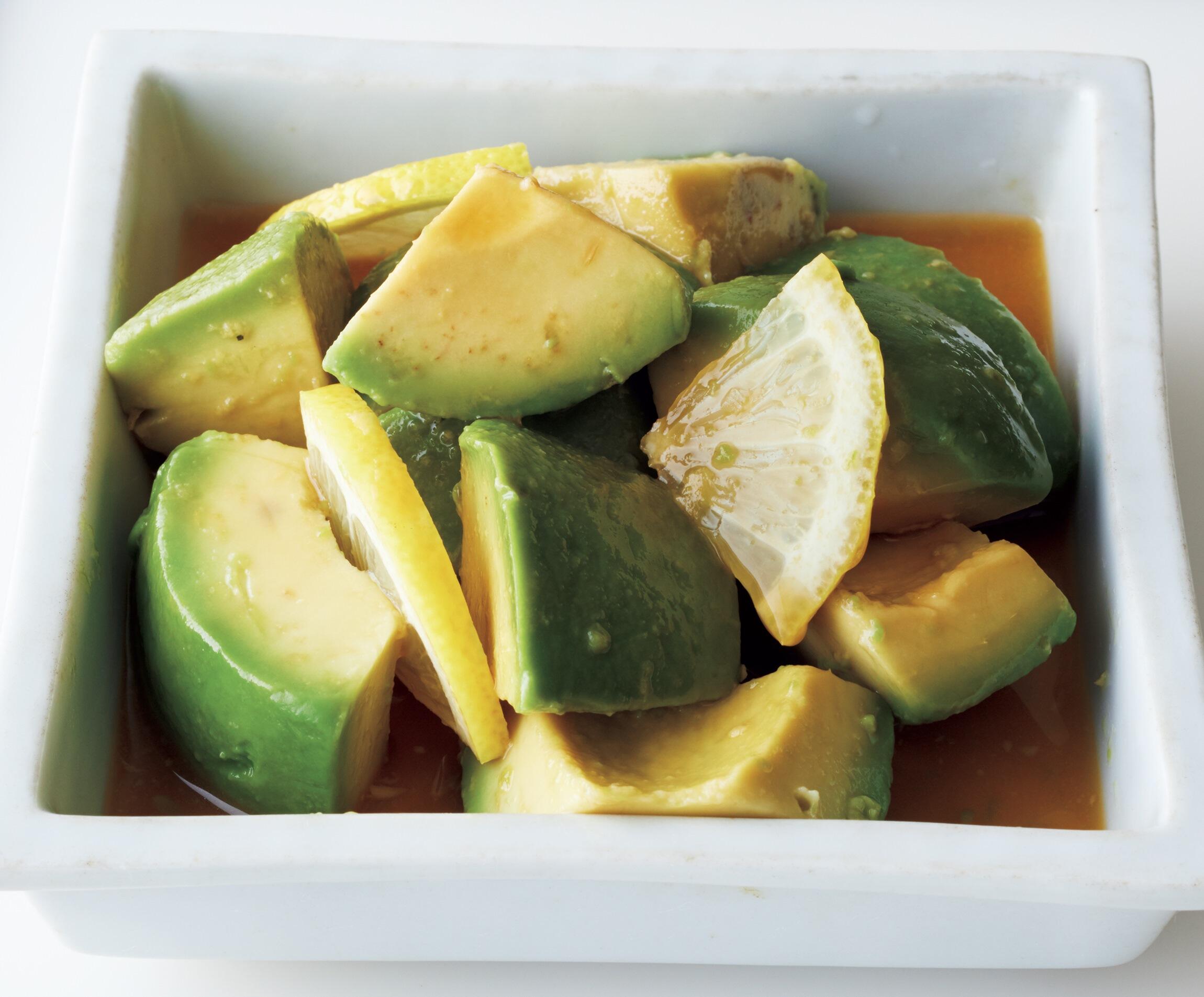容器にアボカドを入れてレモン汁をからめ、醤油を加えてやさしく混ぜて冷蔵庫で2時間ほど漬ける。器に盛ってレモンを添える。