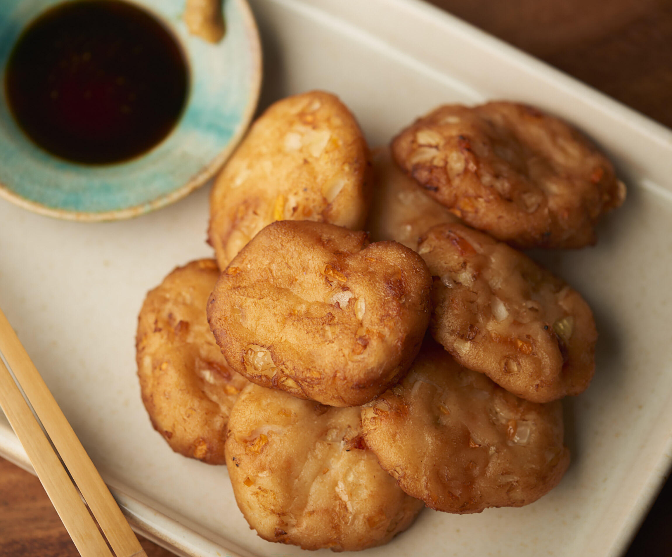 油を180℃に熱し、③を入れてきつね色になるまで揚げる。醤油とからしを添えていただく。