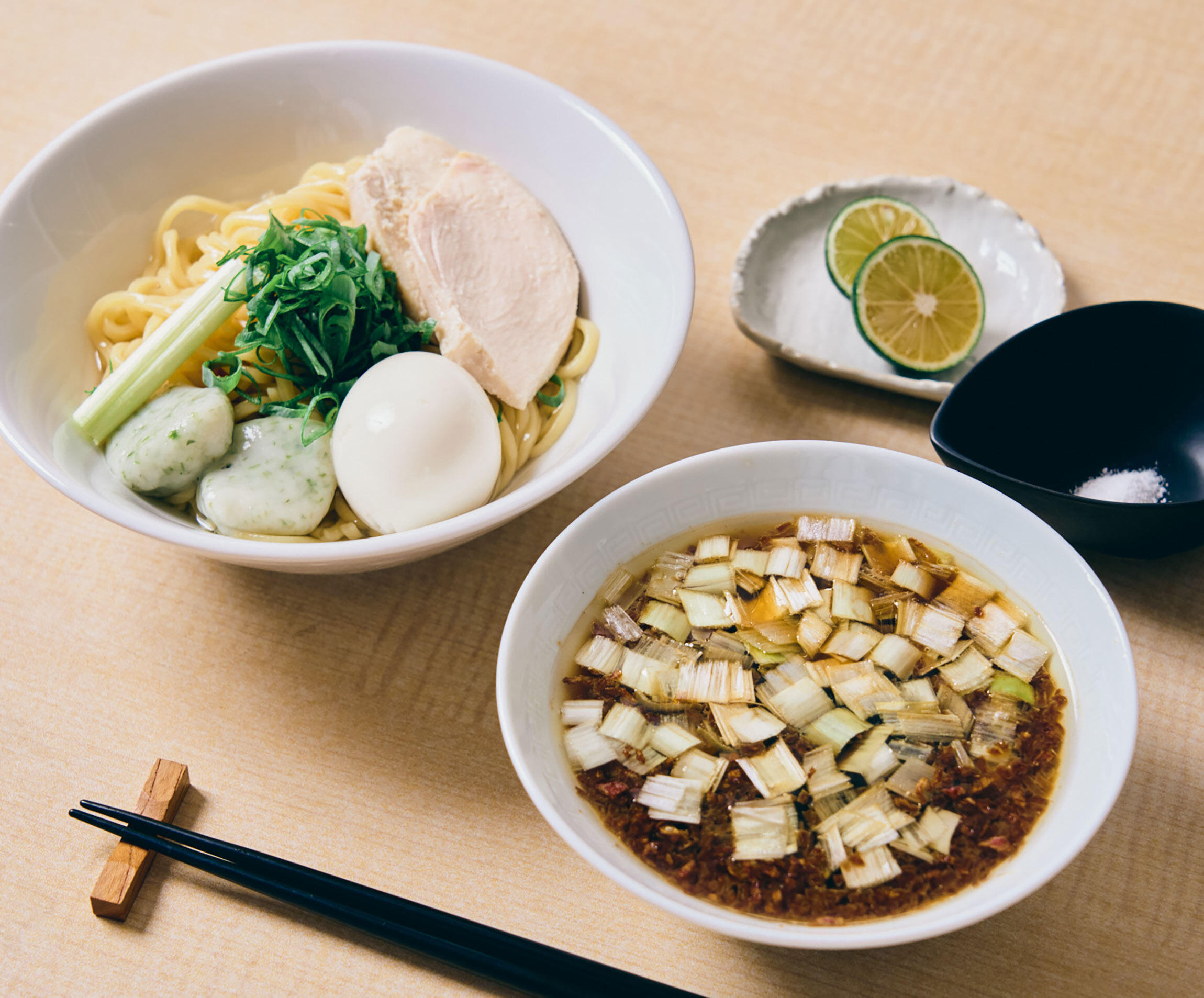 醤油らぁ麺のレシピと同じようにだし、醤油だれ、香味油、トッピングの具をつくる