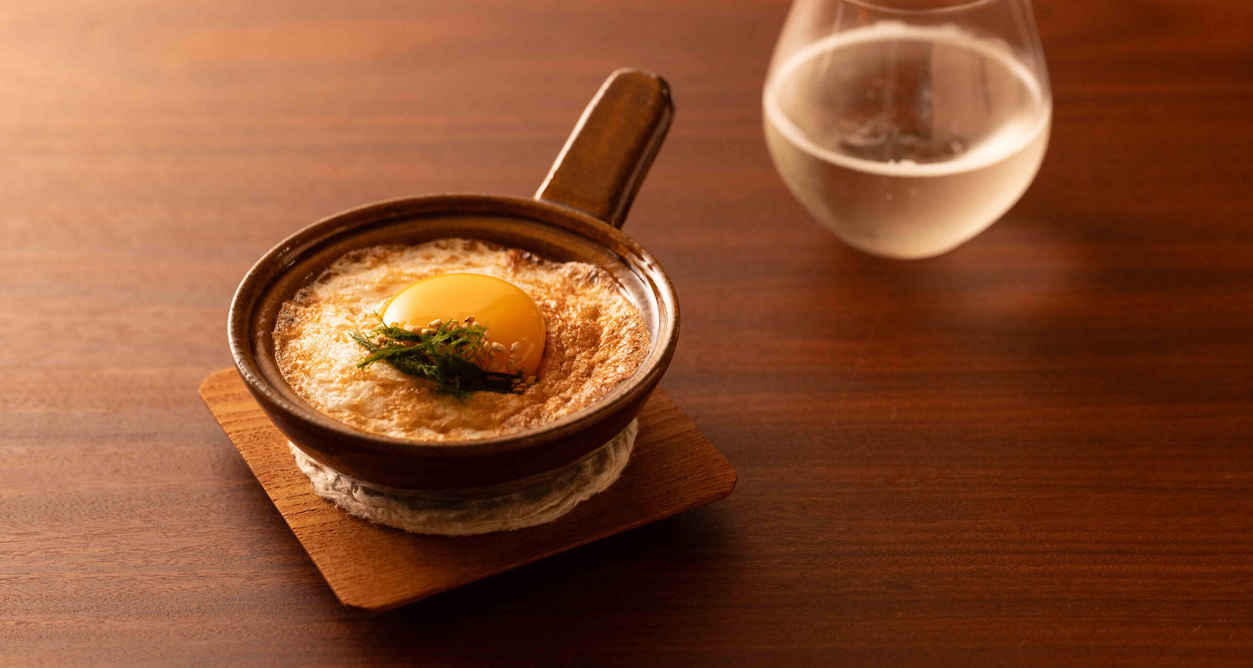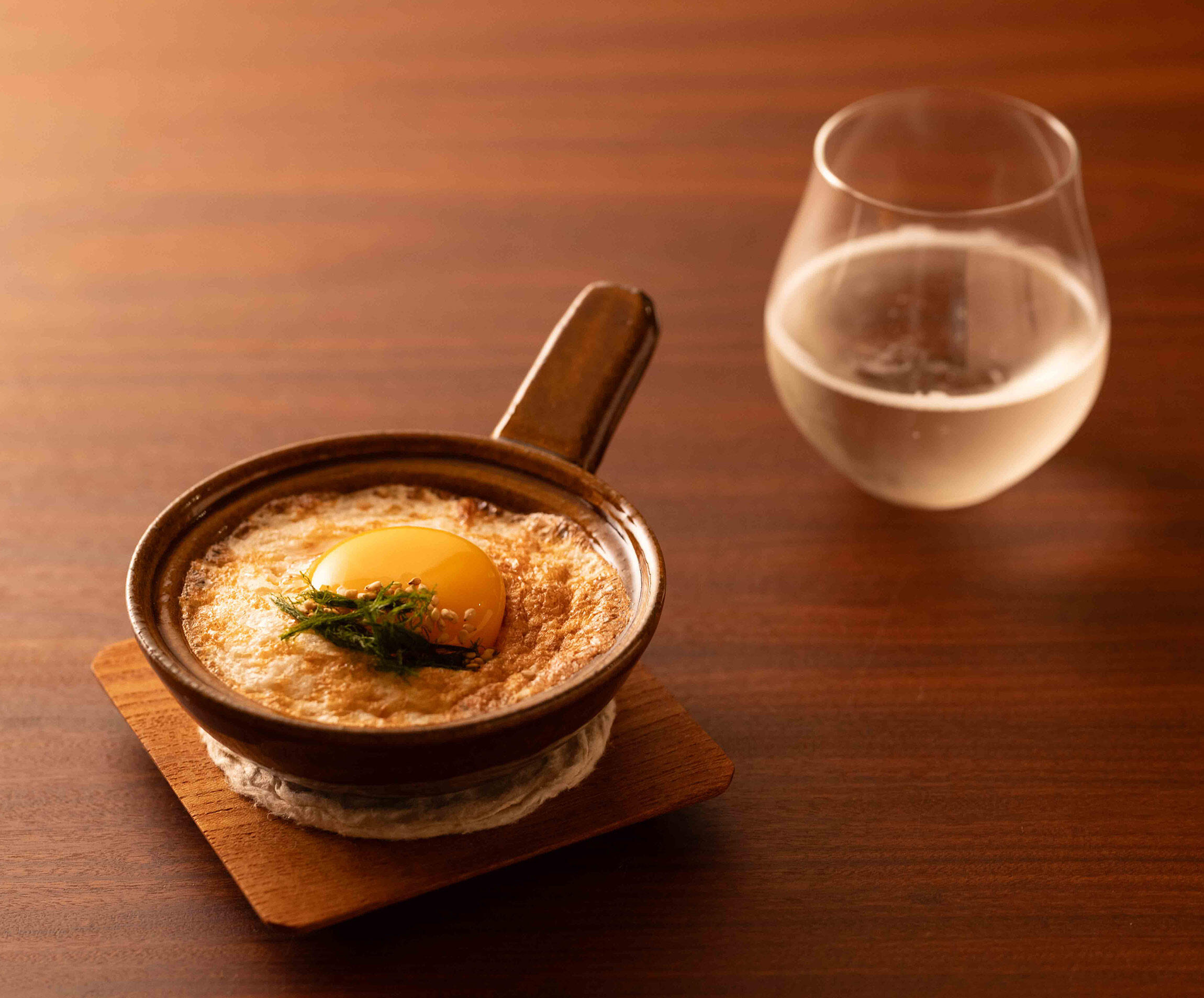 今回はエッグベーカーで焼いていますが、ココットなどの耐熱容器でも大丈夫です。焼き上がったら、残っている卵の黄身をトッピングしてください。卵と青海苔、白胡麻で美味しさが増し、桜海老の香ばしさがどこまでも日本酒に寄り添ってくれます。微発泡の日本酒がお薦めです。卵黄を崩し、からめながらチビチビどうぞ。