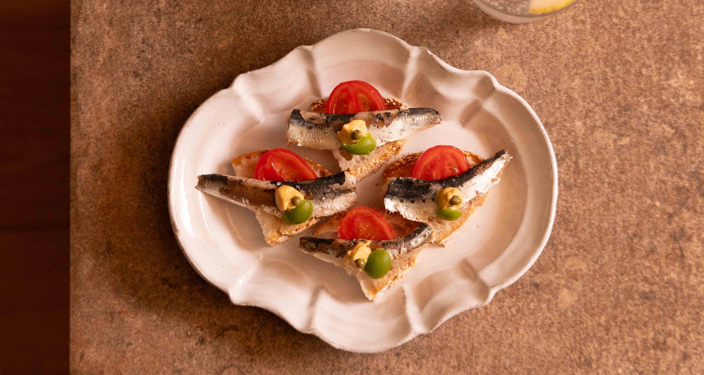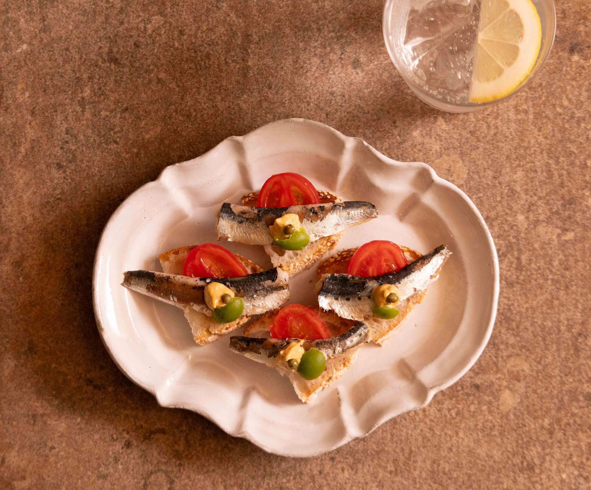 ②のイワシを取り出し、手で骨を外す。スライスしたパンにミニトマト、グリーンオリーブ、フレンチマスタードとともにのせる。食べるときにお好みでレモンをぎゅっと搾る。