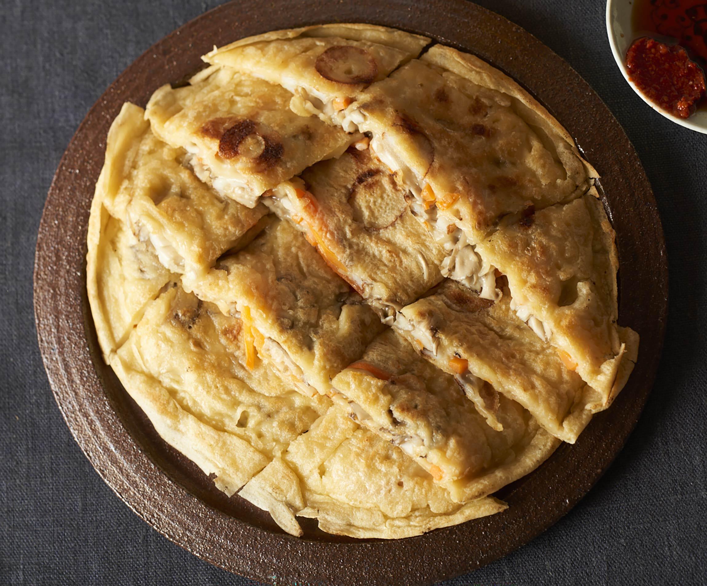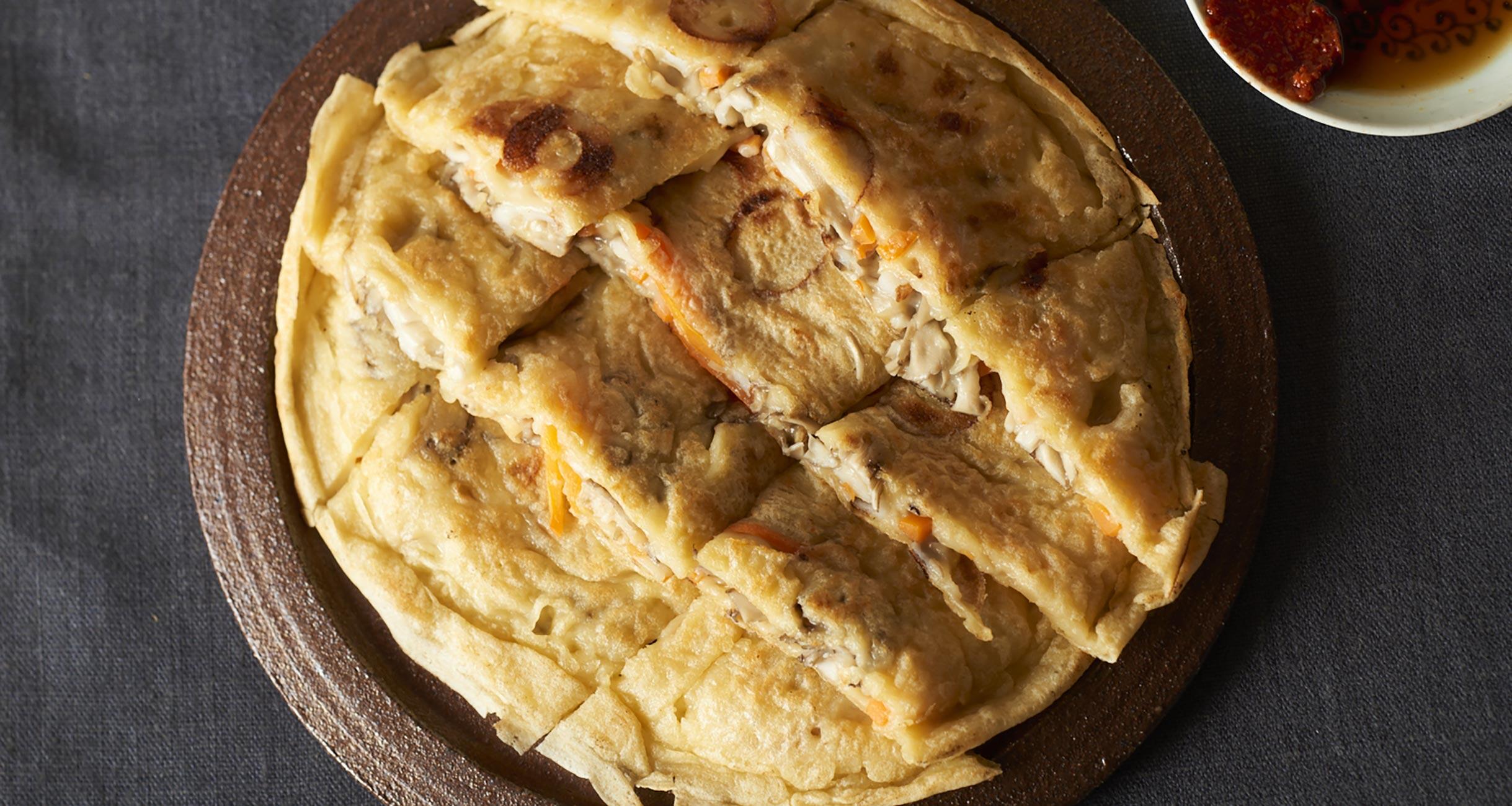 ヘラで押さえながらさらに3分ほど焼き、鍋肌から胡麻油大さじ1(分量外)を加えて表面をカリッと仕上げる。食べやすい大きさに切り、酢、醤油、豆板醤を添える。