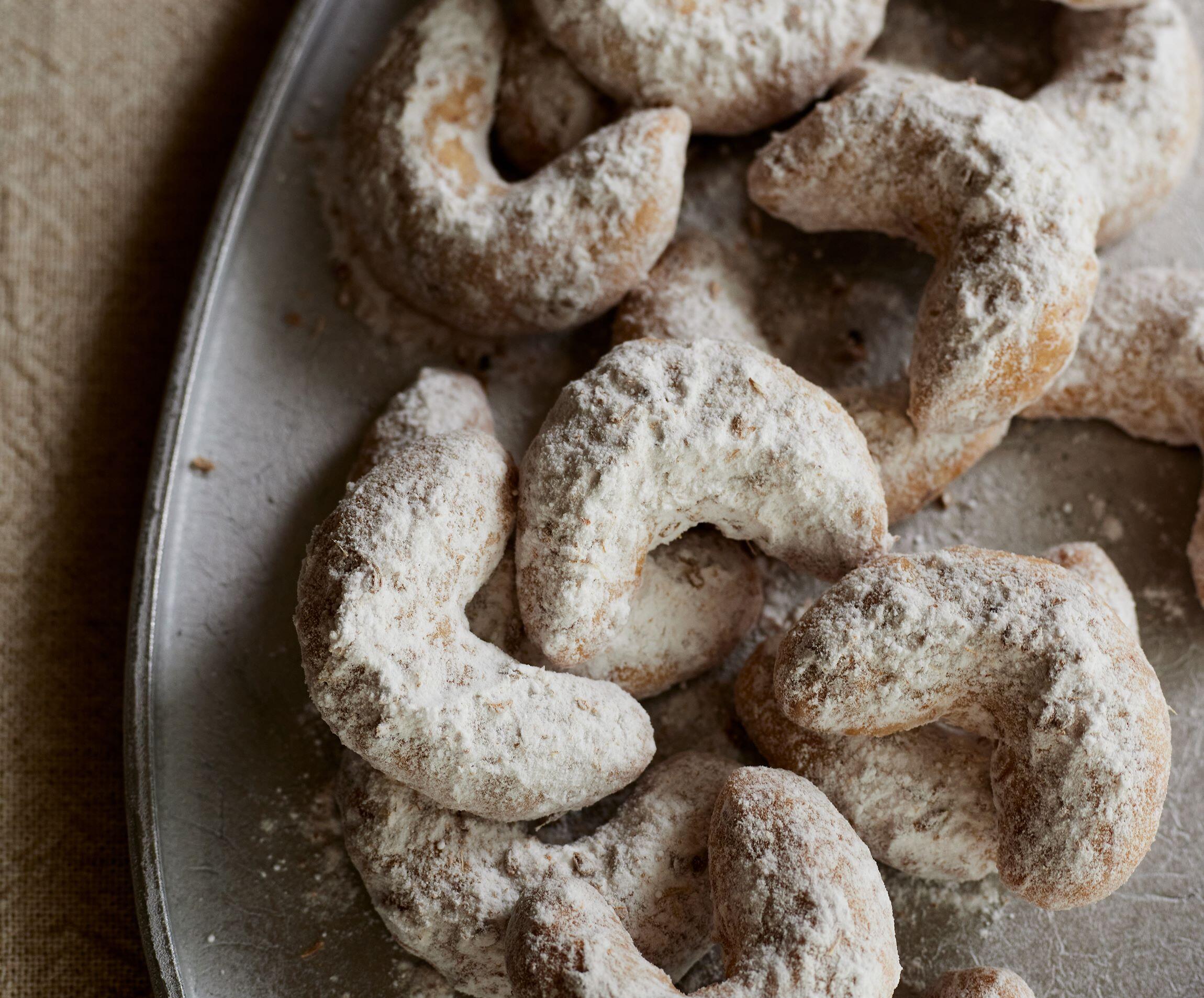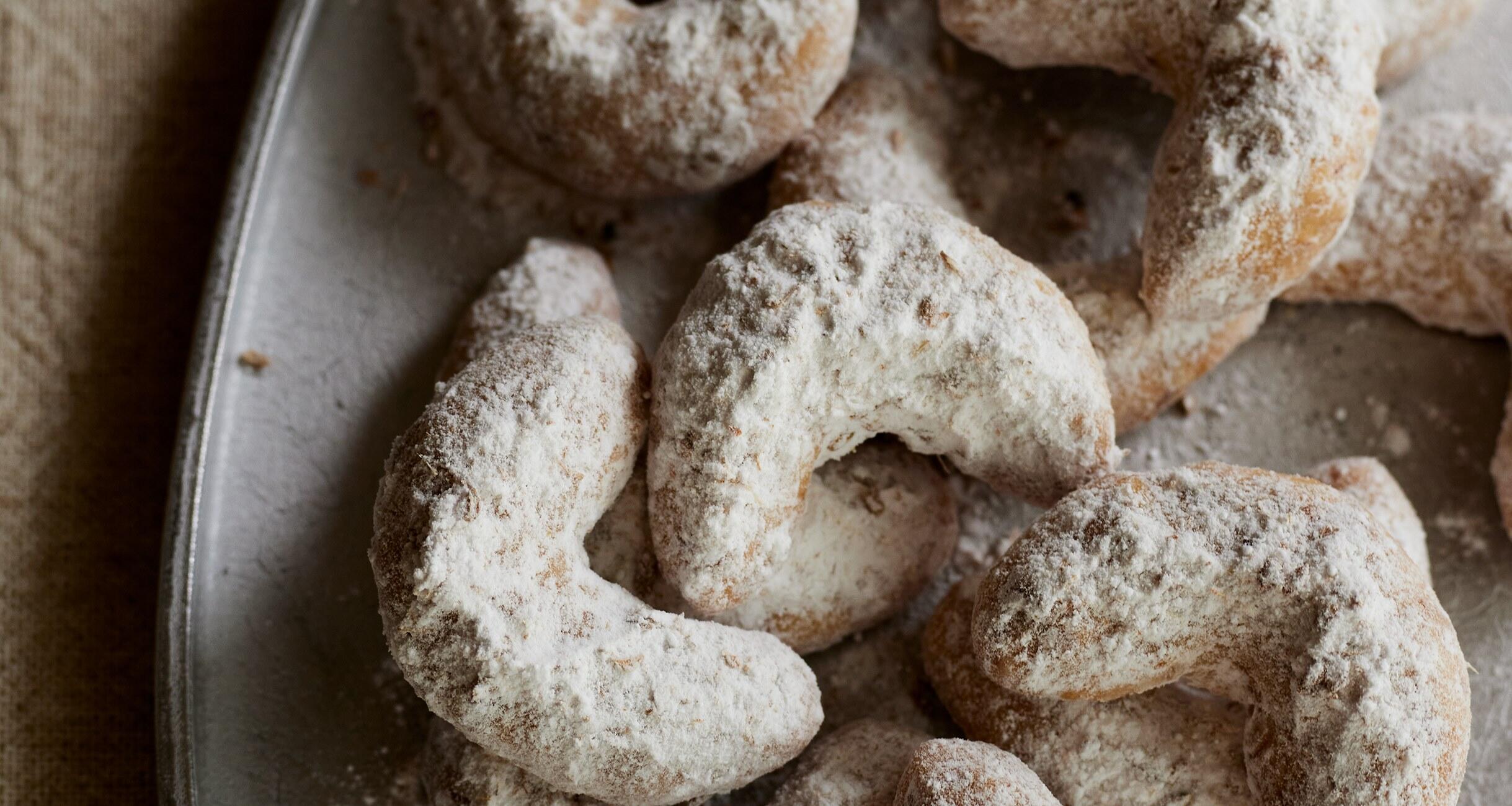 ナッツ入りのシナモン風味のショートブレッド生地を三日月形にして焼き上げ、アニスシード入りの粉糖をまぶして仕上げます。