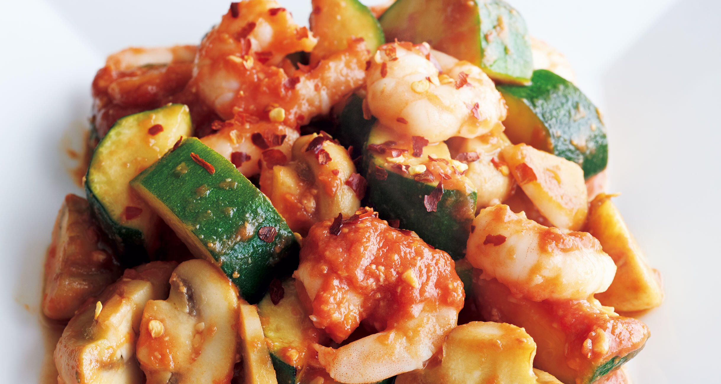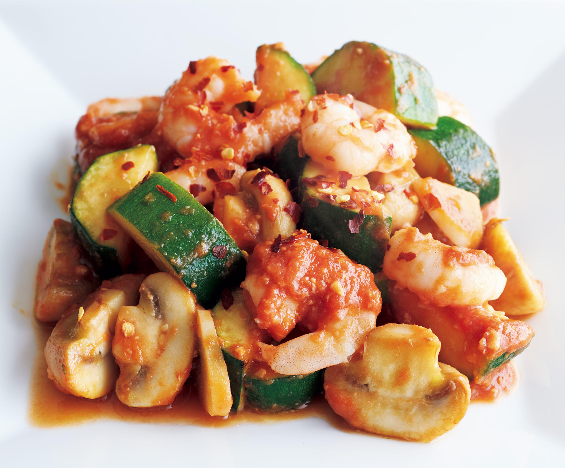 トマト味噌を加え、大きく混ぜて炒め合わせ、器に盛ってクラッシュ赤唐辛子をふる。