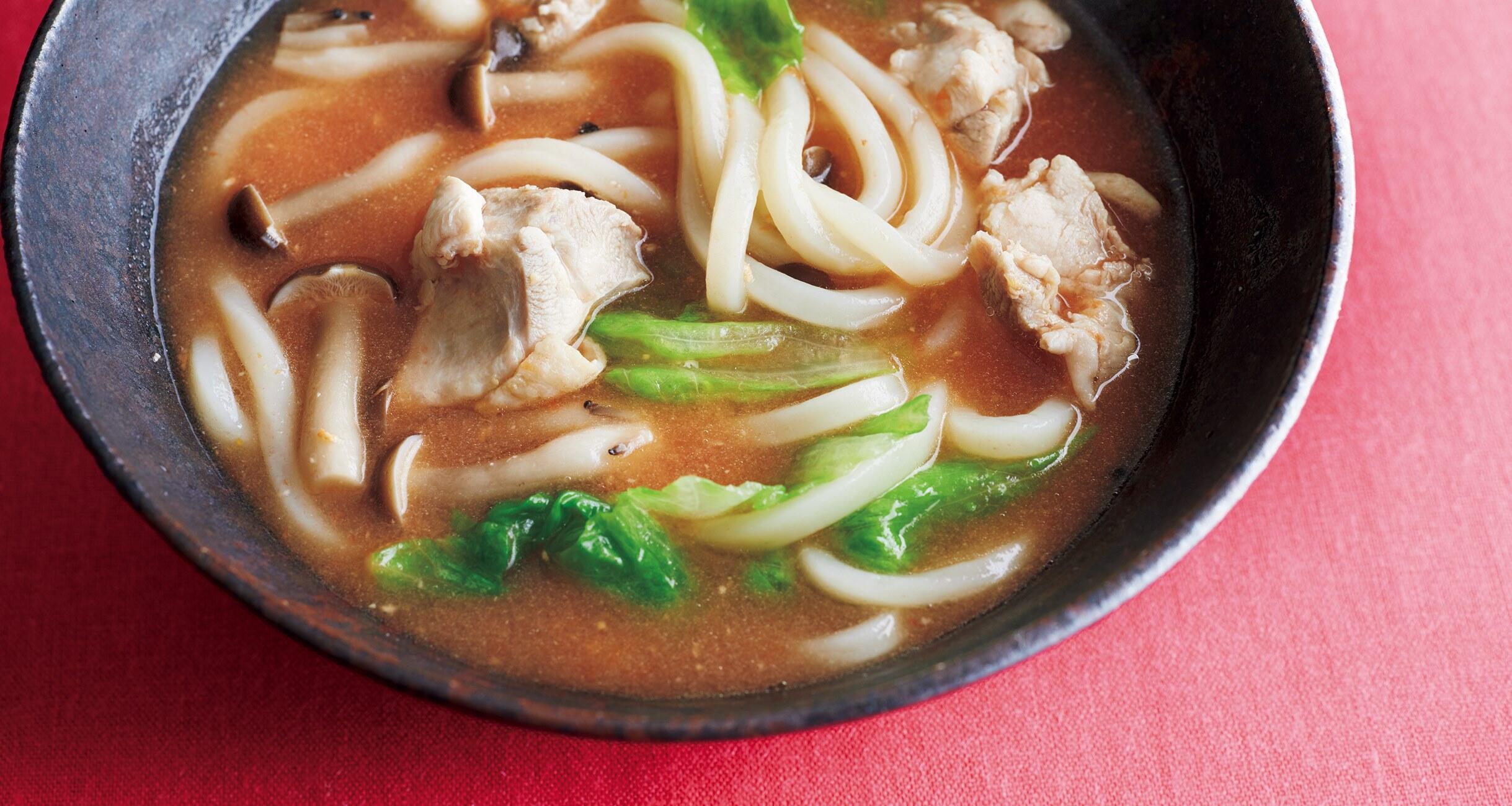 鍋にうどんを加え、強火にして再び煮立ってきたらレタスを入れる。しんなりしたら弱火にしてトマト味噌を溶き入れて煮立て、器に盛る。