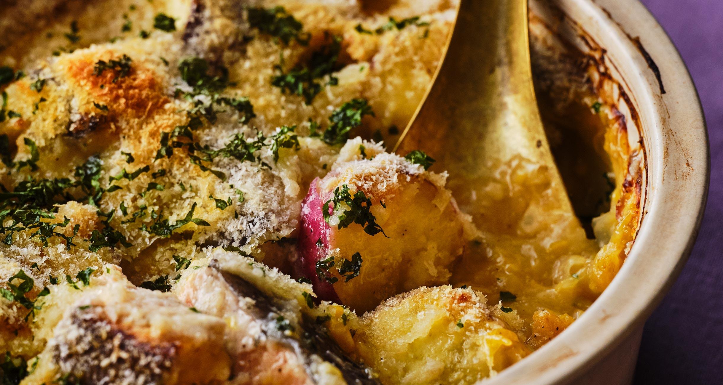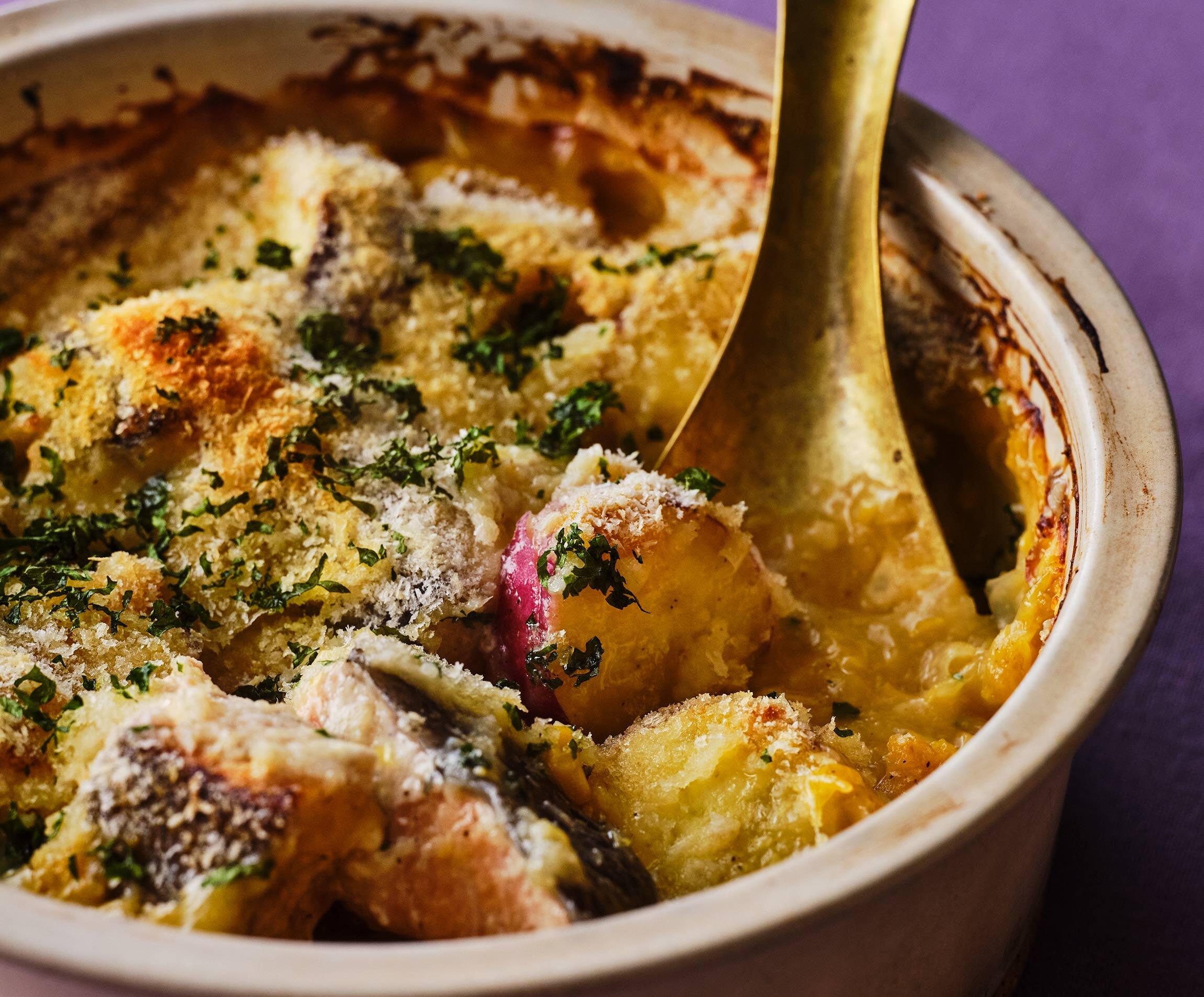 鮭とコーンとバター、気分は北海道!クリームコーンのとろみをグラタンのソース代わりに活用するというワザが光る一品です。さつまいもはレンジではなく、オーブンでじっくり火を通すほうがおいしく仕上がります。酒と料理を愛しすぎる料理家、スヌ子こと稲葉ゆきえさんが提案する、グラタンつまみをご紹介します。