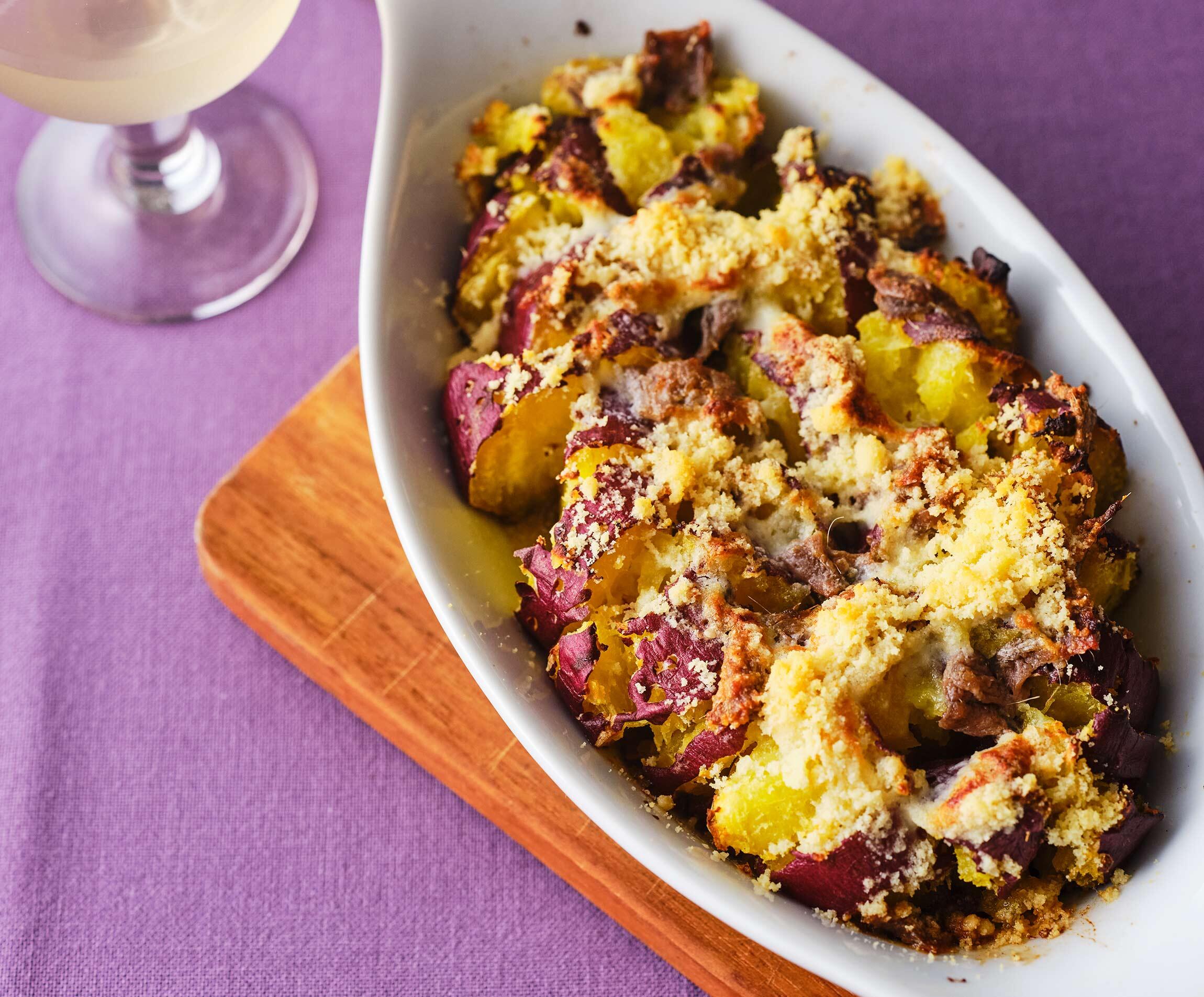 みんな大好きホクホク焼き芋が、アンチョビのおかげでワインに合うグラタンに。酒と料理を愛しすぎる料理家、スヌ子こと稲葉ゆきえさんが提案する、グラタンつまみをご紹介します。