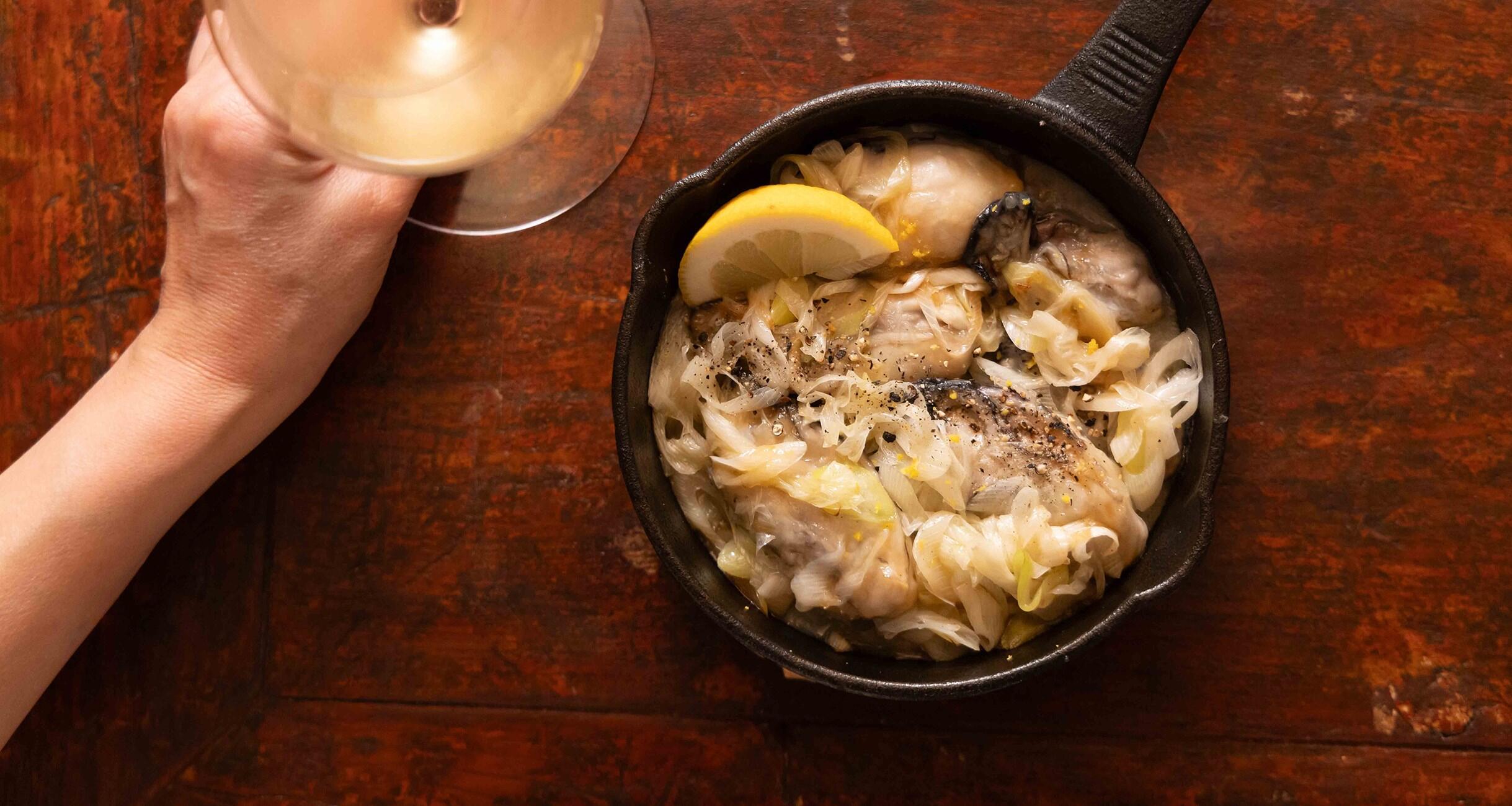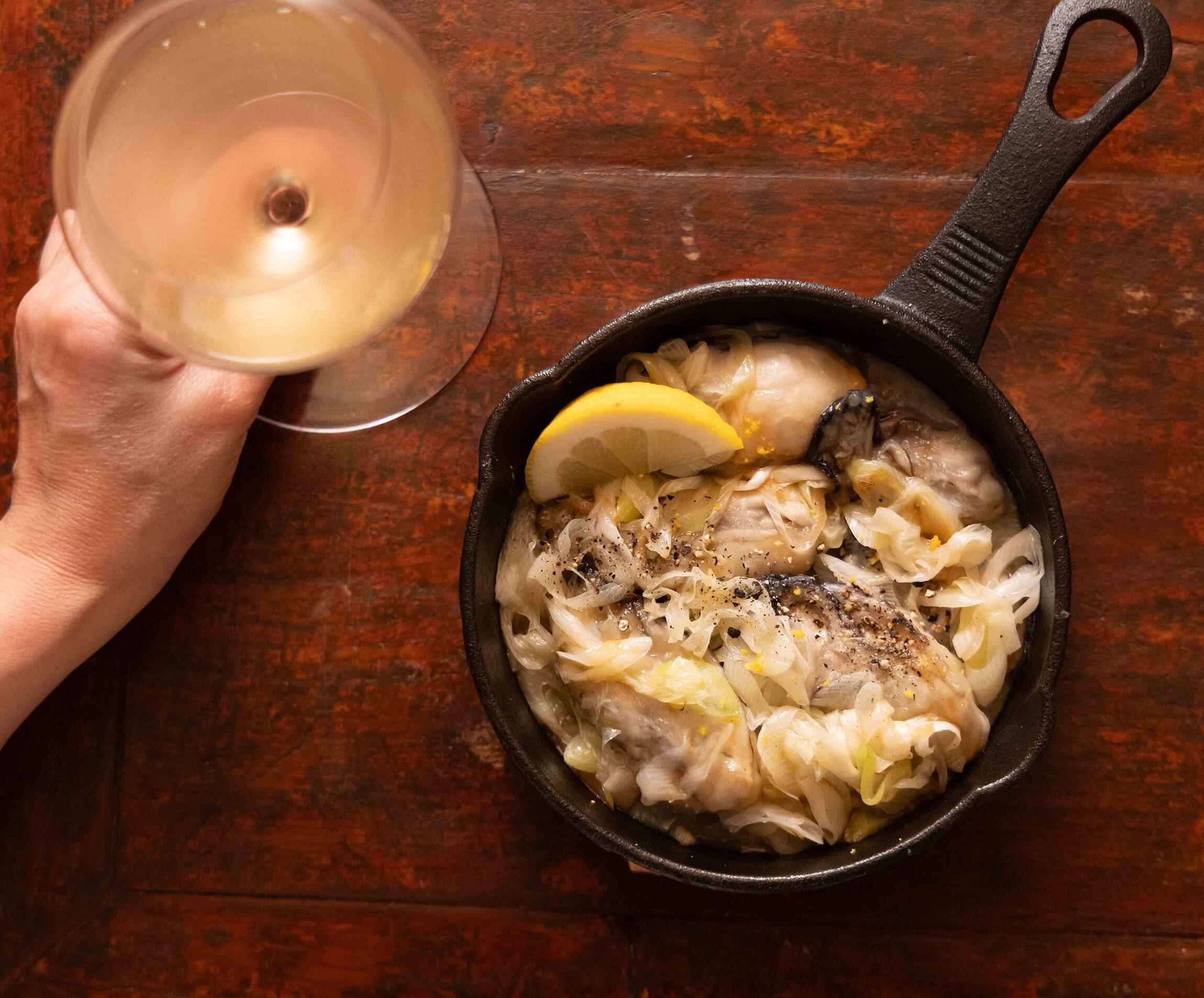 つくり方は簡単で、白ねぎをオリーブオイルで炒め、上に牡蠣を並べてワイン蒸しにするだけ。牡蠣に片栗粉をまぶすことがポイントで、このひと手間でバターと醤油の味が牡蠣によくからみ、身が縮まず、つるんとしてふんわり。とろとろのねぎと一緒にいただくと、甘味が増し、思わず唸ってしまう美味しさです。レモンの皮や果汁、黒胡椒を足すだけでさらに味変し、すっきりとした味わいに。よく冷えたシャルドネが、牡蠣にもバター醤油にもぴったり寄り添います。