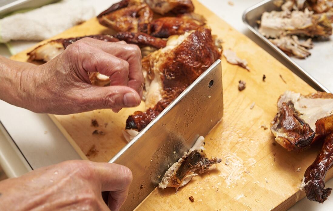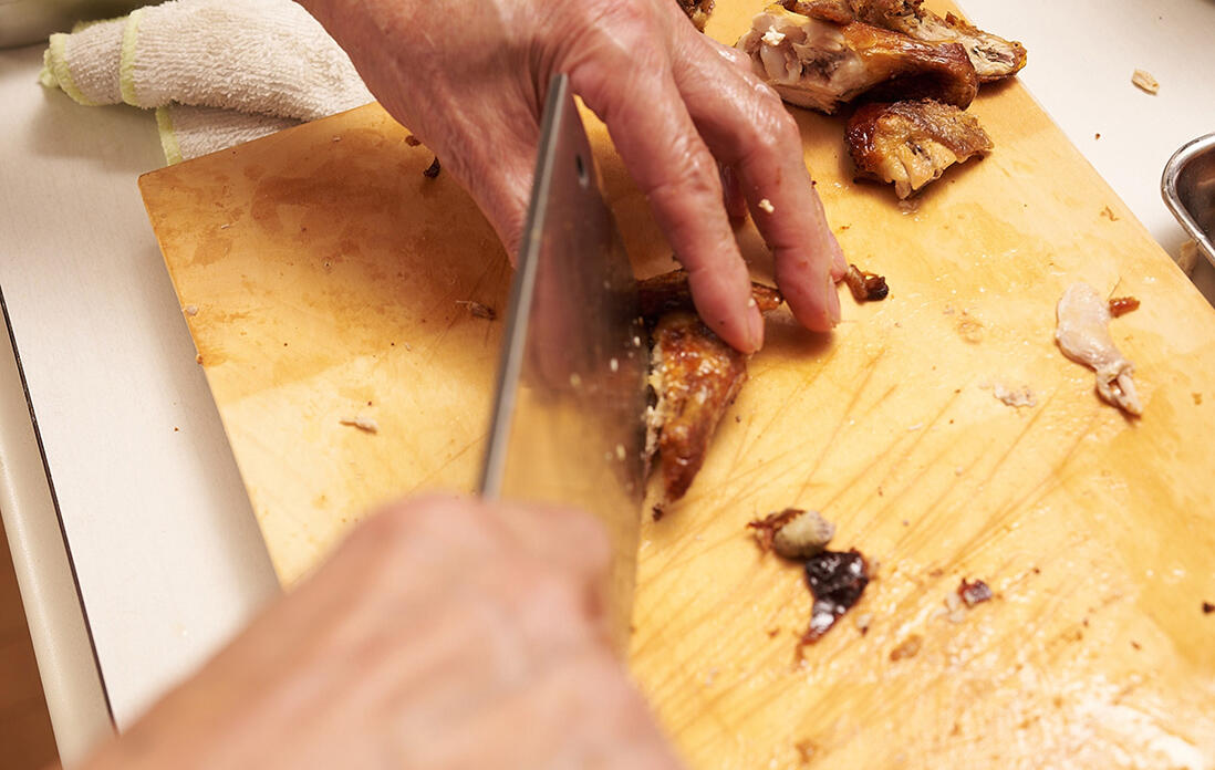 中国料理研究部のケータリングでも人気の料理で、忙しいときは1日に100羽の鶏を仕込むこともあった。ドラム缶におがくずをのせた七輪を置き、鶏を数羽吊るし、蓋をして燻す。聖堂の中庭で、山本さんは数え切れないほどの米燻鶏をつくったという。