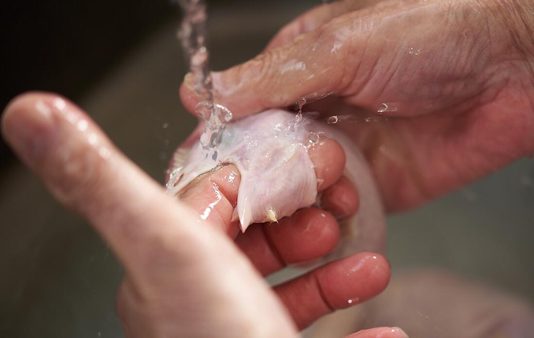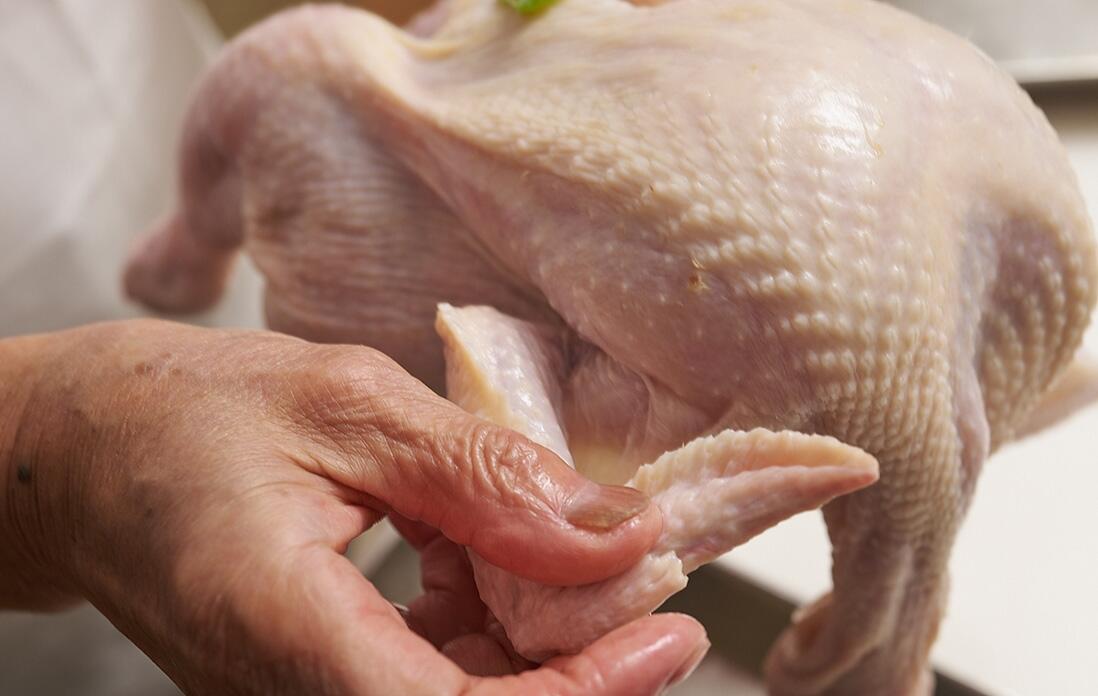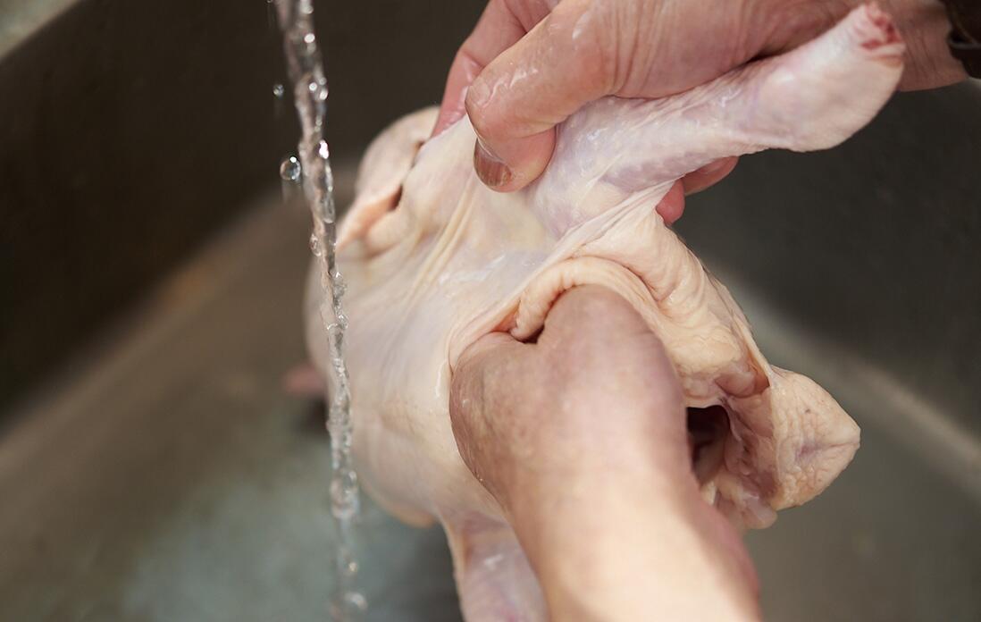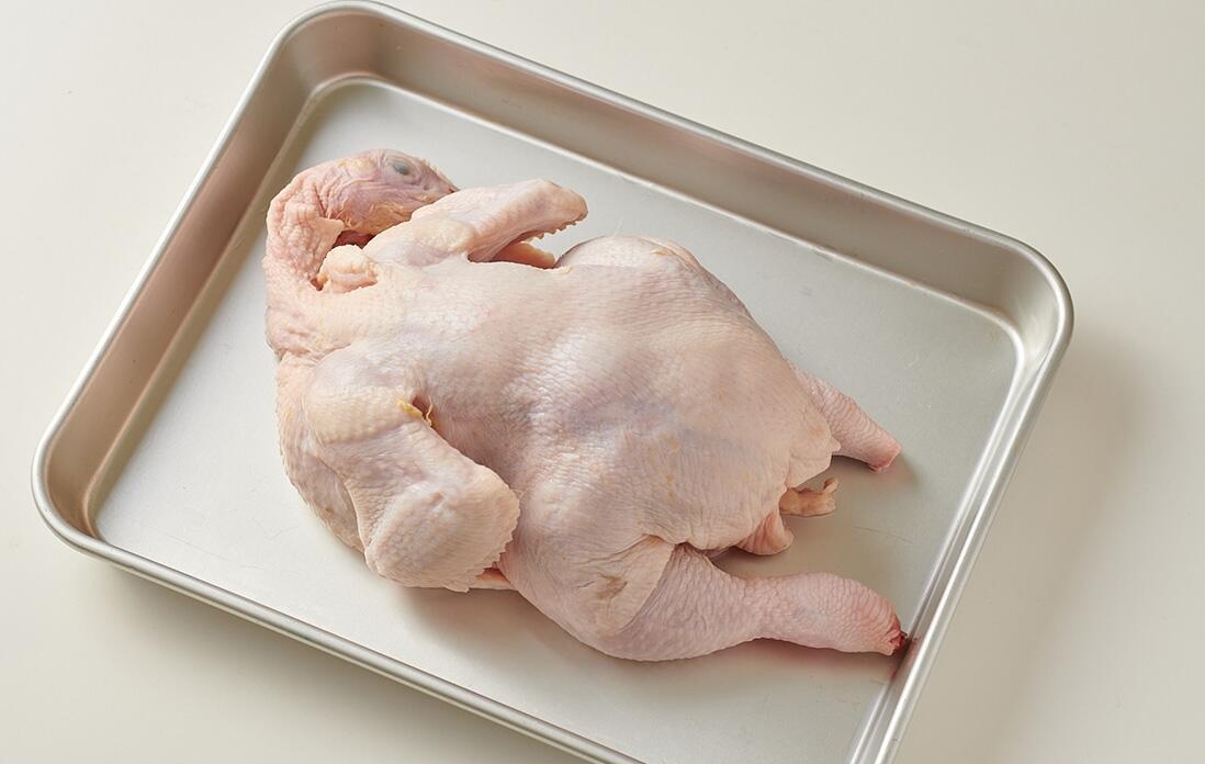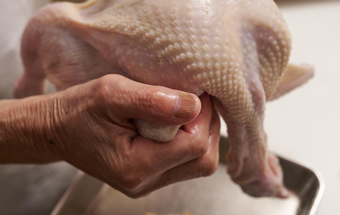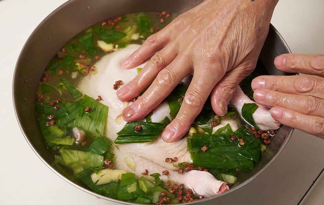 鶏はくちばしを取り除き、口と腹の中をきれいによく水洗いをし、ペーパーなどで水気を拭き取る。1の漬け汁の入ったボウルに鶏を入れ、ラップをかけ、冷蔵庫に入れ、7時間ほど漬ける。保存袋に入れて漬けてもよい。