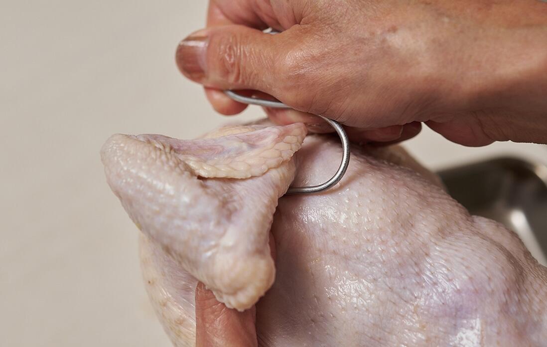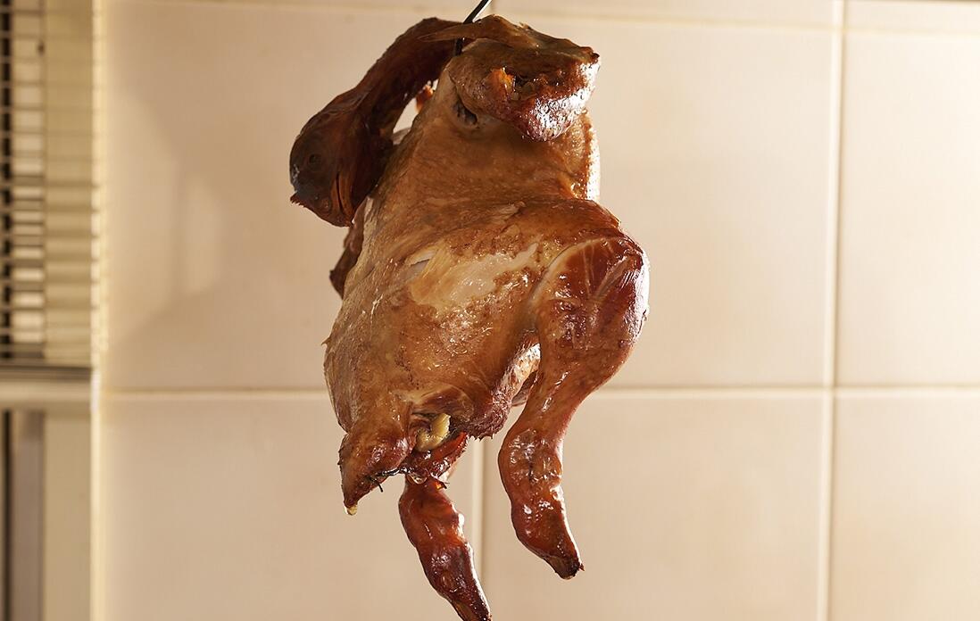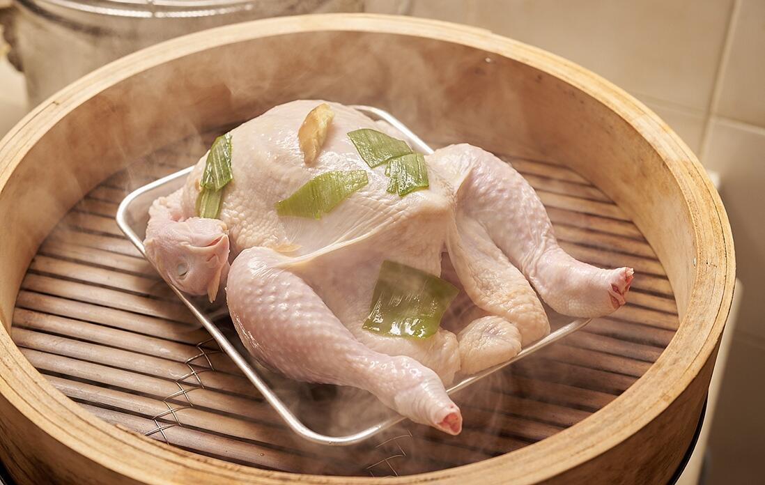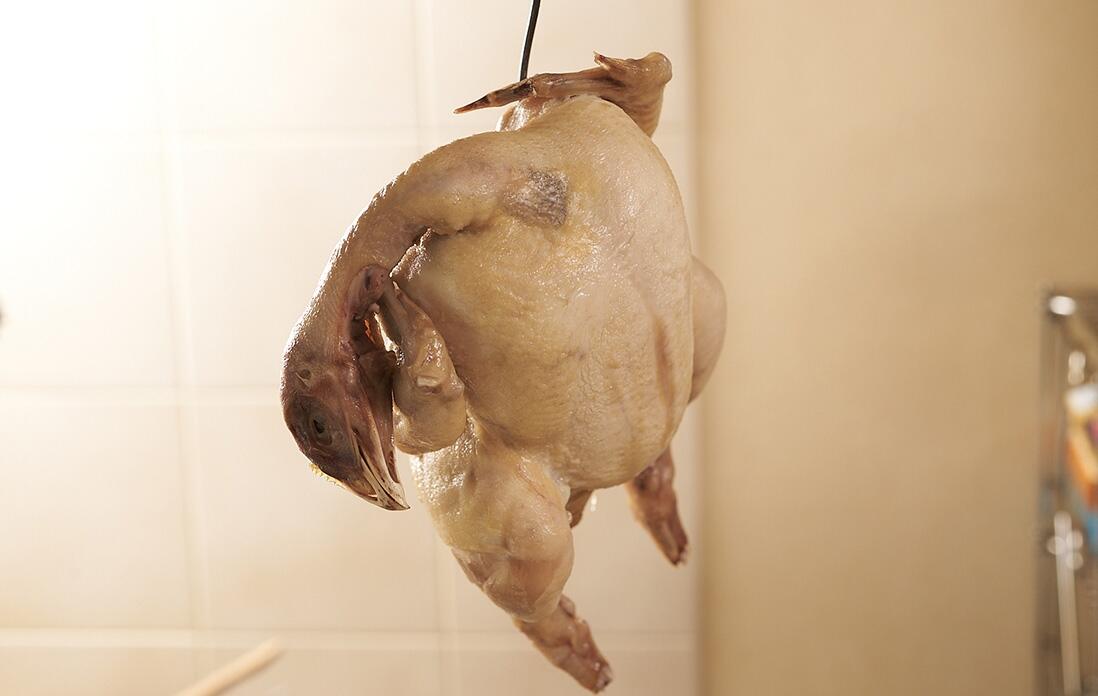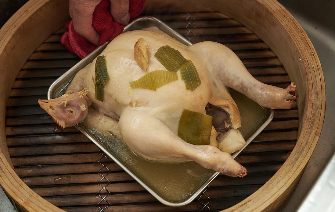 鶏を2のボウルから取り出し、漬け汁を軽く切る。形を整え、S字フックをあらかじめ差し込み、バットにのせる。蒸し器に入れ、強火で約30分蒸して取り出す。水気を切り、風通しのよい日陰に吊るす。表皮のしっとり感がなくなり、手で触って乾いていると感じるくらいまで1時間ほどしっかりと干す。