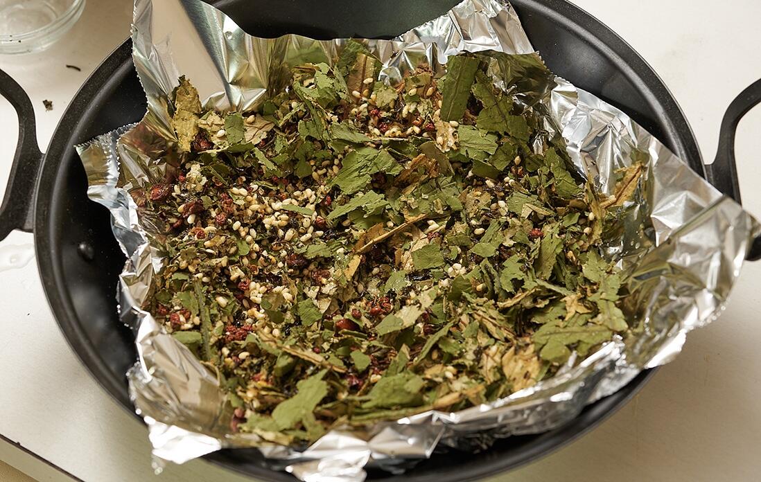 フライパンに米を入れて中火にし、ヘラでかき混ぜながら、乾煎りをする。芯までしっかり火が通るように、時々フライパンを振り、黄金色になるまでじっくり煎る。ボウルに乾煎りした米、砕いた八角、花椒、ジャスミン茶を入れ、蓮の葉をちぎりながら加える。水(分量外、適宜)を少しずつ加えて混ぜ合わせ、湿らせておく。