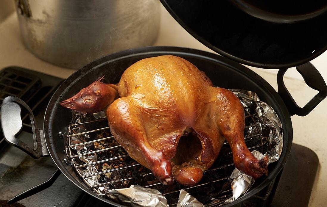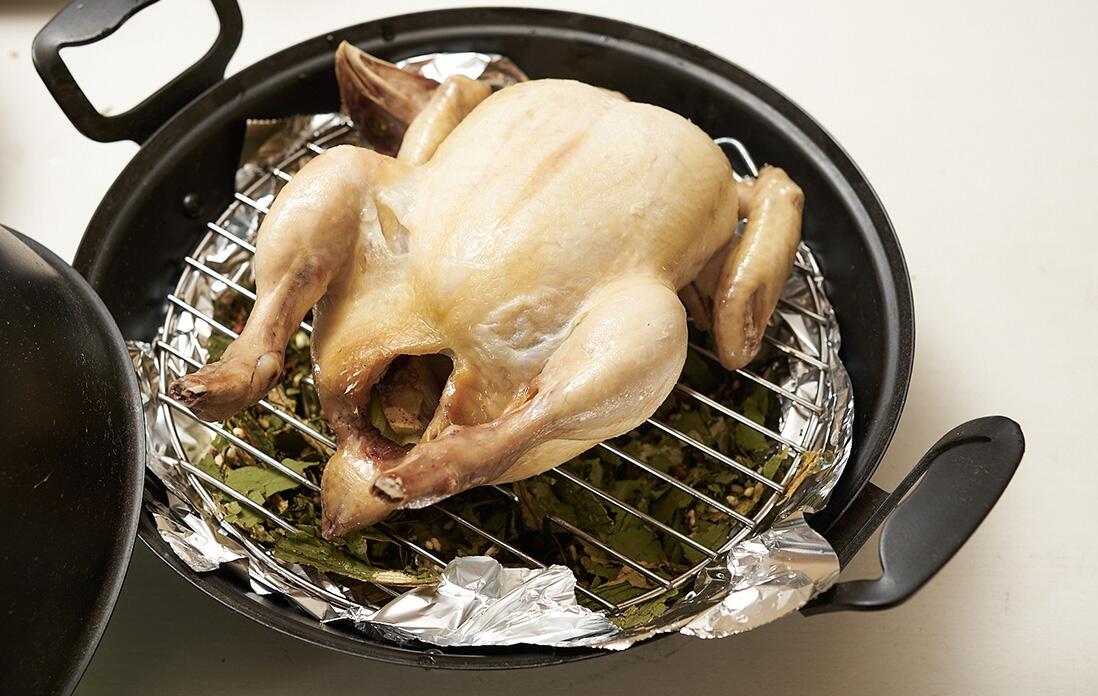 鍋にアルミ箔を敷き、その上に4の燻製材を平らに広げる。網をのせ、2の鶏を置き、蓋をして強火で燻す。煙が出てきたら中火にし、香りが十分に鶏に移り、全体が薄く褐色に色づくまで25分くらい燻す。煙の勢いがないときは水少々を加えるとよい。燻し終えたら鍋から取り出し、コンロのフード下などに吊るし、粗熱が取れ、表皮の水分が飛ぶまで30分前後干す。