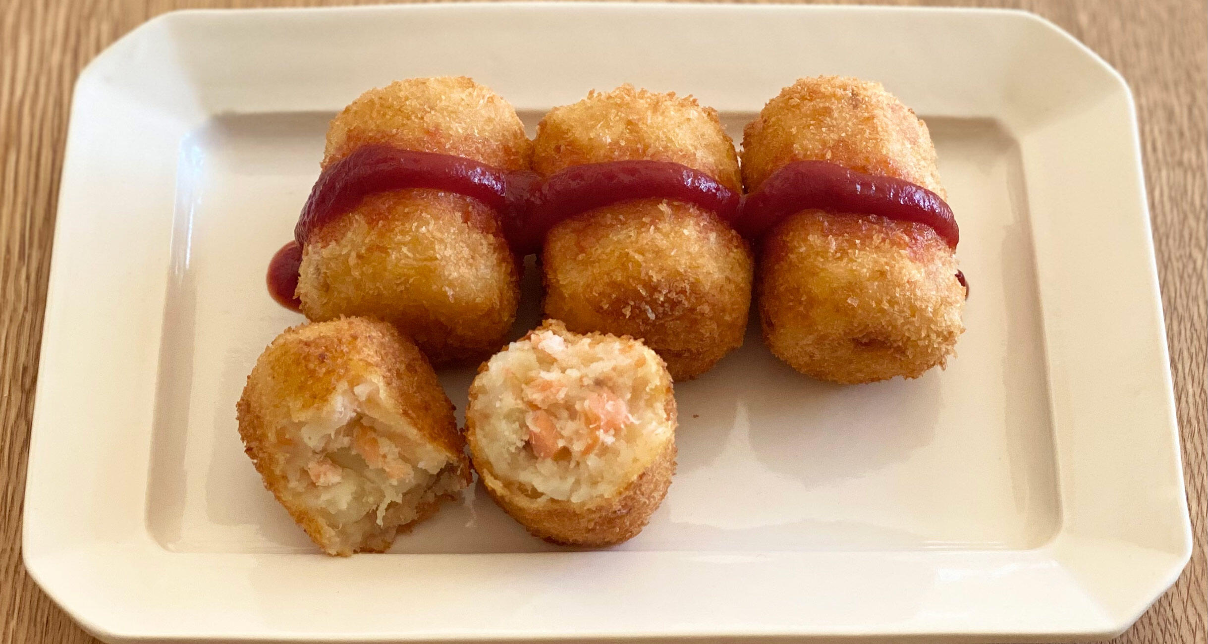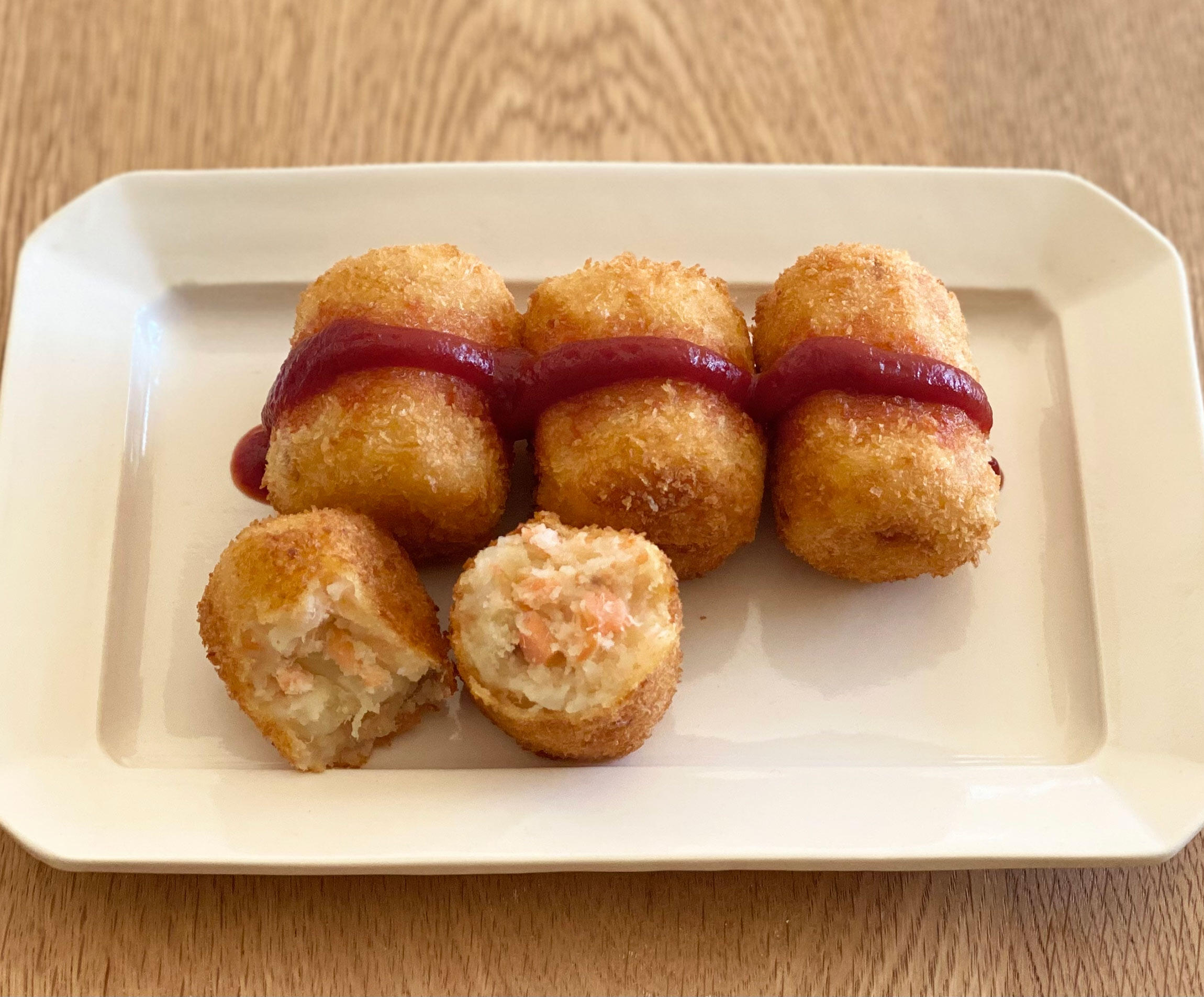 ここに合わせるのは、ソースではなく決まってケチャップ。バッドマナーを詫びておくが、こっそり中身を先に食べ、ケチャップにまみれた衣だけ味わうのも大好きだった。サイズはイメージしていたよりかなり小さめ。子どもが食べやすいようにと、小さな俵型をせっせとつくってくれていたのだなあ。