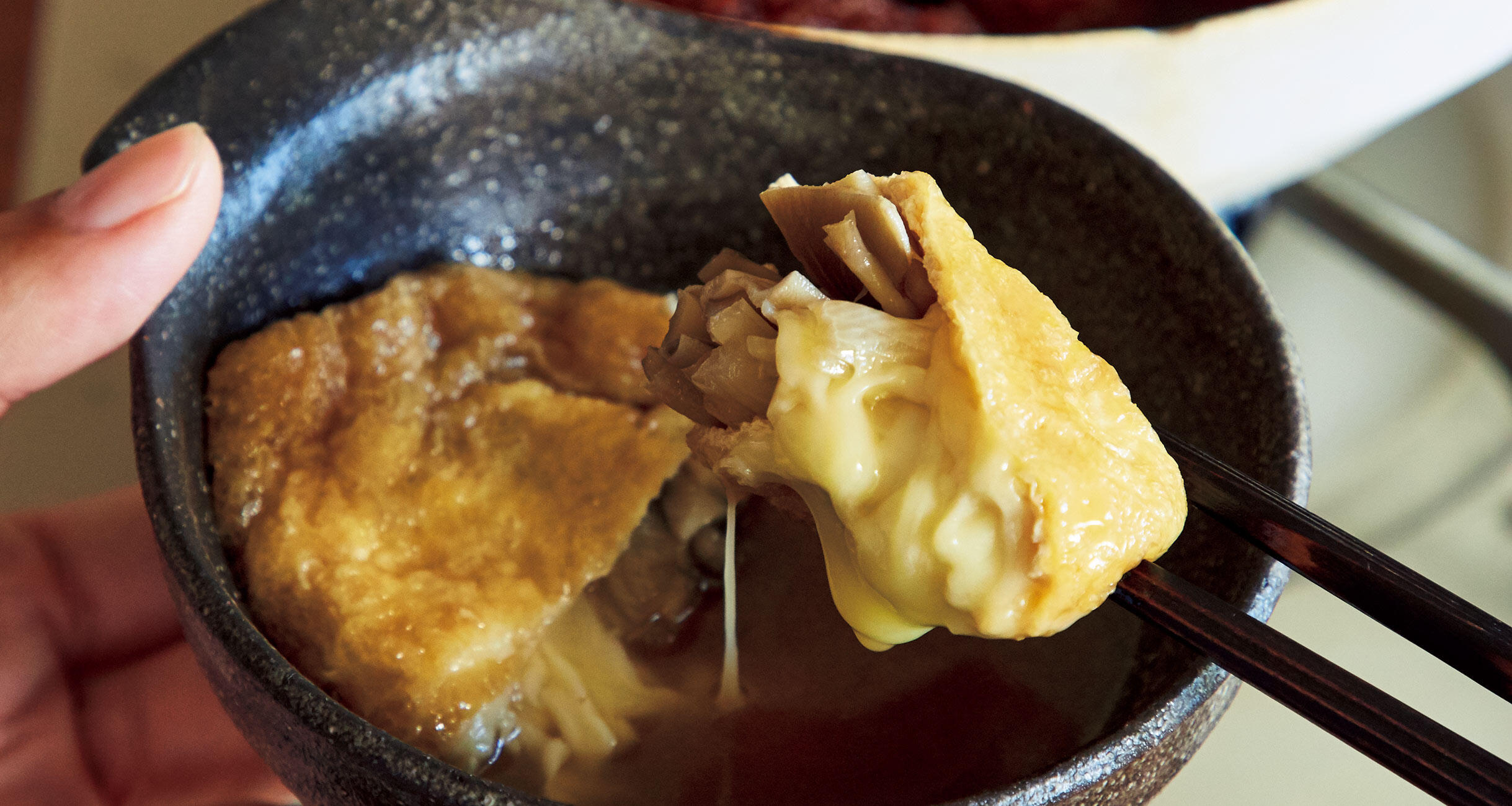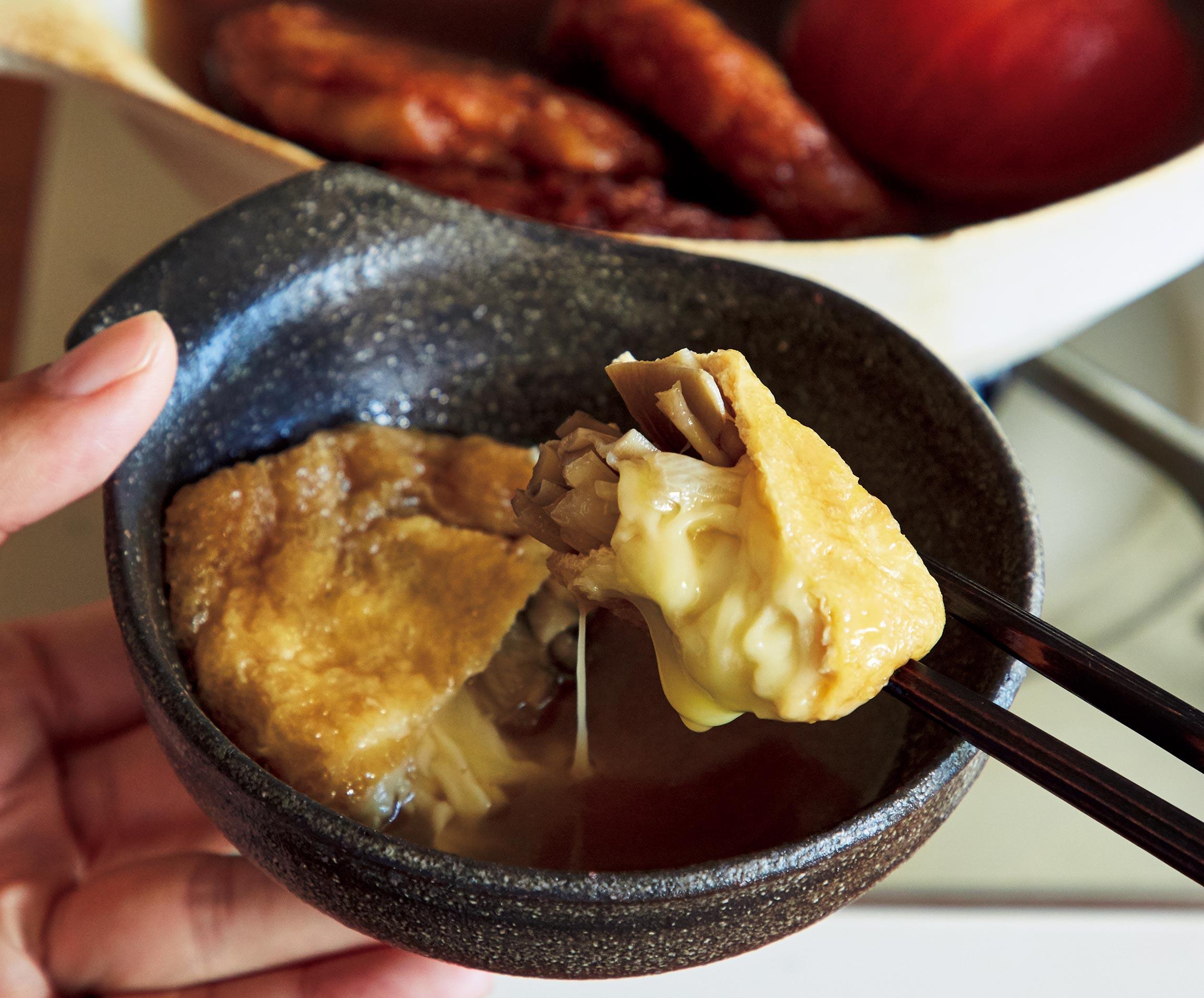 半分に開いた油揚げの一番下にチーズを入れて、その上に別の具材を詰めることで、チーズが外に溶け出さない! 舞茸から出る旨味とトマトの酸味、麺つゆが体中にしみ込む、冬にぴったりの味わい。