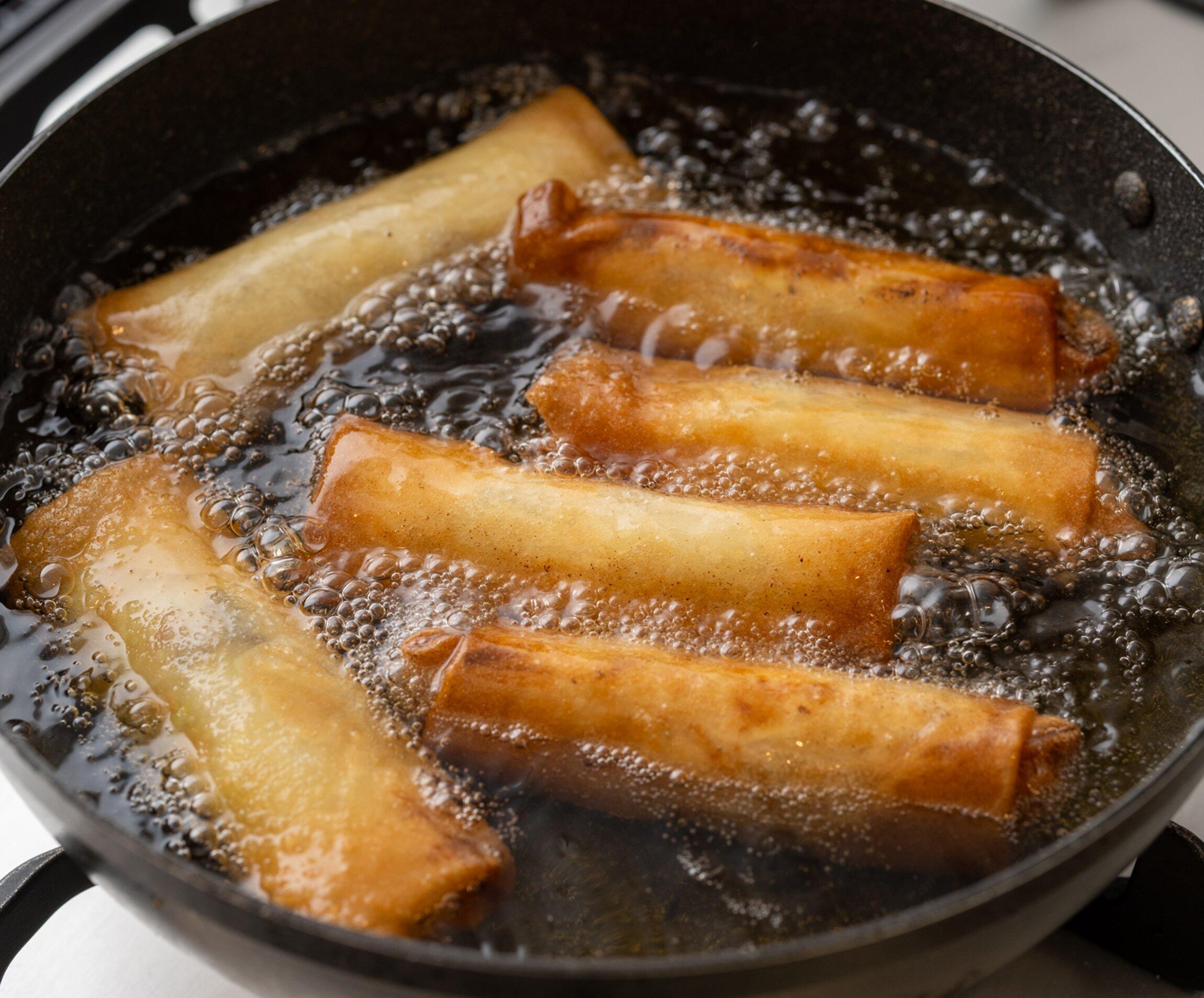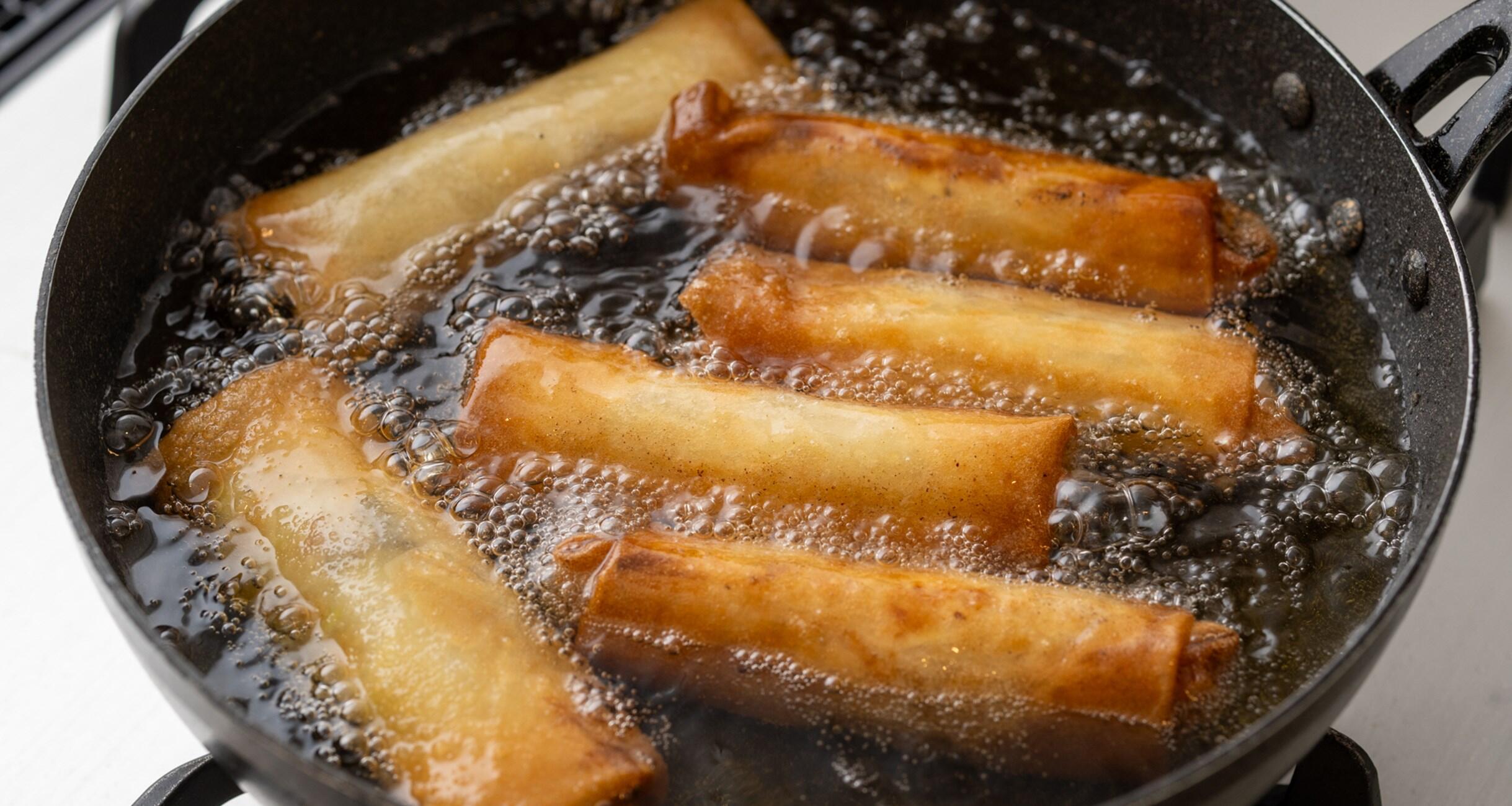 170~180℃に熱した揚げ油で、こんがり色づくまで揚げる。具材から水分が出ないように、巻いたらすぐに揚げるのがコツ。