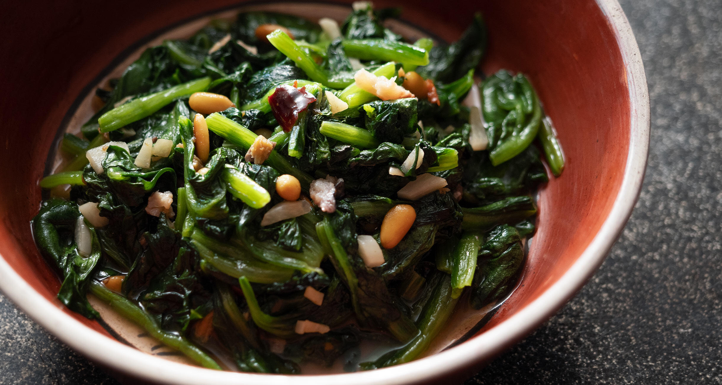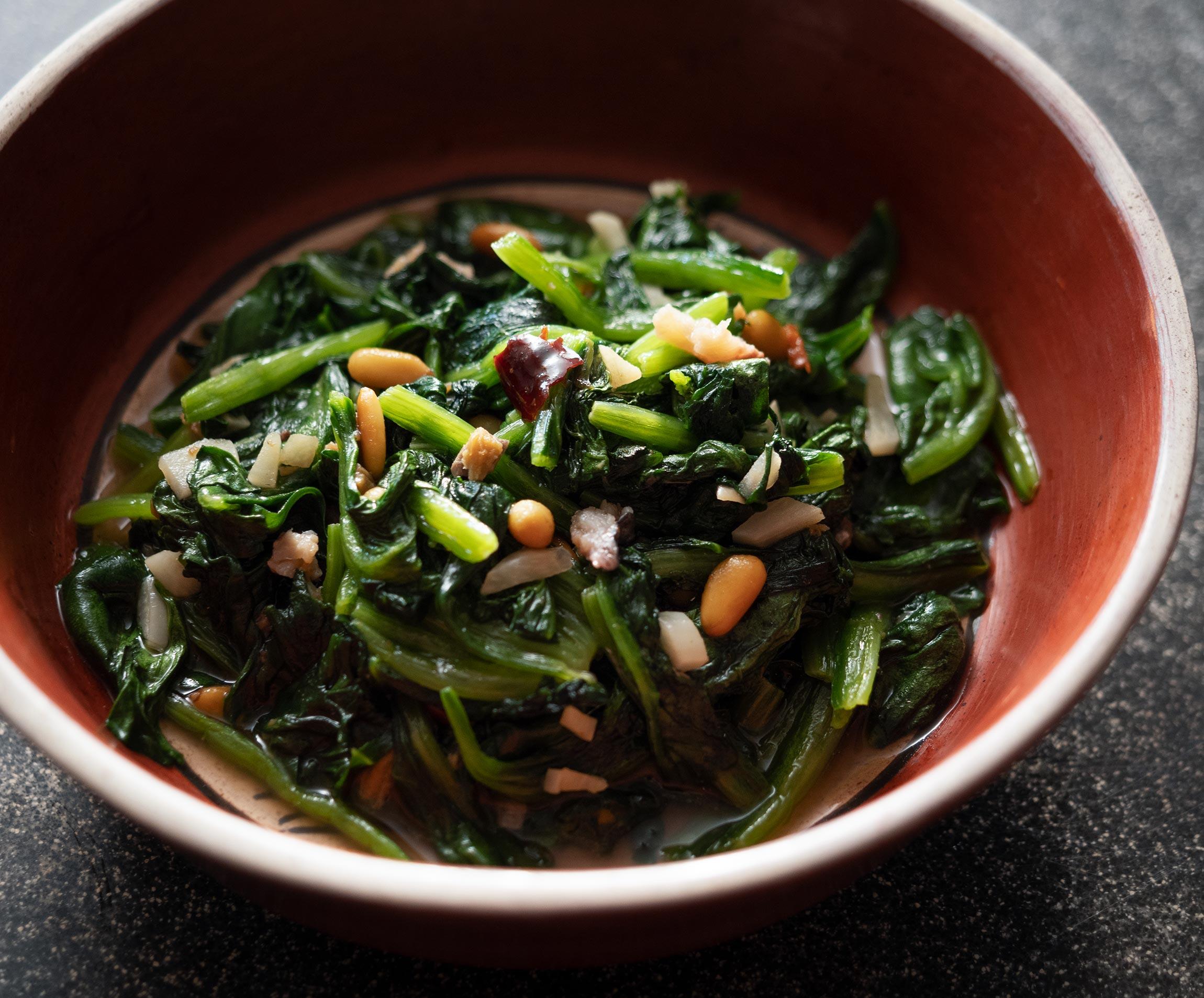 ほうれん草はシャキシャキよりも少し柔らかめにゆでるのがコツ。煎った松の実がまた、いいアクセントになります。