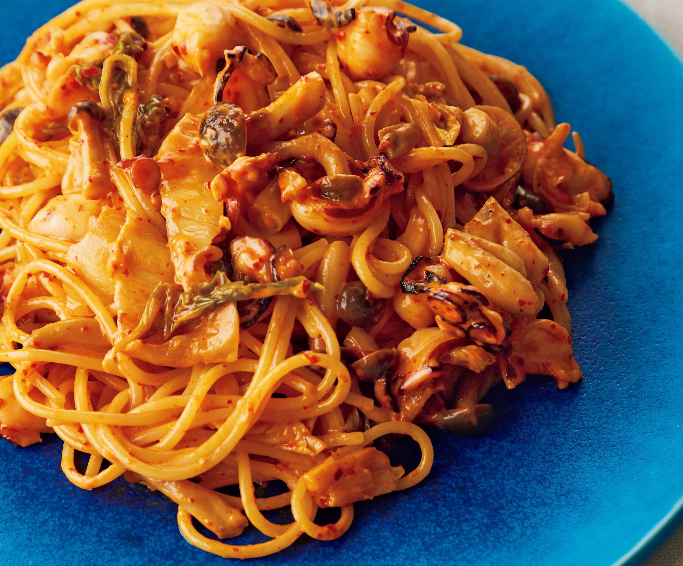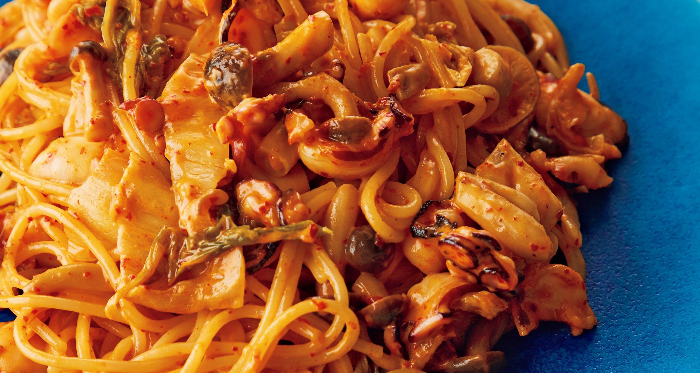 調味もキムチ、旨味出しもキムチ、白菜は野菜の具、と発酵キムチが大活躍!ちょっとジャンクな美味しさも魅力です。料理研究家の大庭英子さんから、発酵食品をプラスして旨味をアップさせる発酵パスタレシピを習いました。