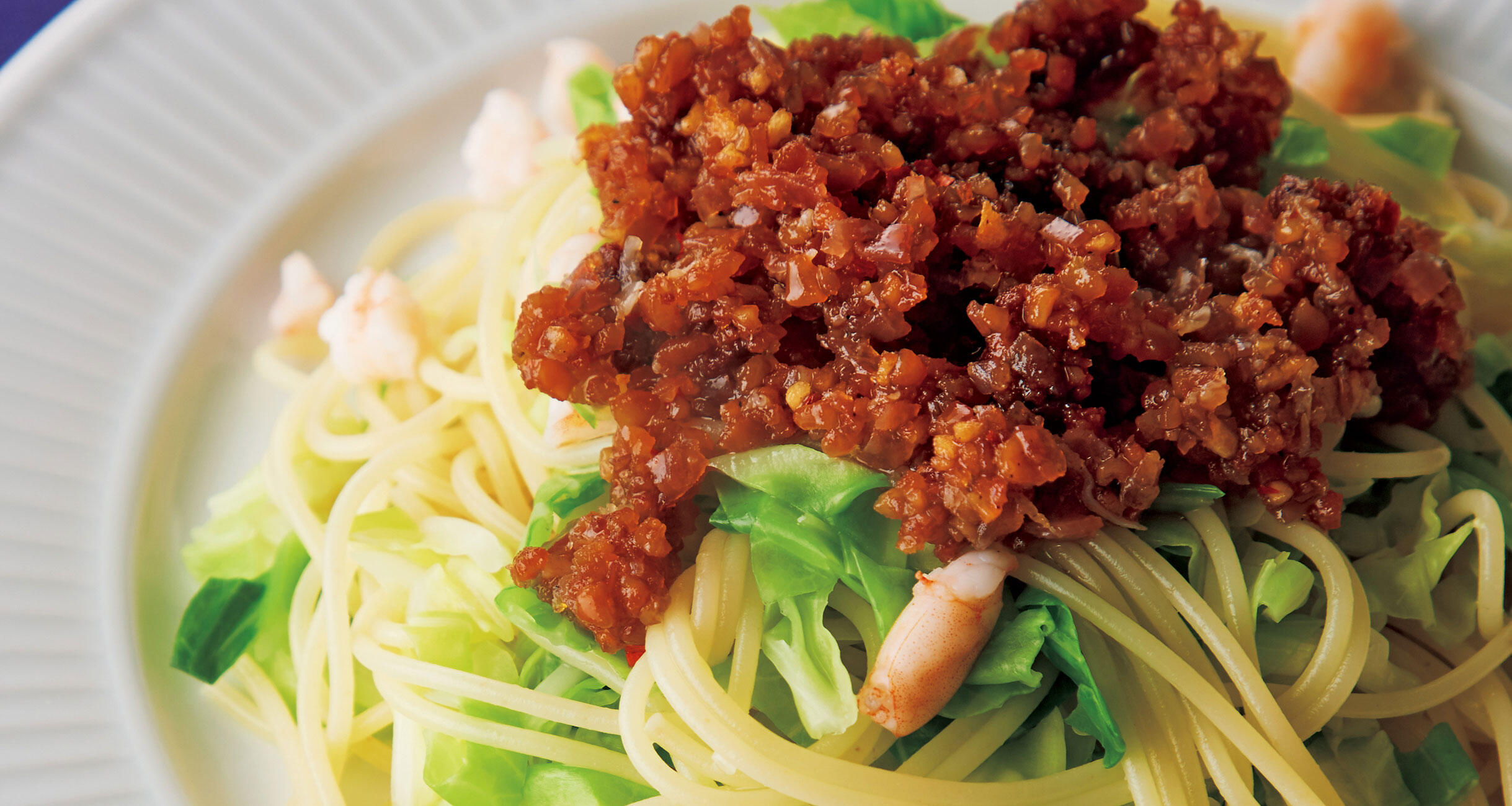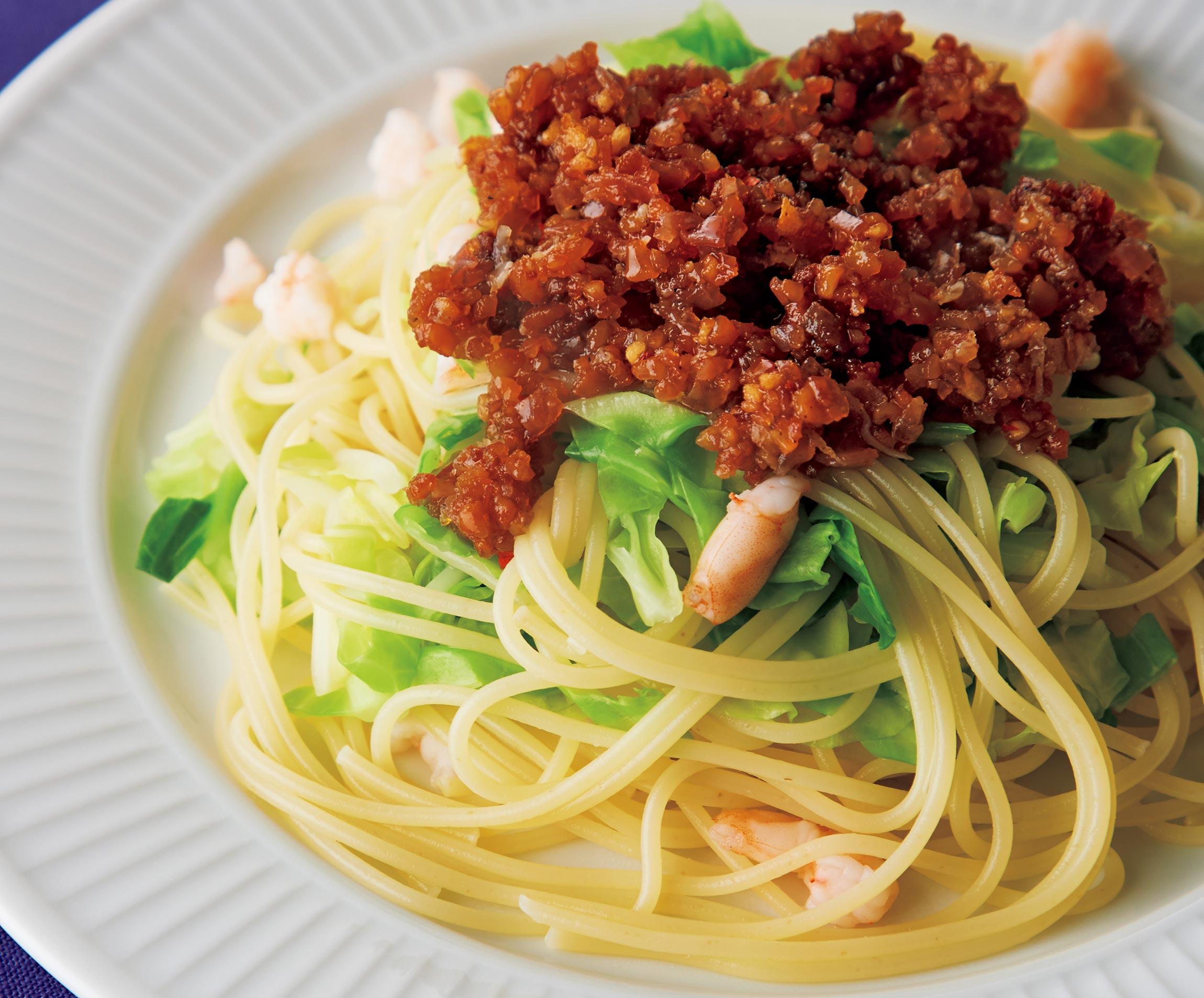 ひきわり納豆でつくった自家製の納豆SALSAが、カリカリと美味しい一品です。海老、キャベツともスパゲッティとともにゆで上げて、器に盛るだけで完成!料理研究家の大庭英子さんから、発酵食品をプラスして旨味をアップさせる発酵パスタレシピを習いました。