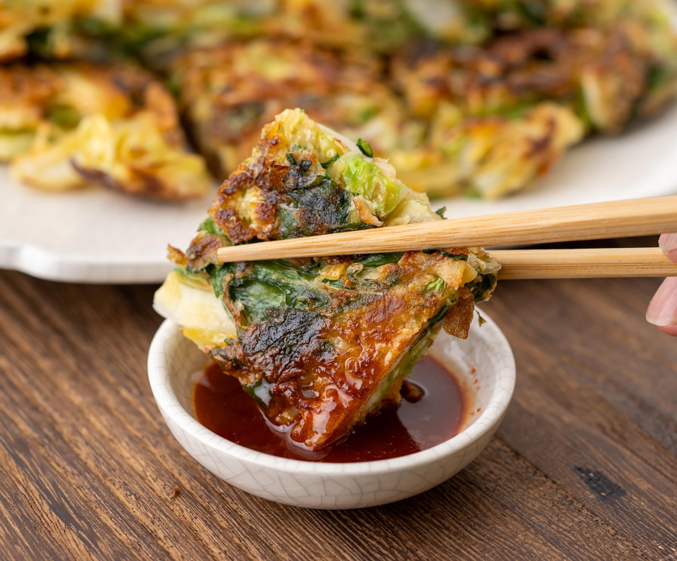 「白菜のシャキシャキとしたおいしさや春菊の香りを楽しみたいので、生地の量は野菜がつながるくらいの少なめがいいんです。まとまらずに焼きにくそうだなと感じたら、薄力粉と片栗粉の量を少しずつ増やしてみてください。それから、すき焼きの煮汁を加えることも大切!これがだしになって、生地の味がおいしくなります」