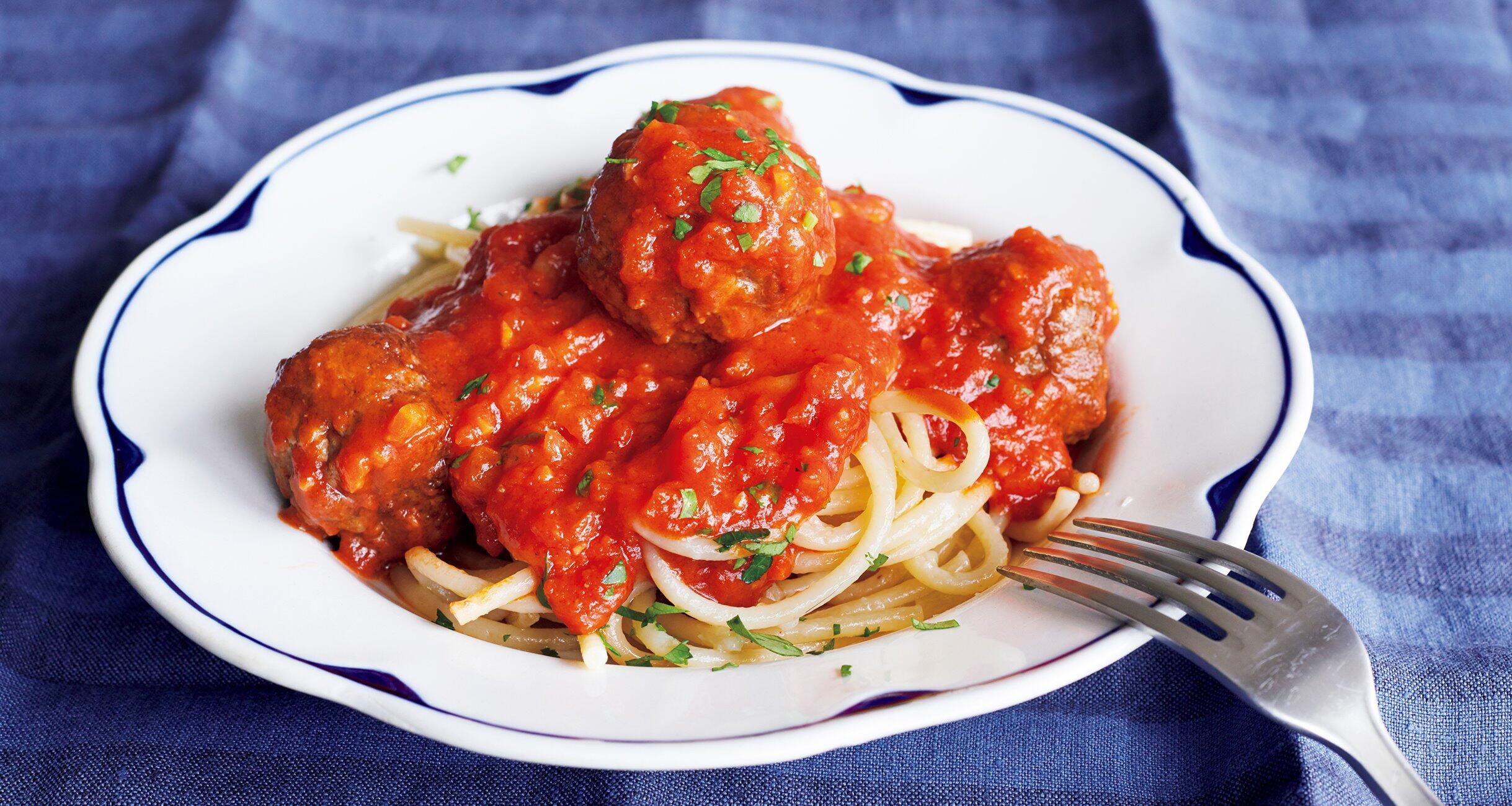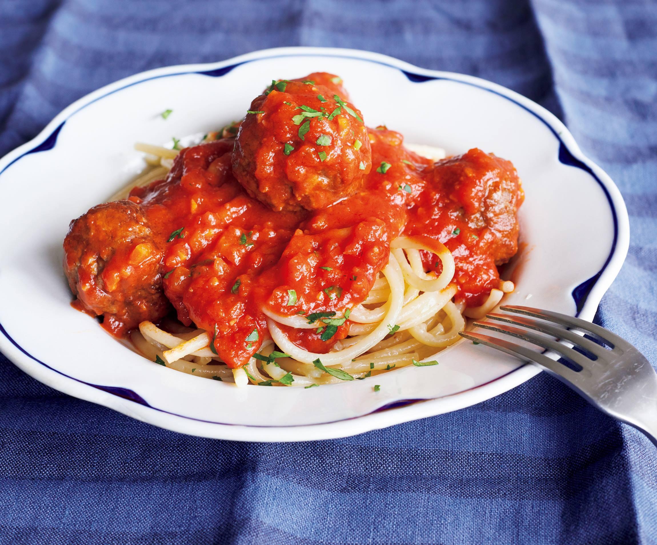 太麺にどどぉんと鎮座するは、3種の挽き肉を合わせた特製ミートボール。香味野菜の風味豊かなトマトソースとともに太麺のおいしさをグンとアップ!ボリューム満点です。料理研究家の坂田阿希子さんに、ご自身が大好きだという太麺パスタのレシピを習いました。