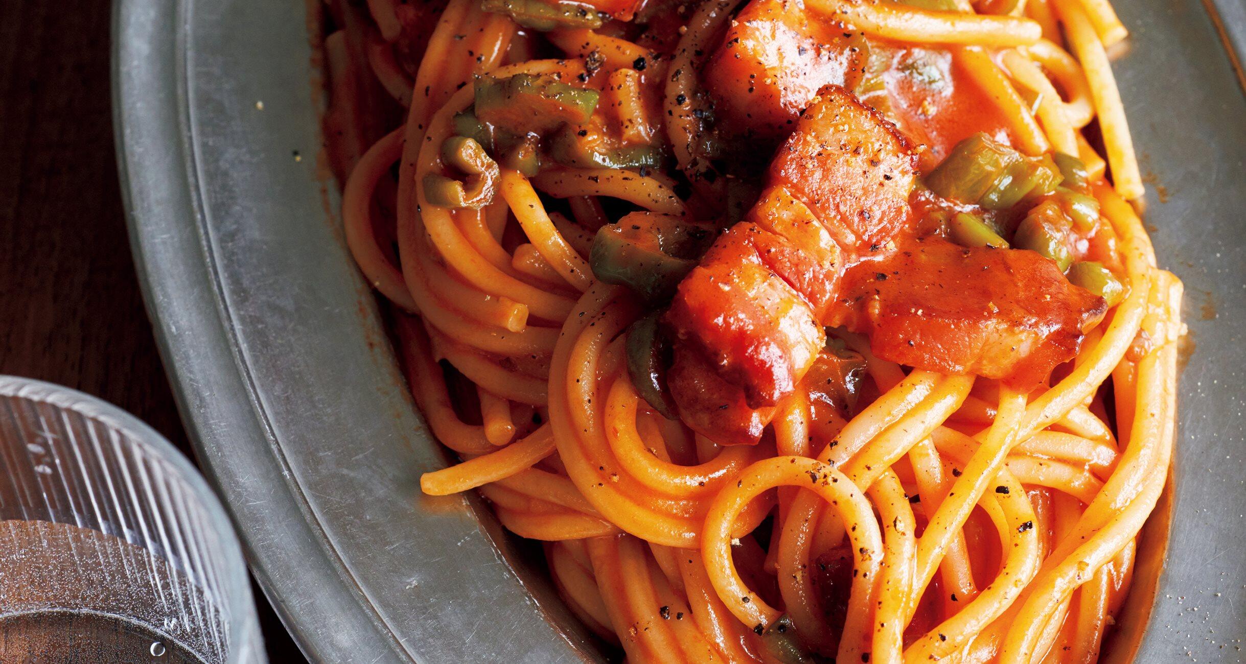 最大のポイントは、スモーキーなベーコンを使うこと。大ぶりに切り、脂をほどよく残すように調理することで、噛みしめるごとにジワッと風味があふれ、バターやトマトベースのソースと相まって濃厚な味わいに。ししとうのシャープな青くささが全体の味をキリリと引き締めます。