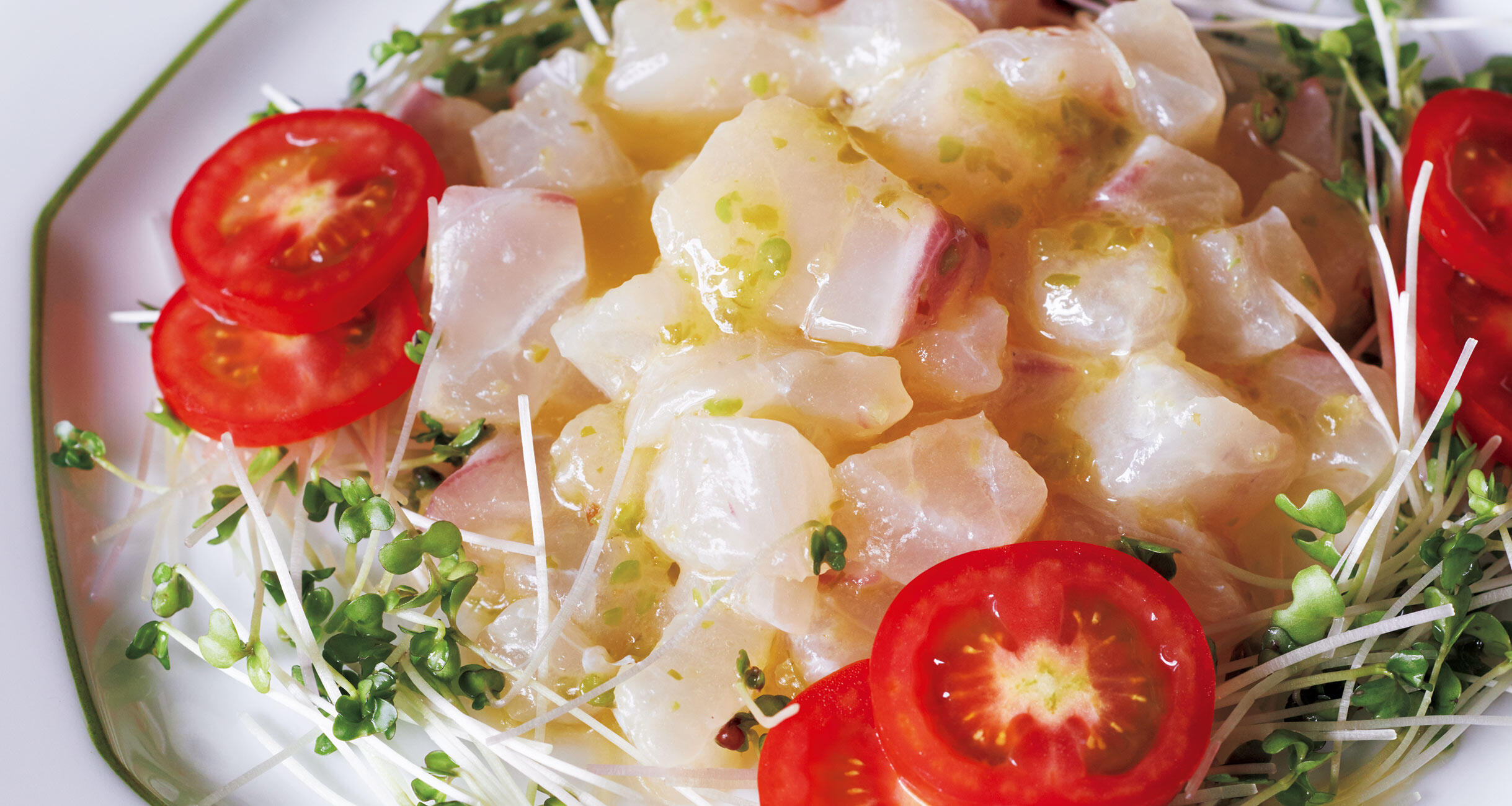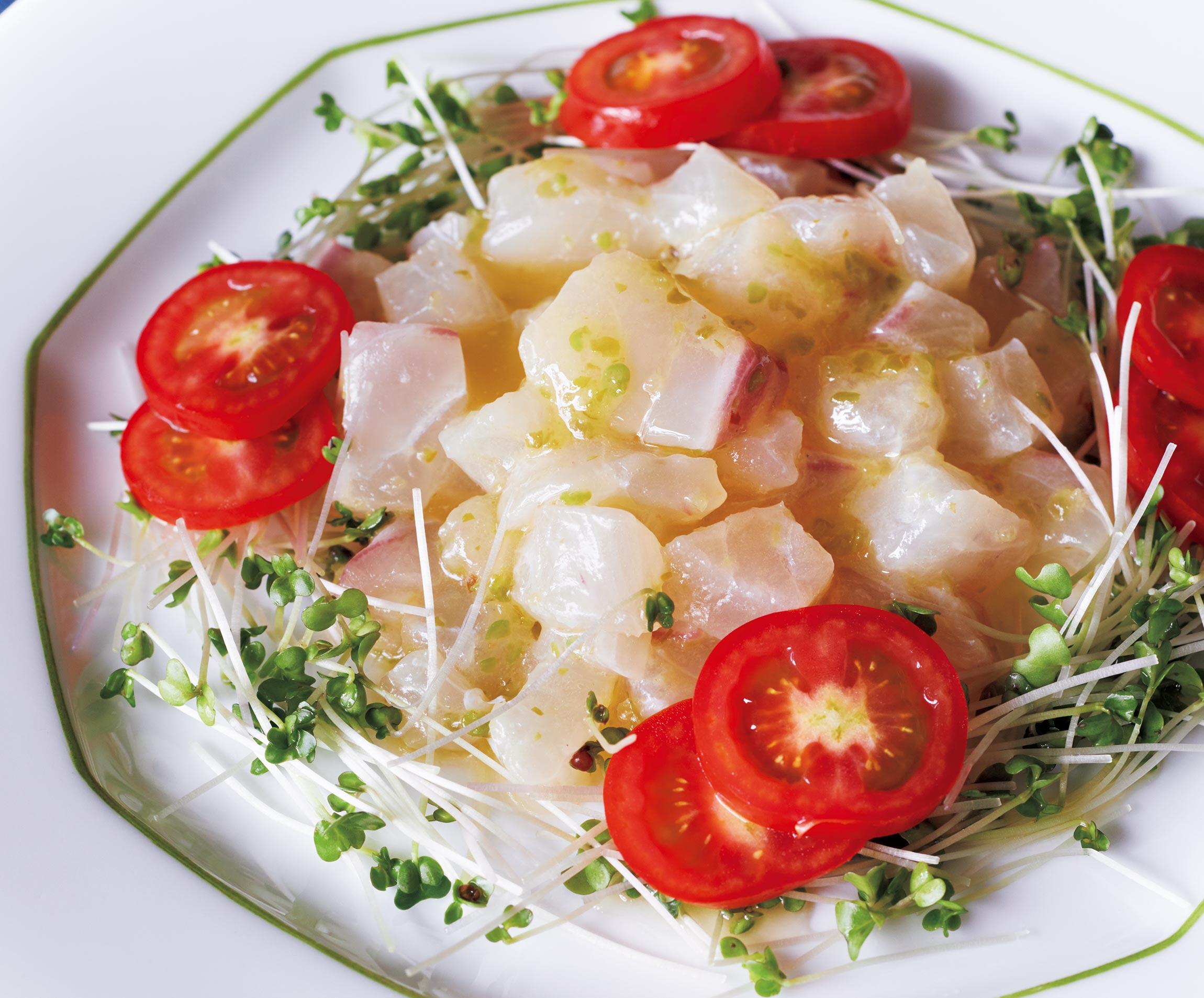 ボウルに溶かしバター、柚子胡椒を入れて混ぜ、刺身魚を入れて和え、器に盛り、スプラウト、トマトを添え、全体を混ぜて食べる。