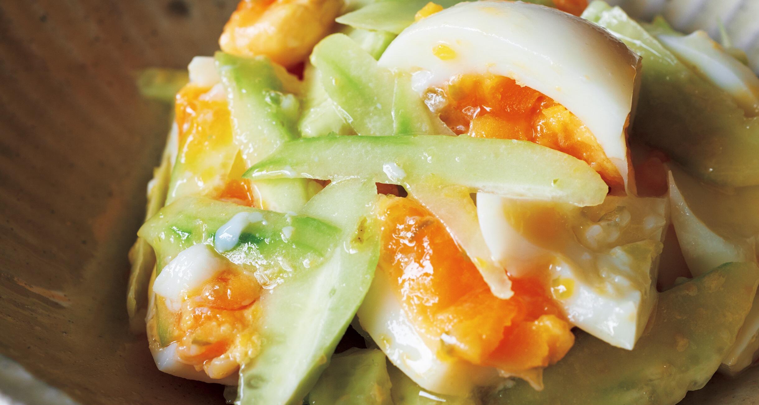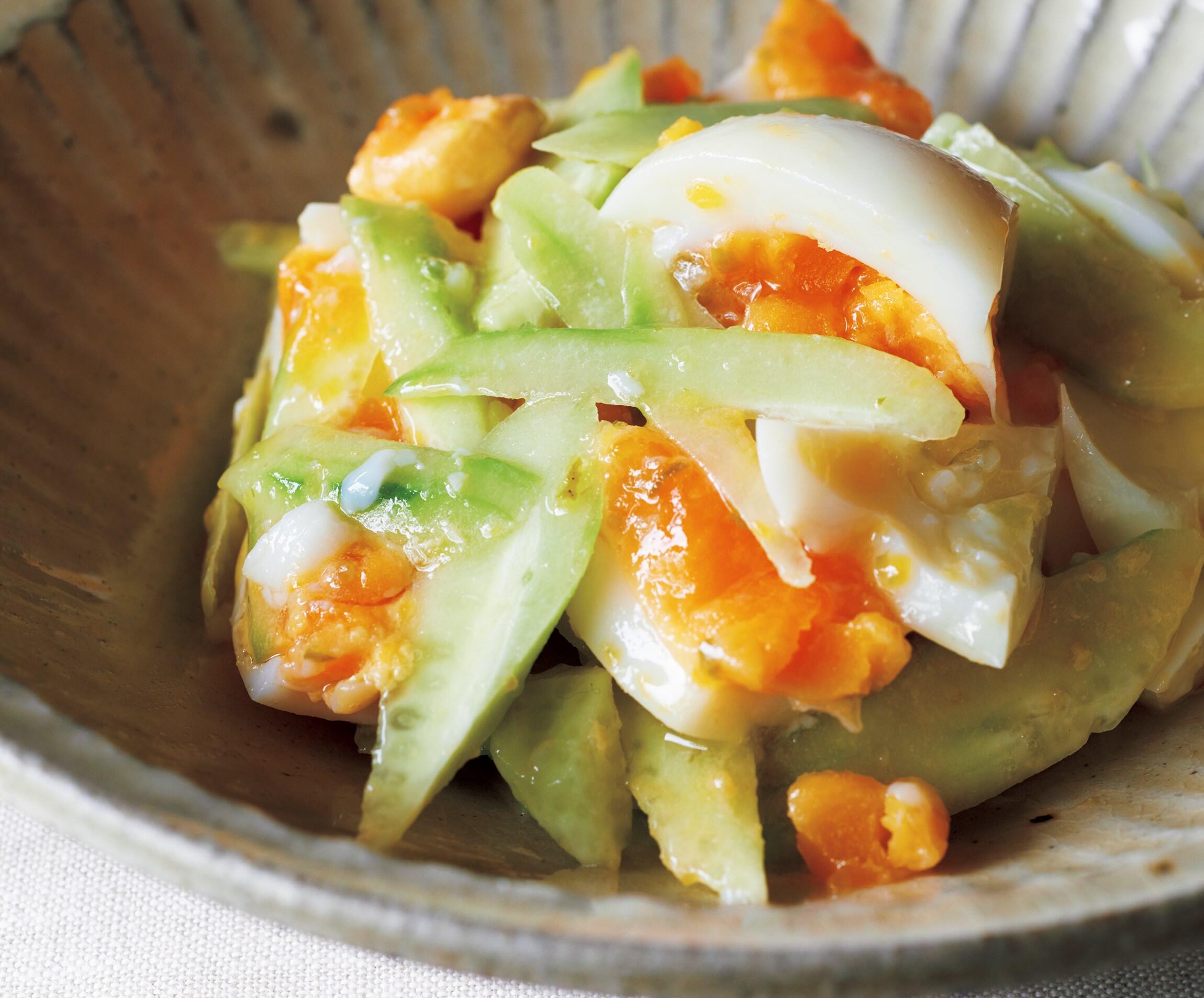 ボウルに溶かしバター、柚子胡椒、醤油を入れて混ぜ、ゆで卵、きゅうりを加えて全体を和える。