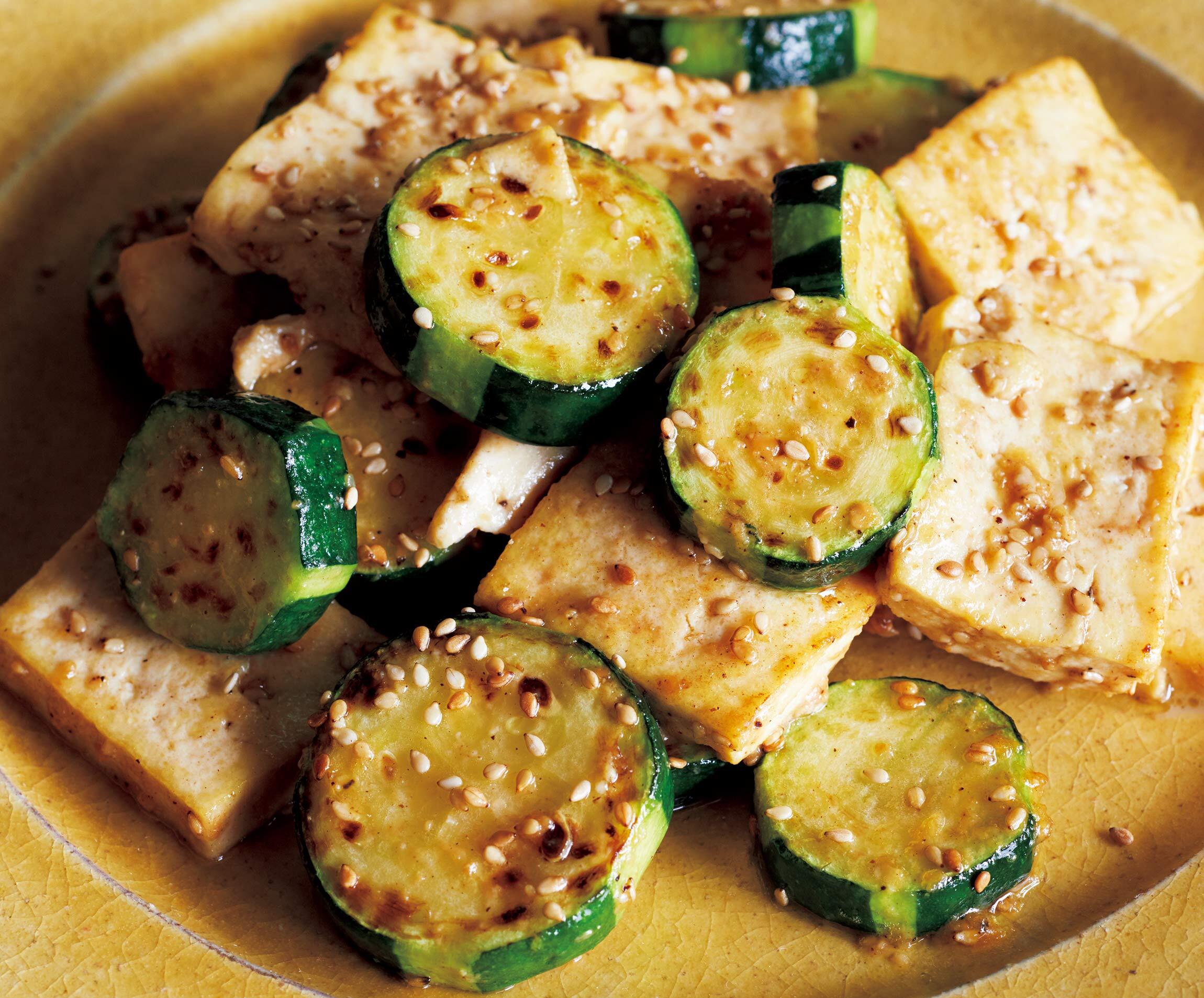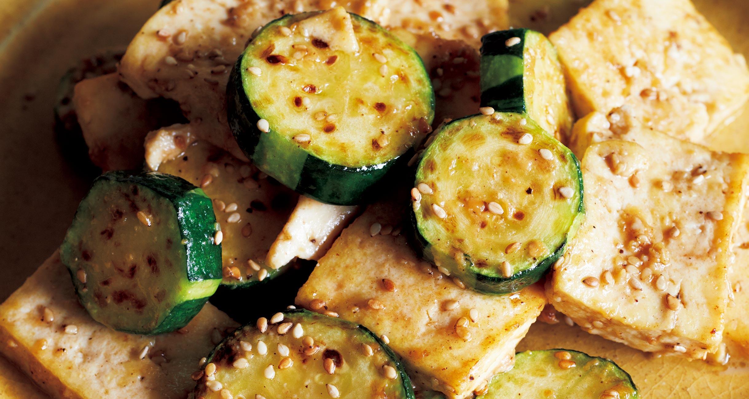 フライパンに残りのバターを溶かして豆腐を入れ、中火で両面を焼きつける。ズッキーニを戻し入れて、を加えて豆腐をくずさないように全体にからめる。器に盛って胡麻をふる。