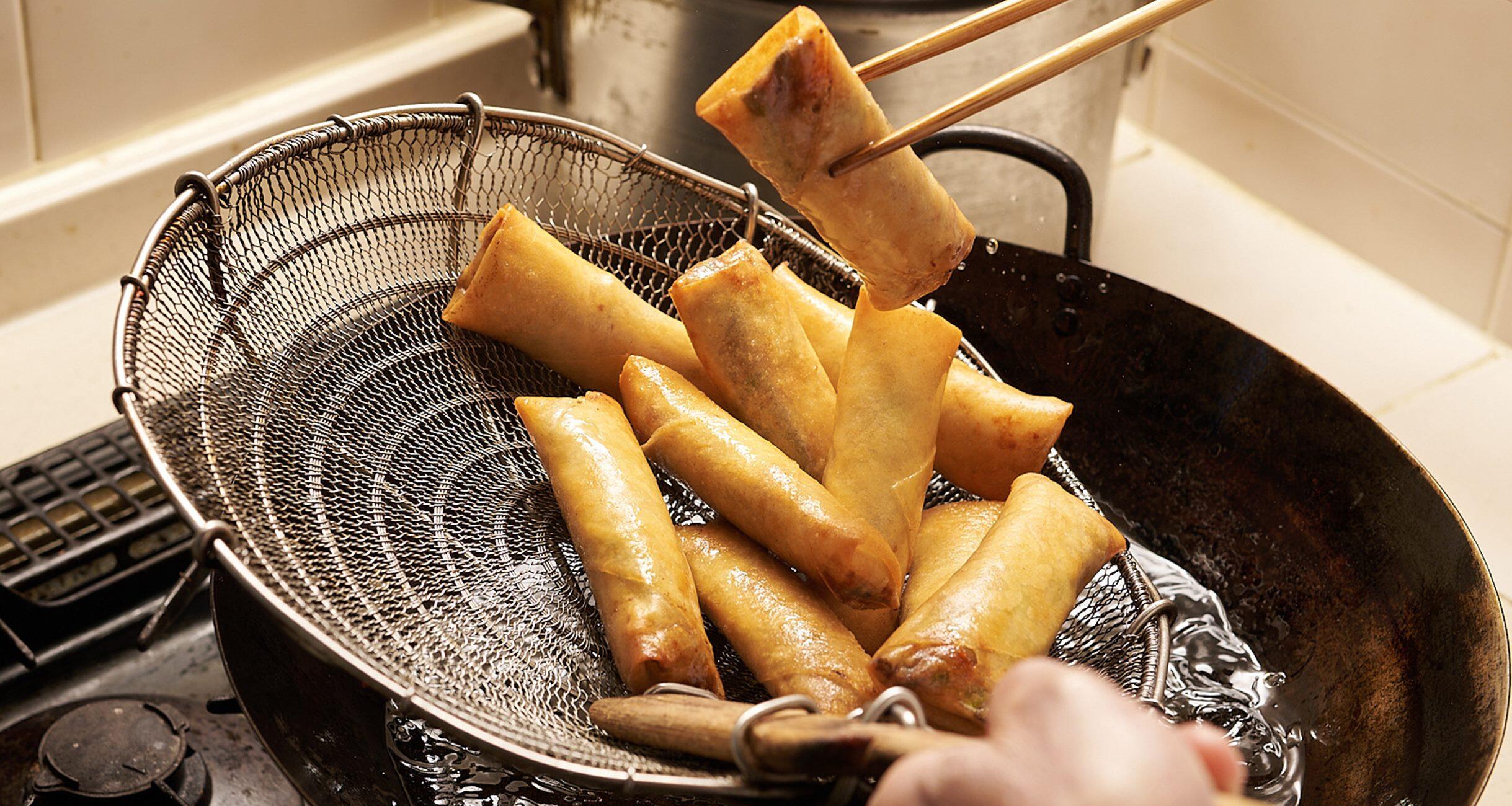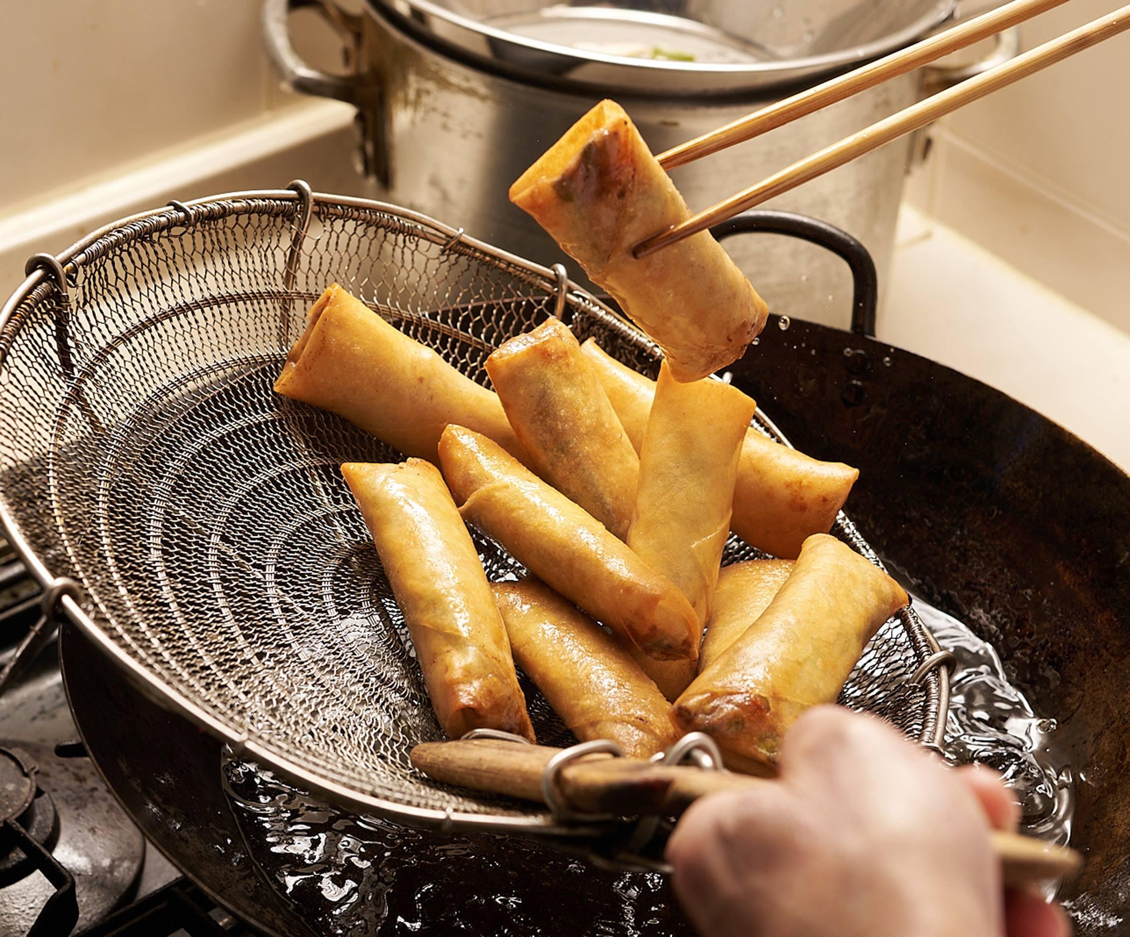 揚げ油を120℃ぐらいの低めの温度に熱し、春巻を鍋肌からすべり入れる。春巻を全部入れると油の温度が下がるので、いったん火を強める。角だけ色づいてきたら油の温度が上がったサイン。火をもとに戻し、160℃くらいの温度を保つ。途中で上下を返し、全体がほどよく色づき、音が小さくなってきたら、仕上げに火を強める。きつね色になったら油をきり、器に盛る。好みで辛子と酢を添える。