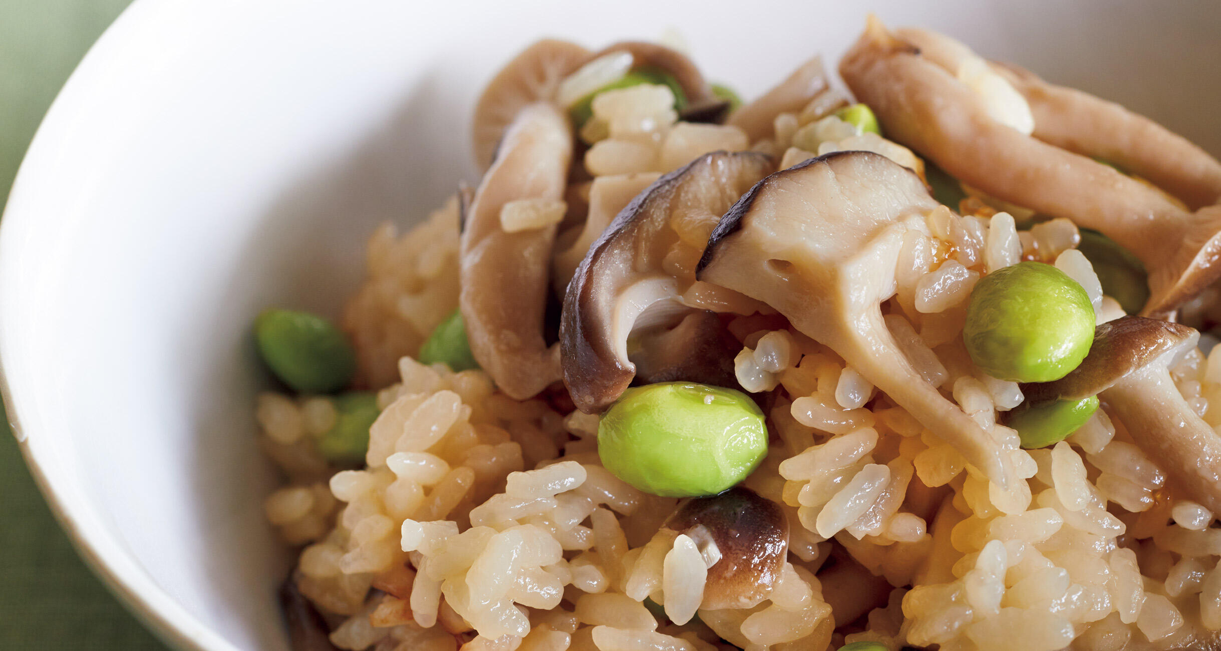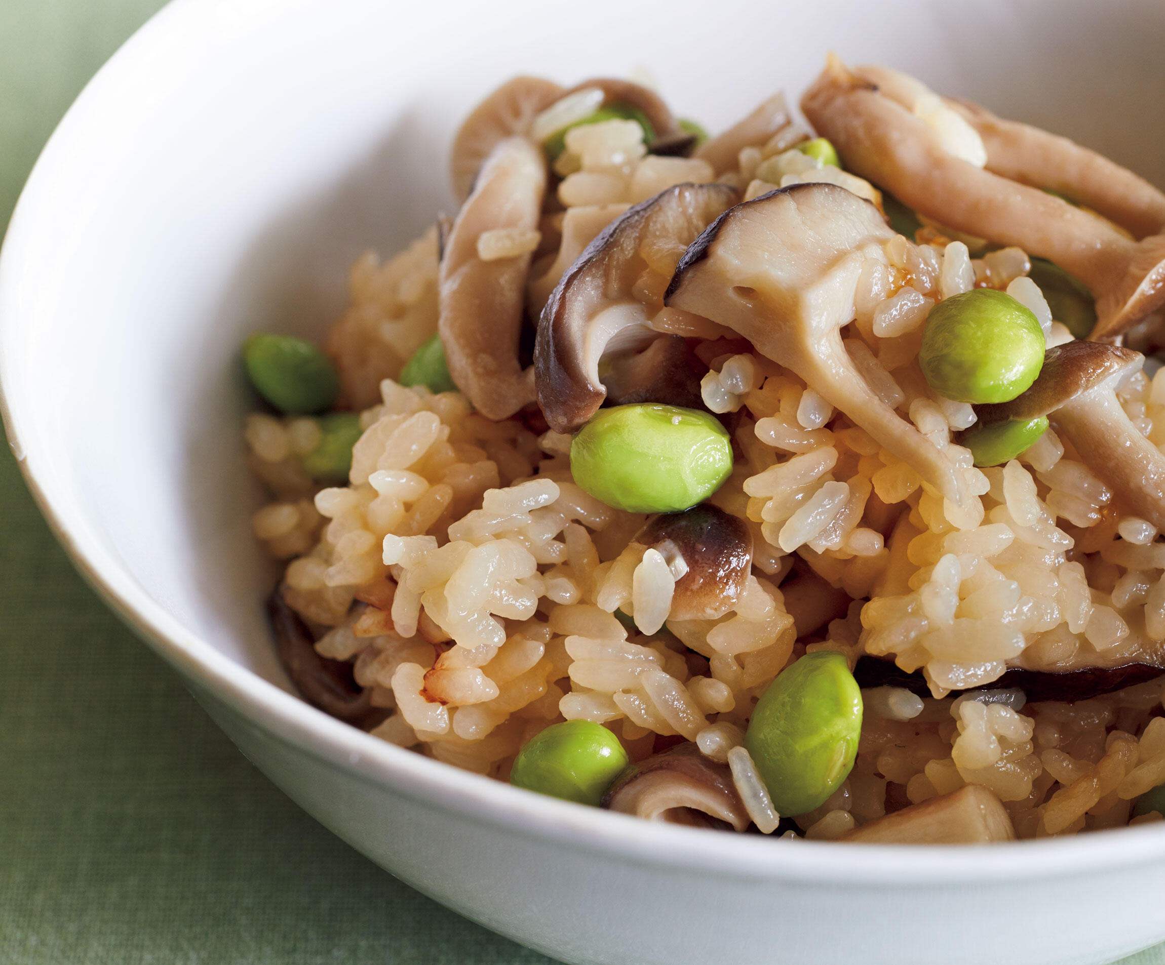 炊飯器に米を入れて水を注ぎ、調味料を加えて混ぜ、きのこ、枝豆をのせて普通に炊く。