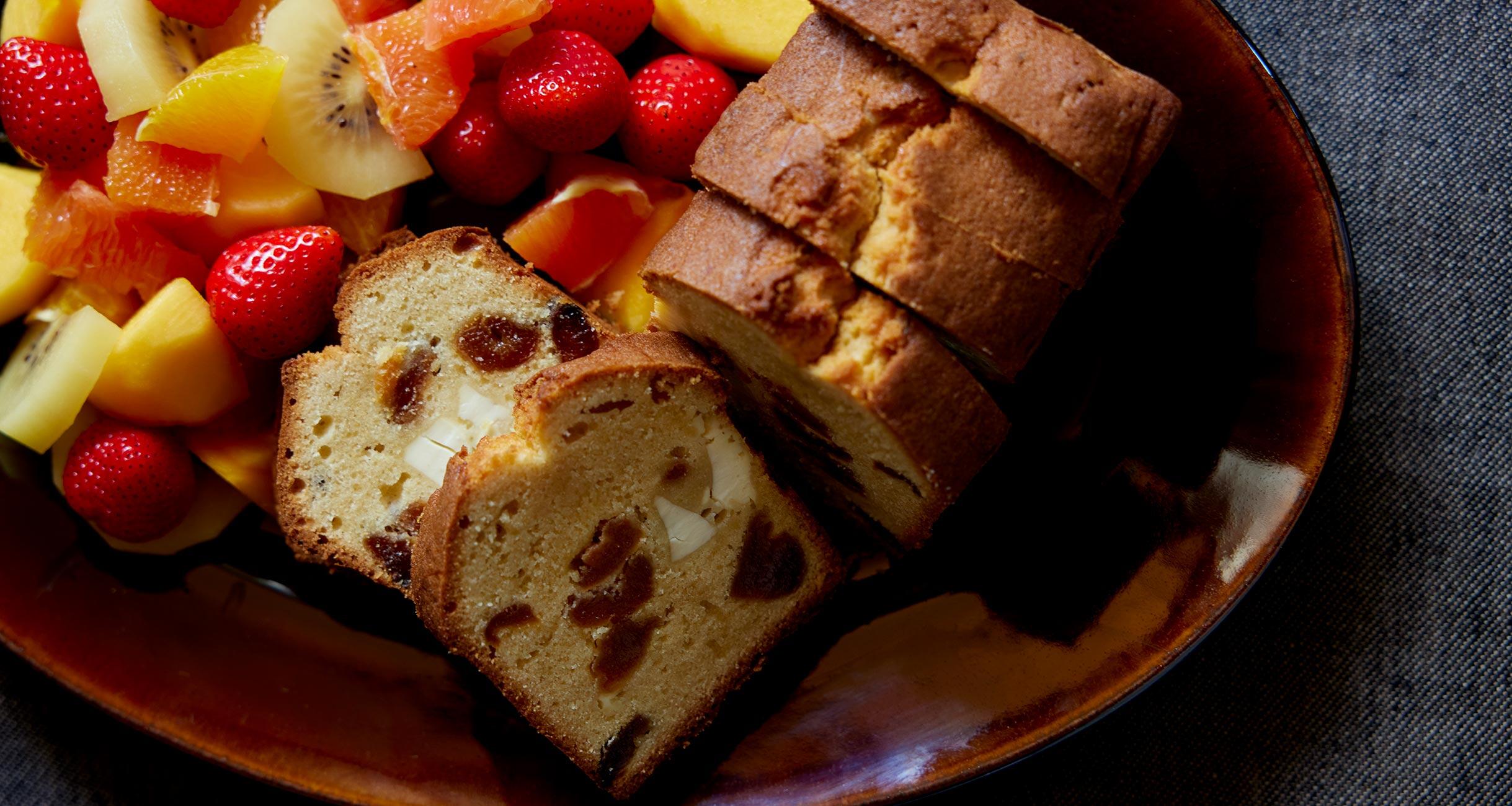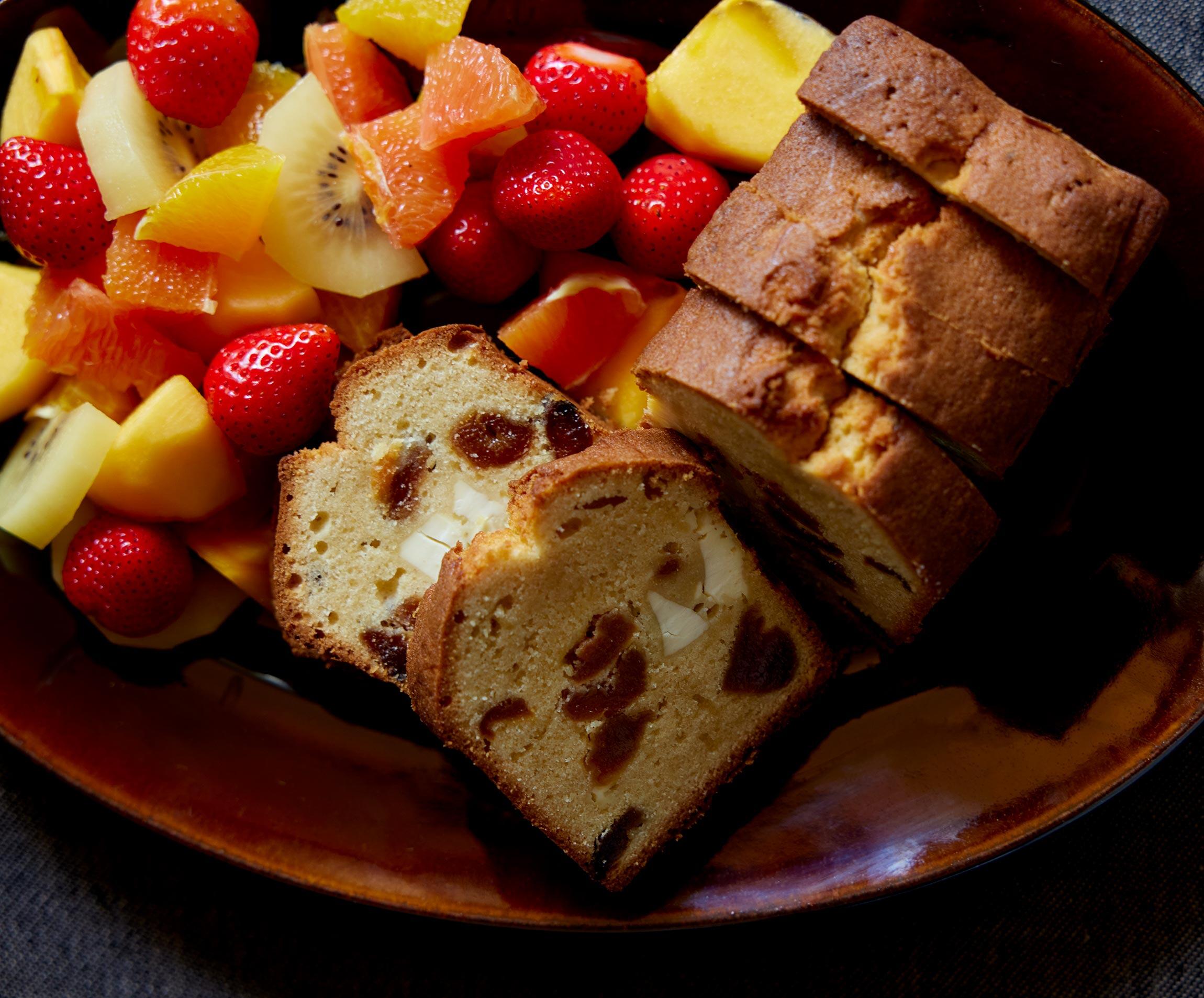 型からはずし、ケーキクーラーにのせて冷ます。切り分けて器に盛り、食べやすい大きさに切って混ぜ合わせたフルーツを添える。