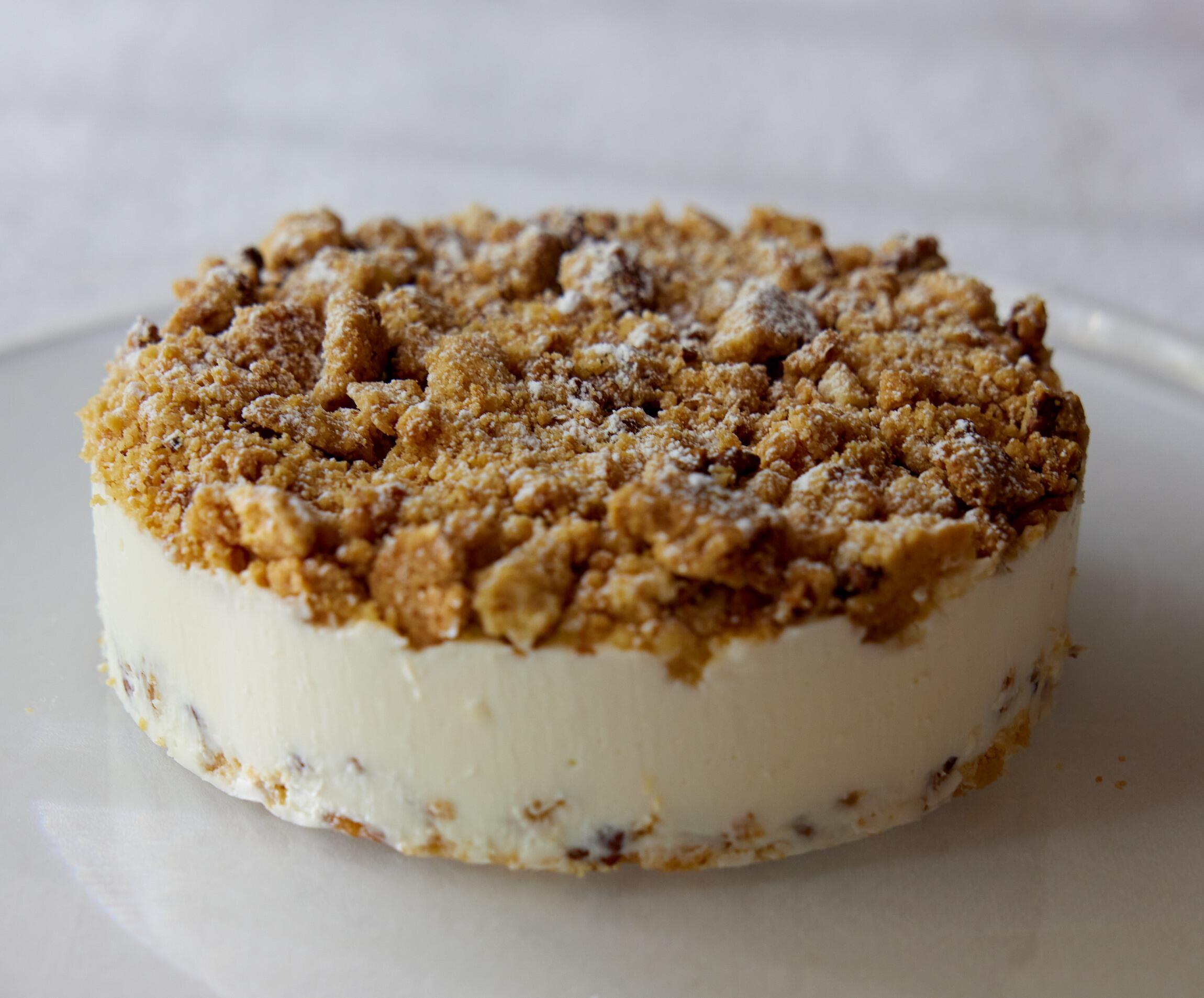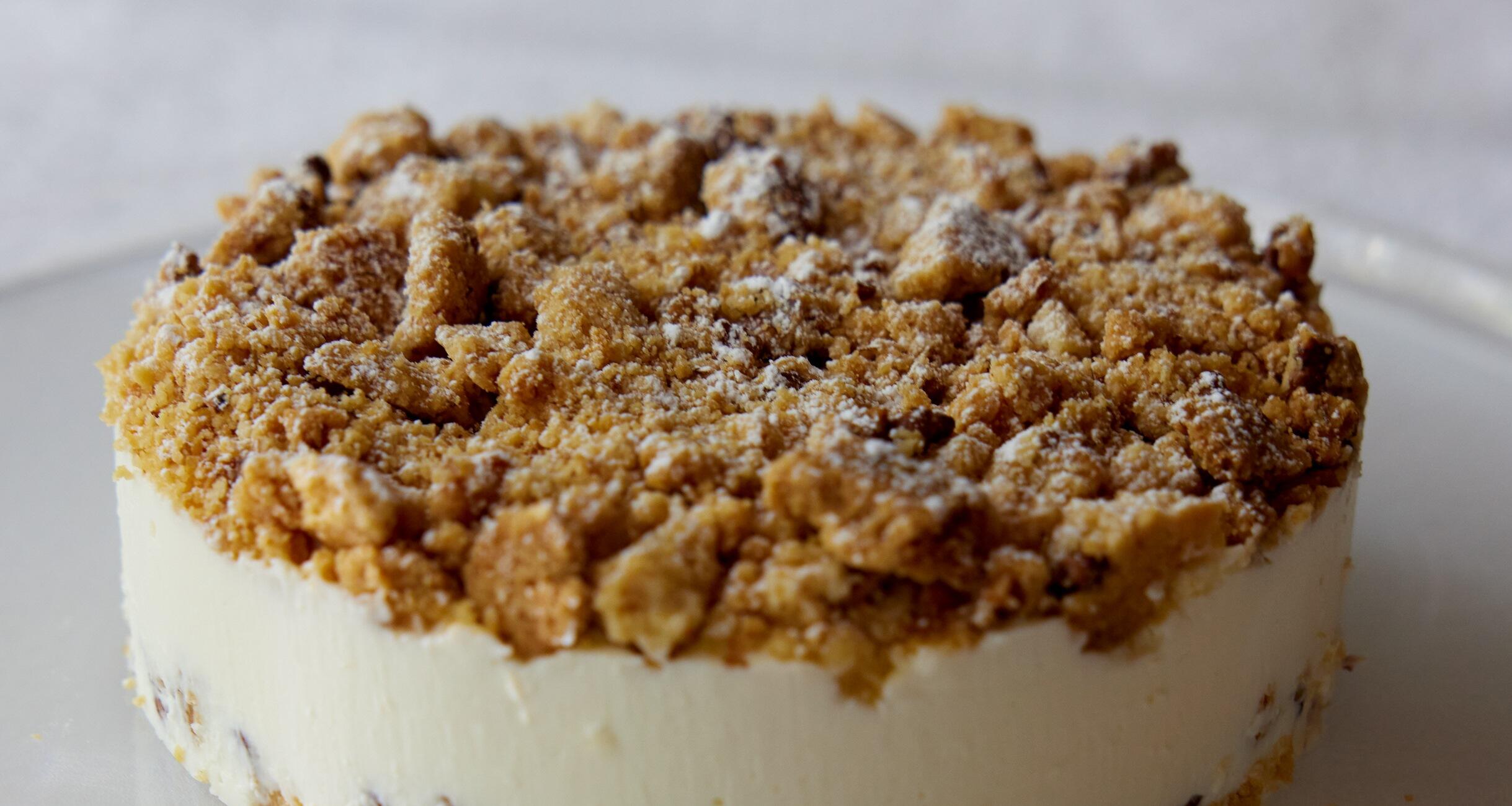 ざくざくのクランブルでサンドした、食感も楽しいレアチーズケーキです。くるみの香ばしさがアクセント。お茶の時間はもちろん、お酒と合わせても素敵な菓子レシピを、菓子研究家の田中博子さんに教えてもらいました。