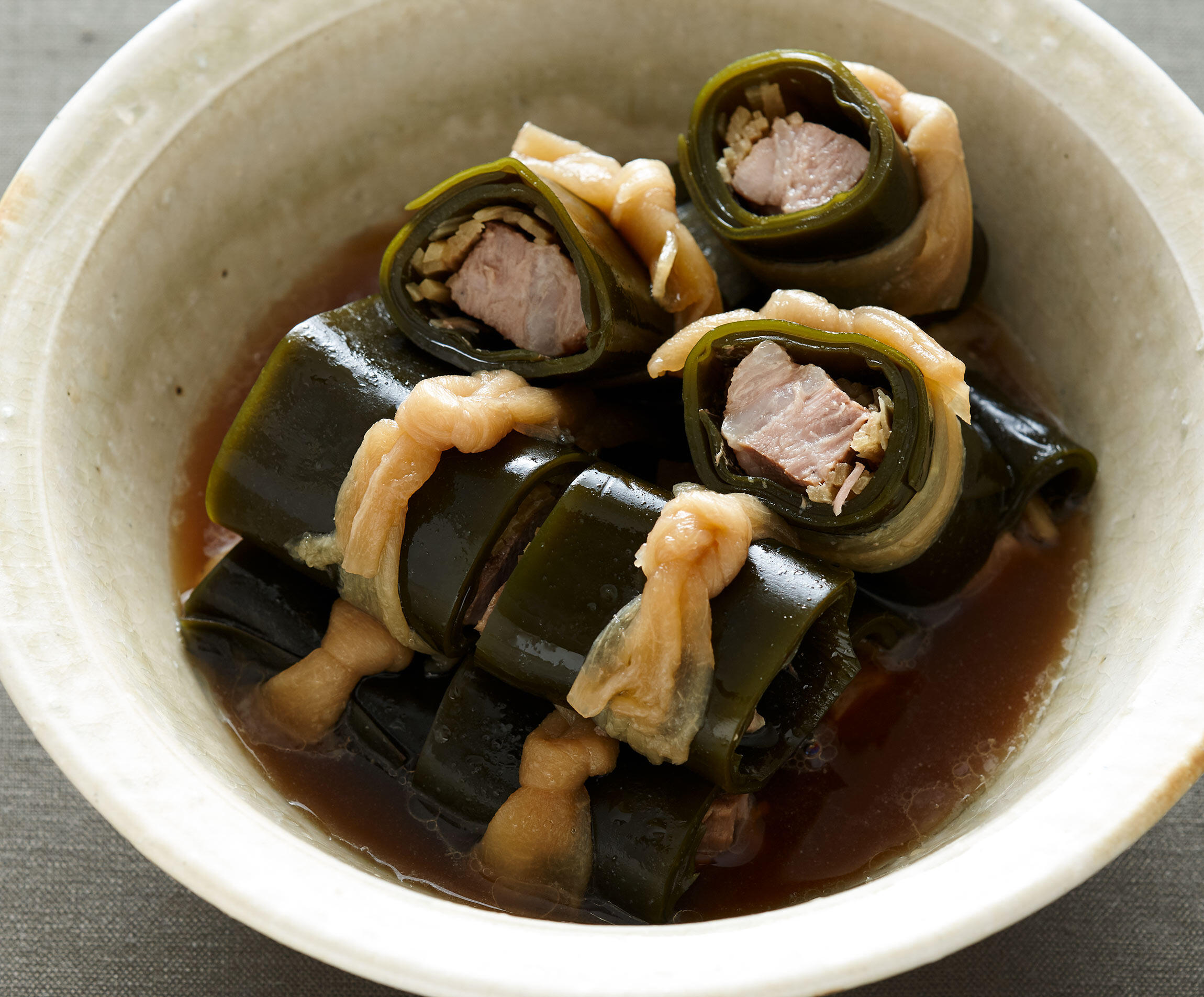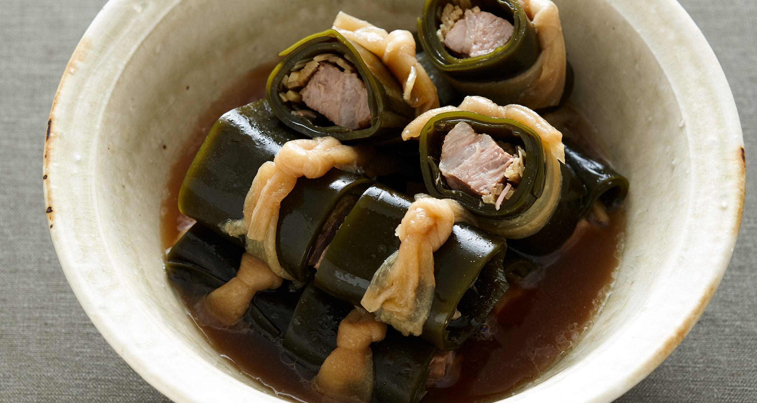 棒状に切った豚肉を昆布で巻いて、さっぱりとした味わいの酢煮に仕上げます。昆布は肉厚の日高昆布を使うことと、生姜はたっぷり入れることがおいしく仕上げるためのポイント。豚肩ロースのブロック肉を使った豪快な料理を料理研究家の大庭英子さんに教えてもらいました。